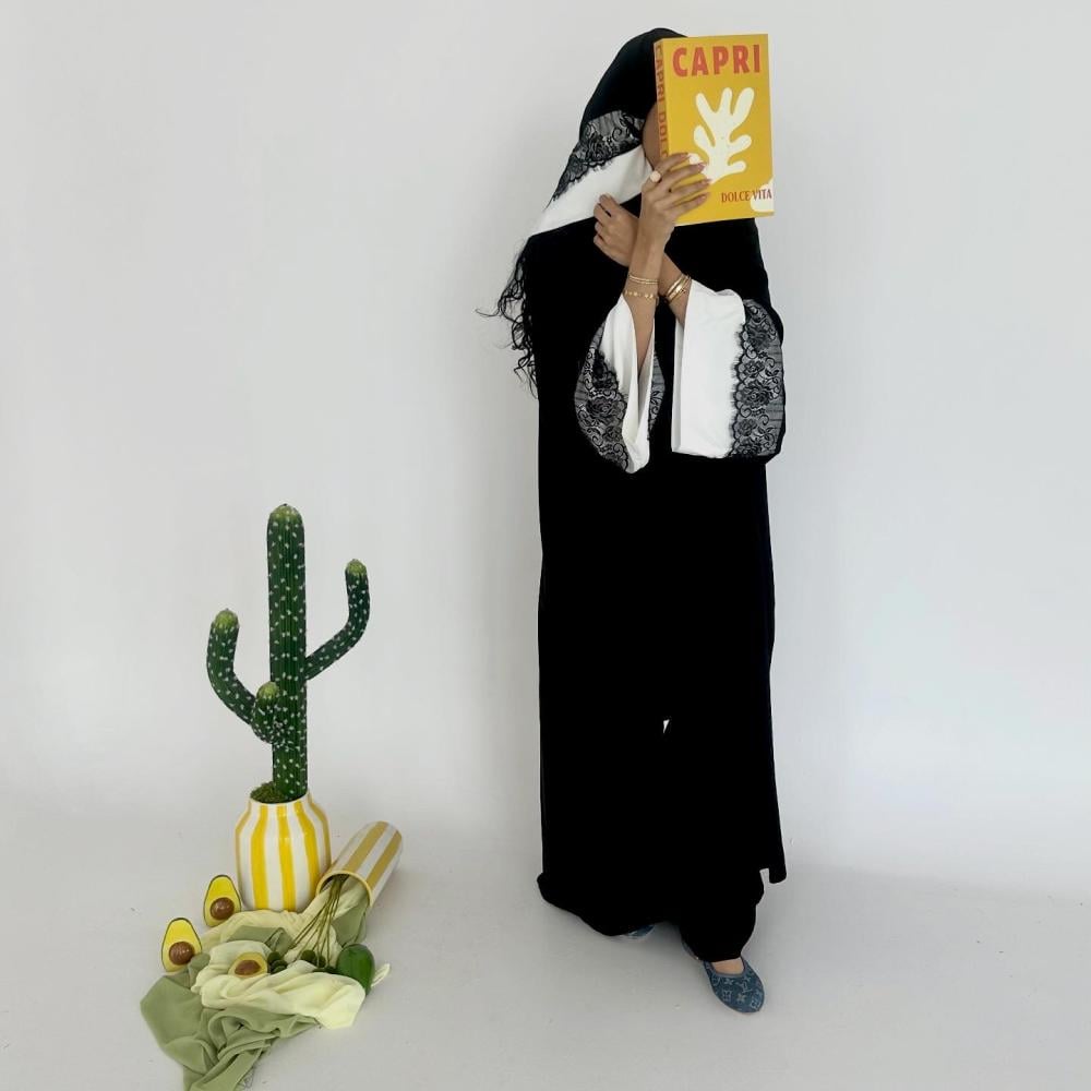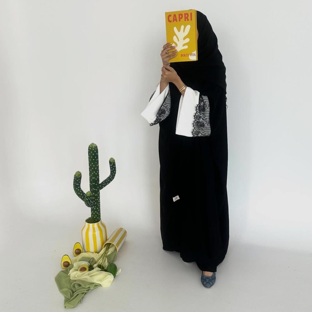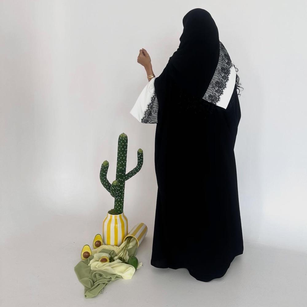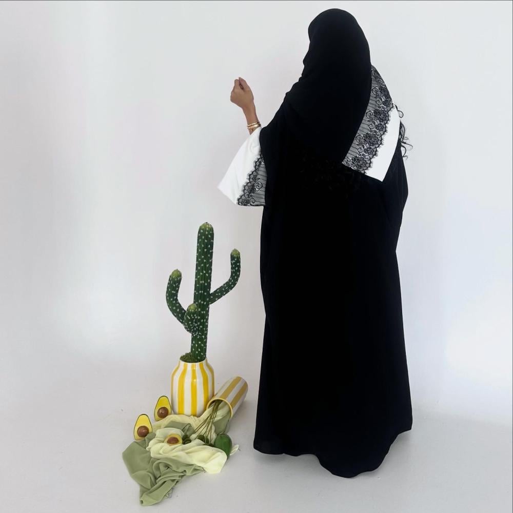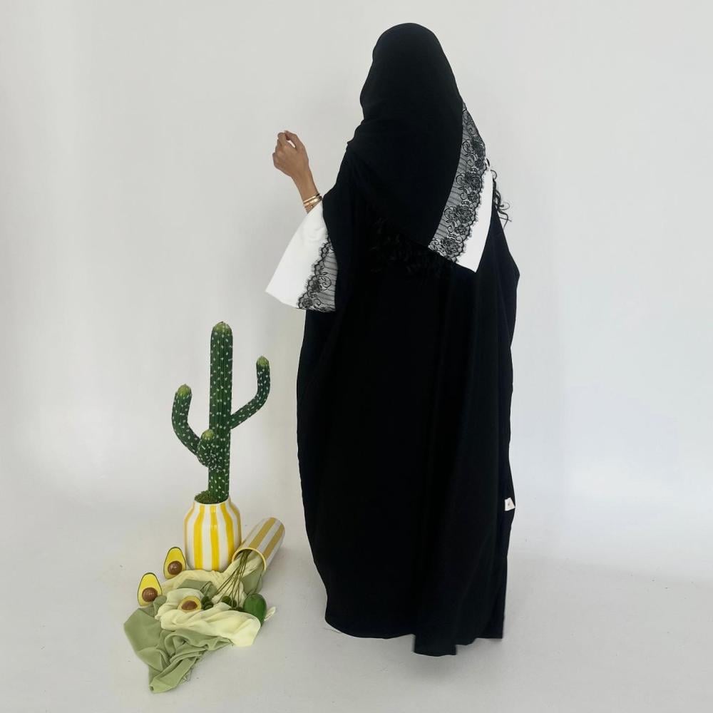 كريب ملكي كوري اسود | الكم واسع تفته اوف وايت مع دانتيل | الطرحه شيفون اسود بتفته ودانتيل
