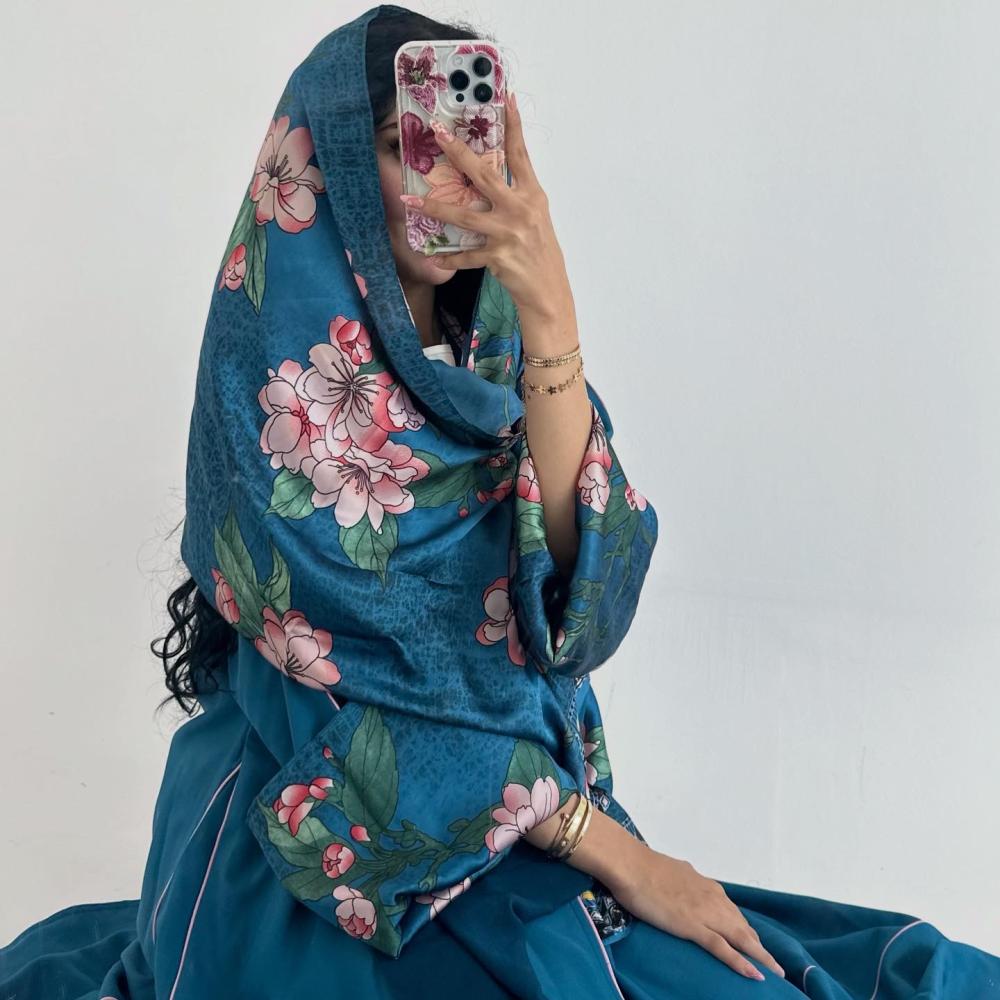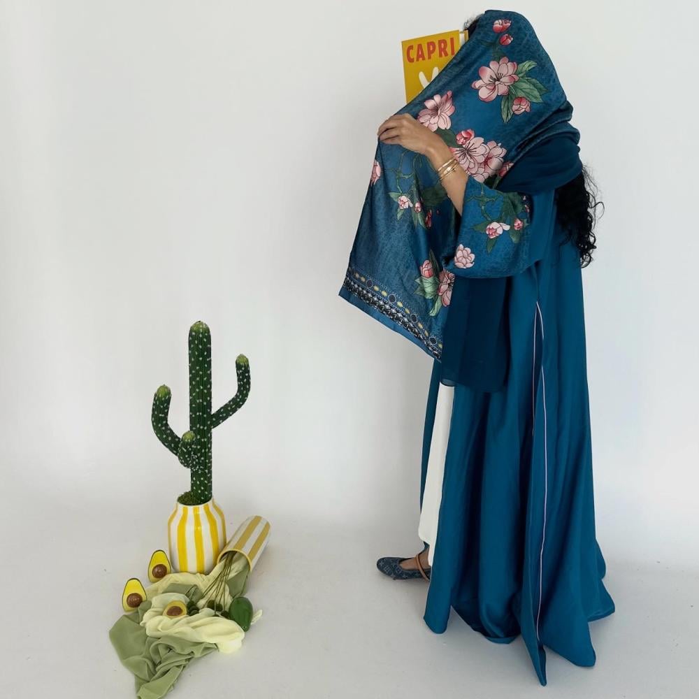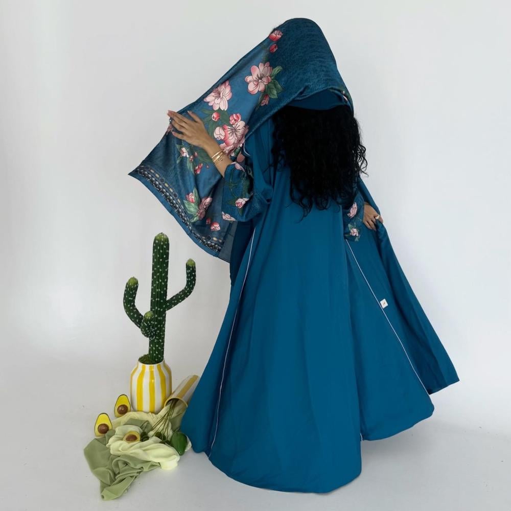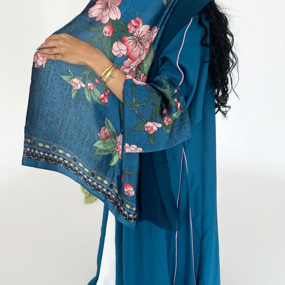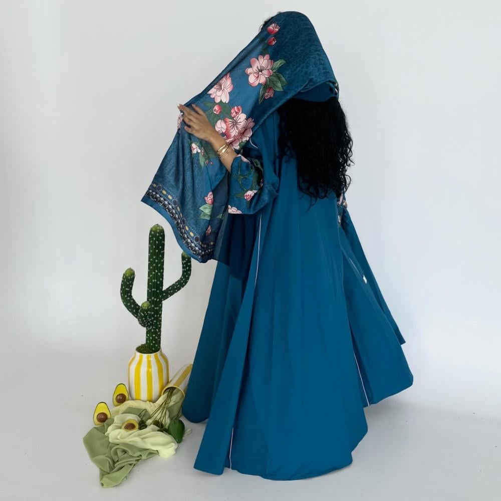 كريب باربي تركواز | الكم سفطه حرير مشجر " غير مثبته " | قيطان كامل العبايه، قيطان كسرات | الطرحه نص شيفون ساده ونص حرير مشجر