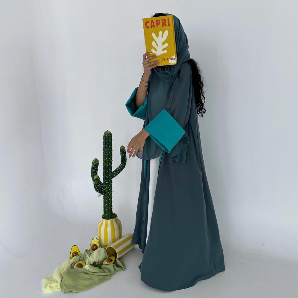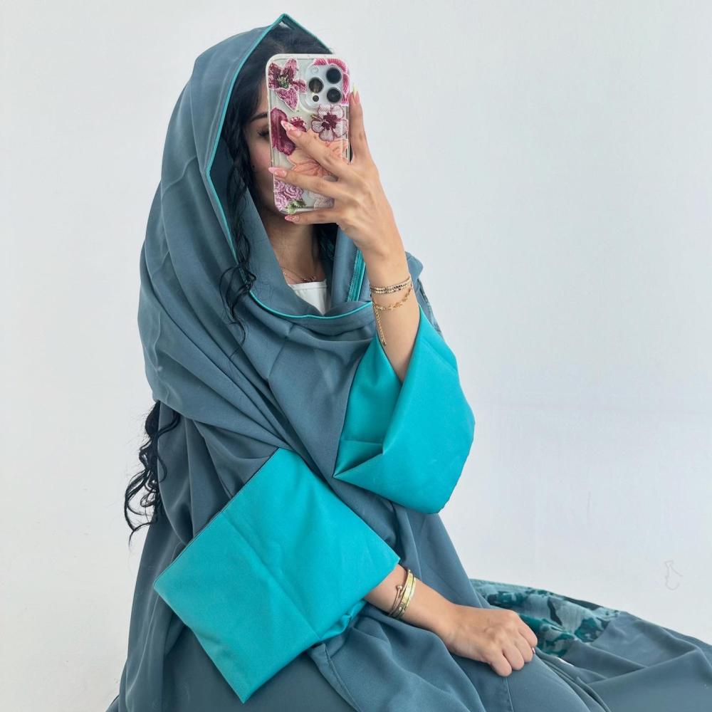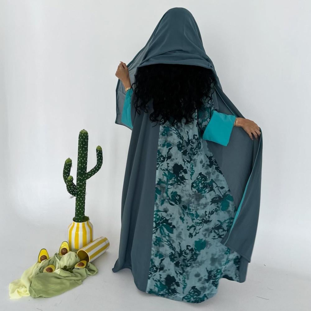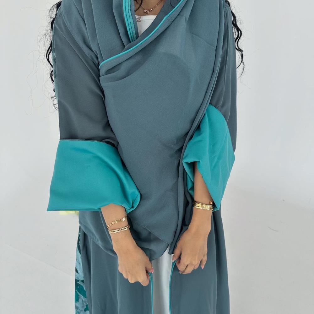 كريب سراميك | الكم سفطه " غير مثبته" كتان تايلندي | من الخلف قماش شيفون مموج | قيطان من الامام | الطرحه شيفون ساده بقيطان