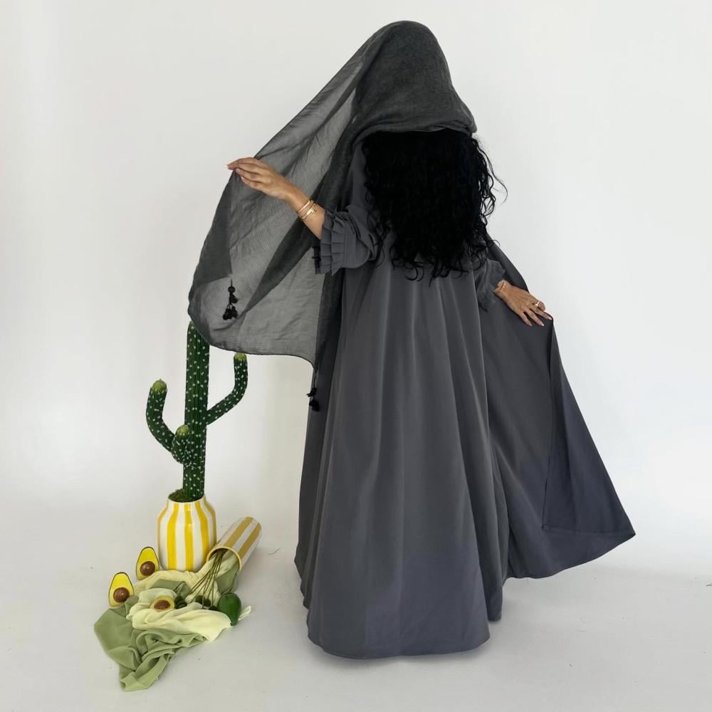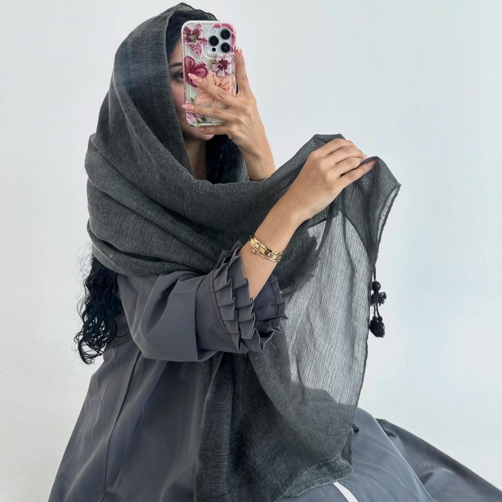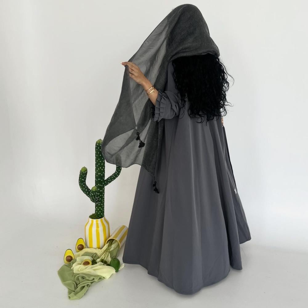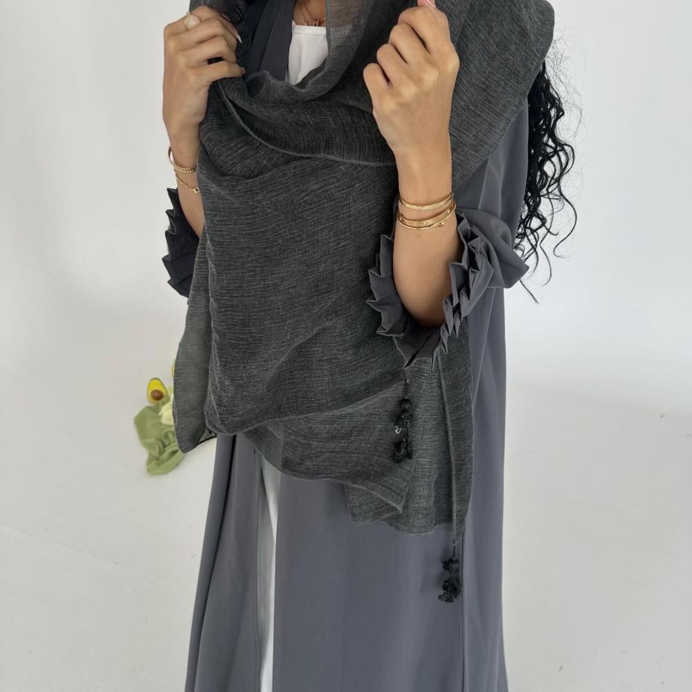 كتان رمادي تايلندي | الكم مكسر طبقتين صغيره | الطرحه لينن خفيف بهدب