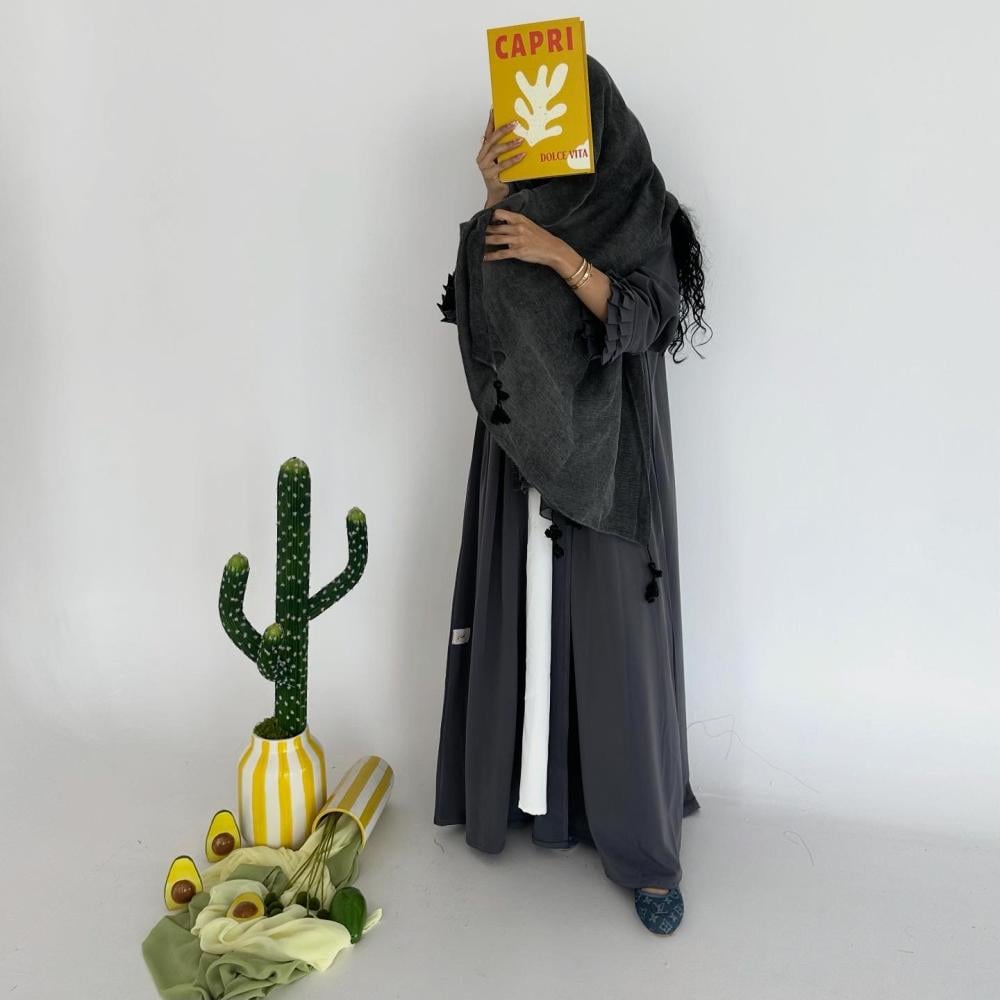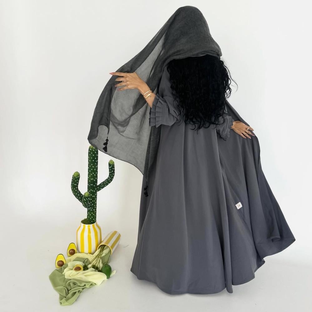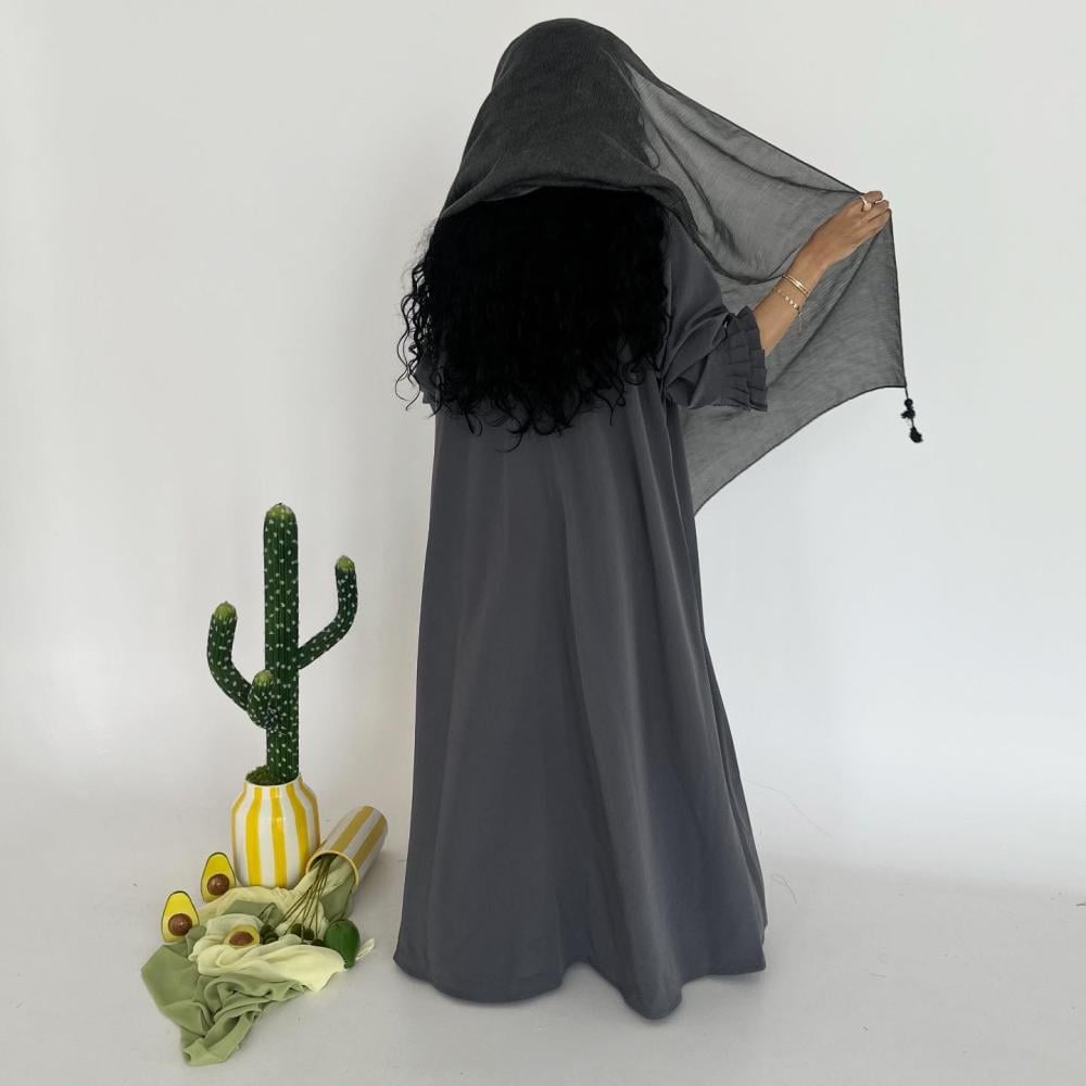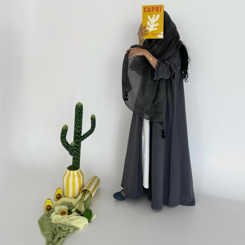 كتان رمادي تايلندي | الكم مكسر طبقتين صغيره | الطرحه لينن خفيف بهدب