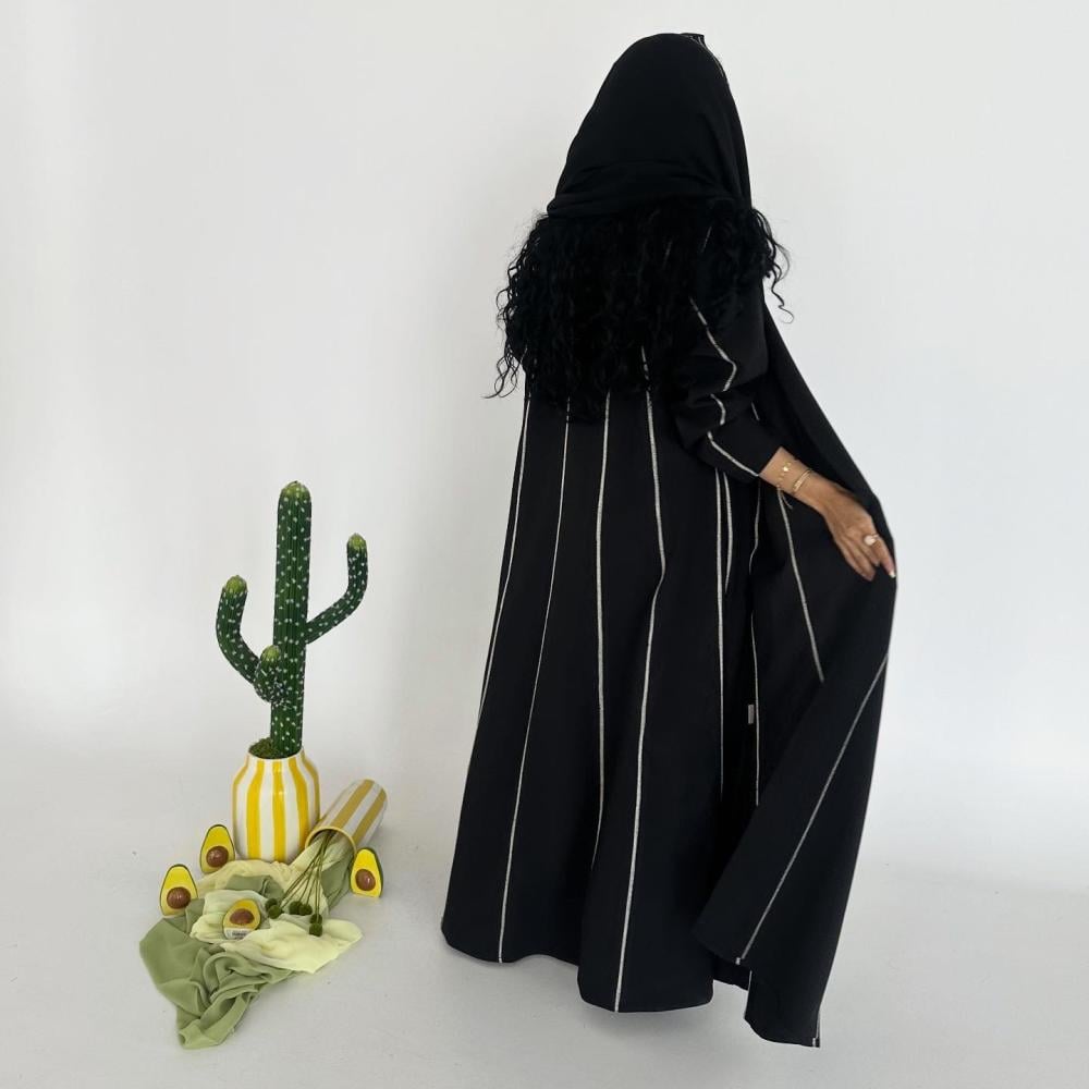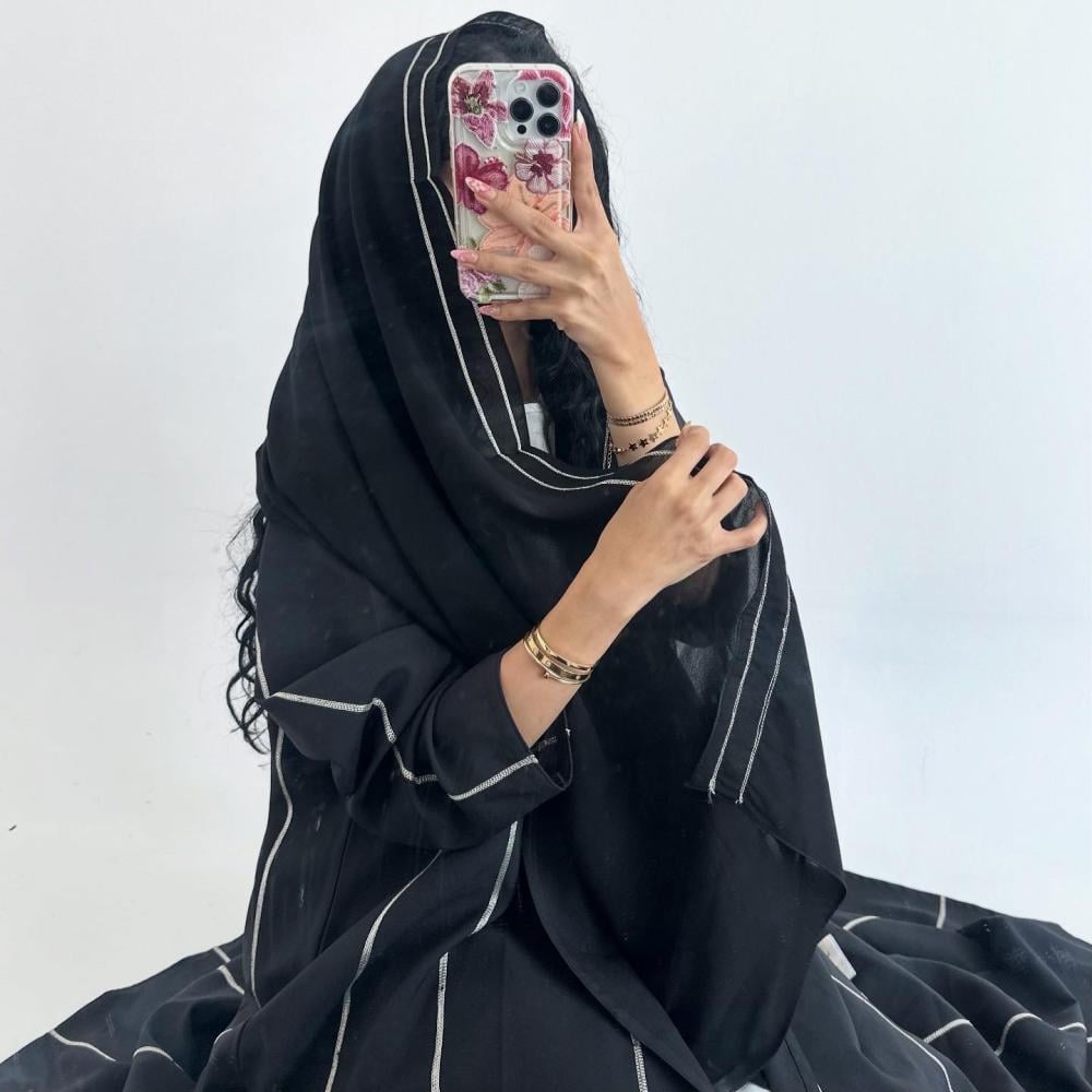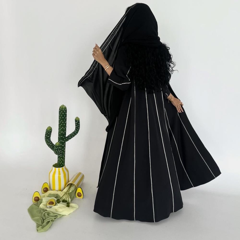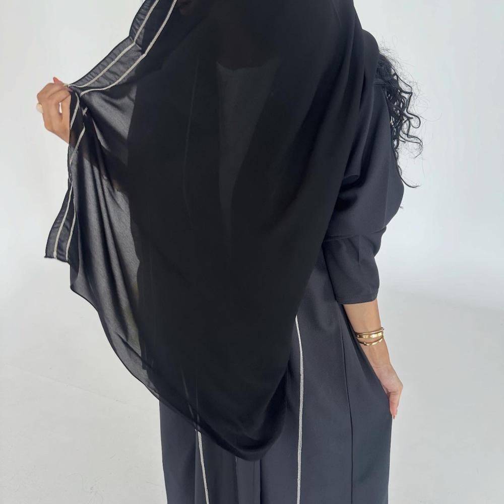 كتان تايواني اسود | قيطان تطريز كامل العبايه بكل الجهات ( ابيض) | الطرحه شيفون بتطريز خيطين