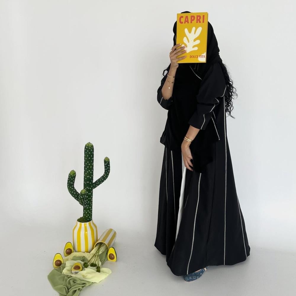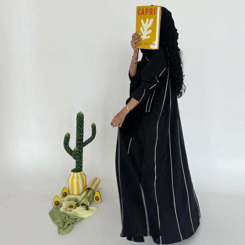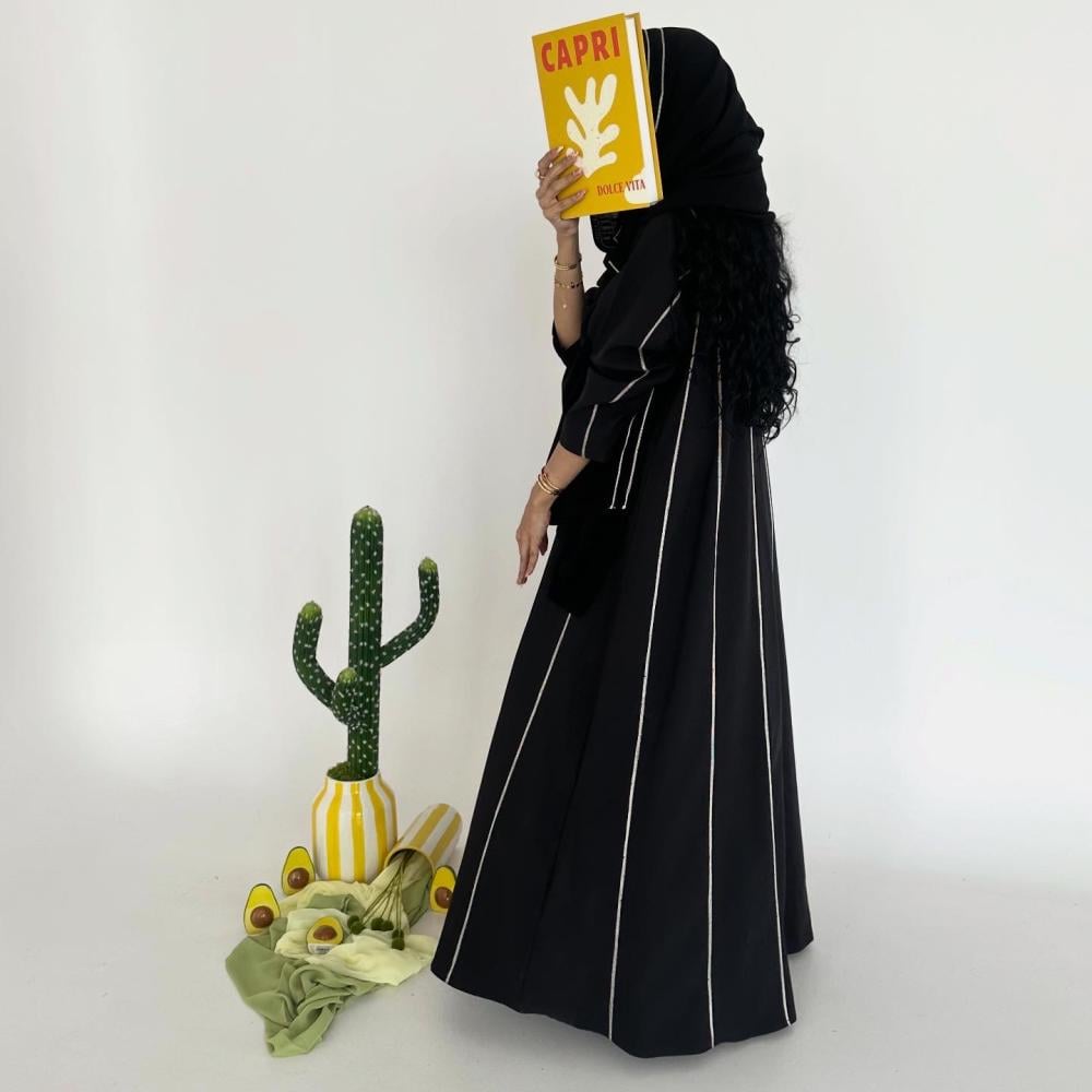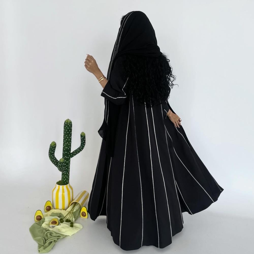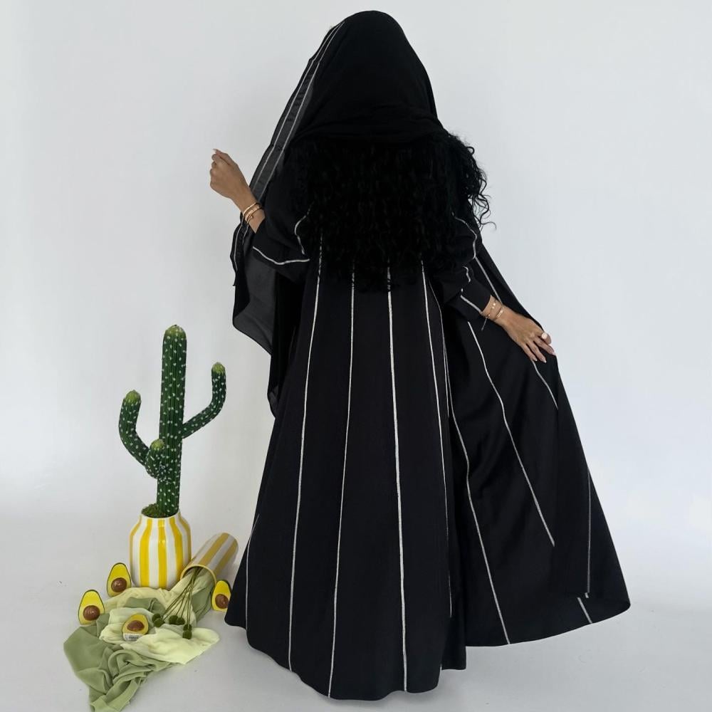 كتان تايواني اسود | قيطان تطريز كامل العبايه بكل الجهات ( ابيض) | الطرحه شيفون بتطريز خيطين