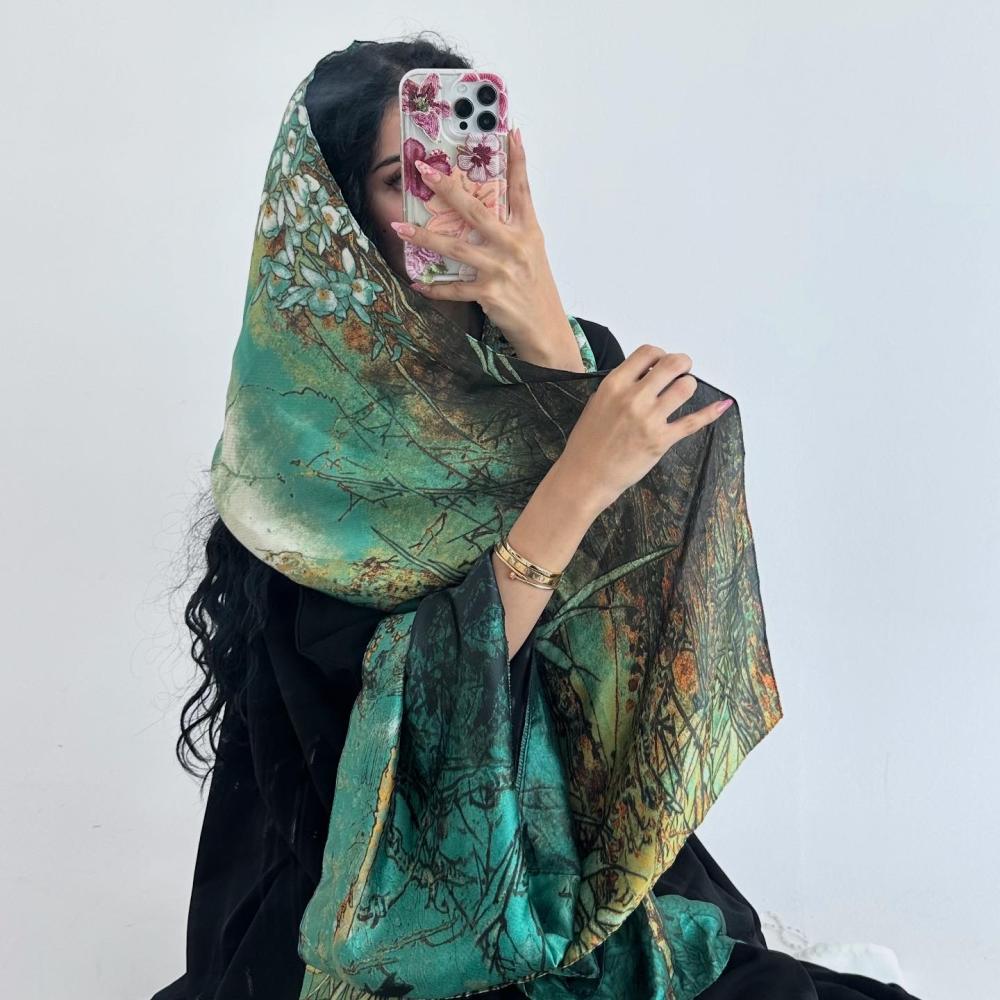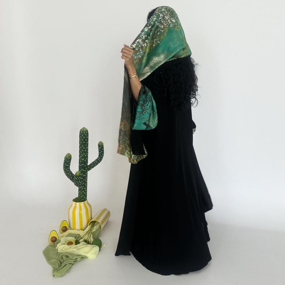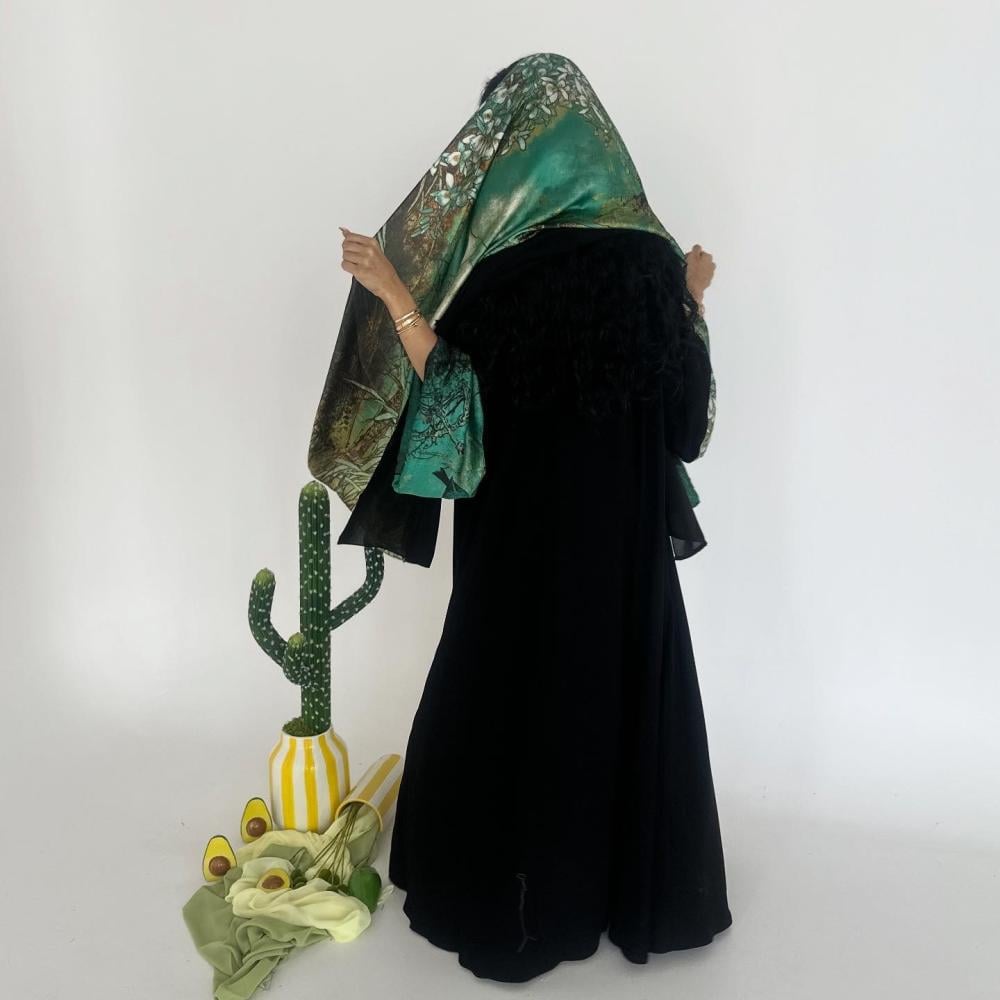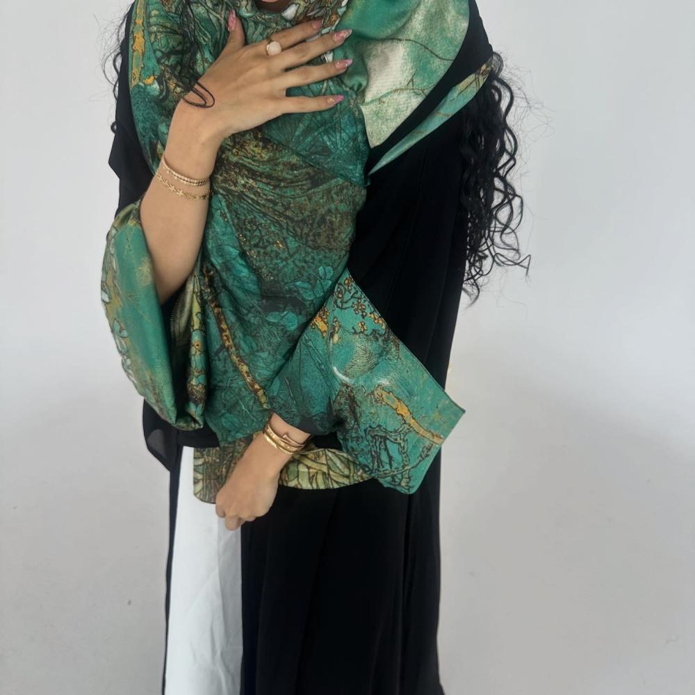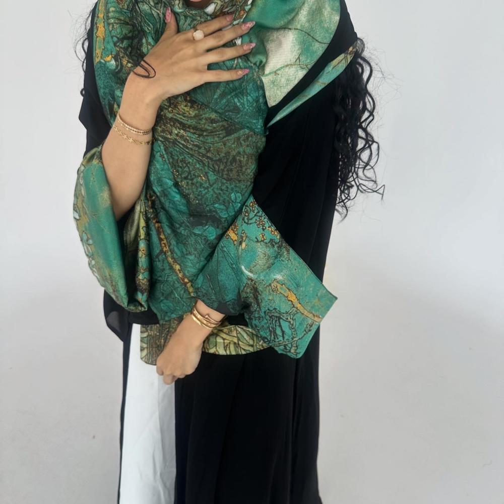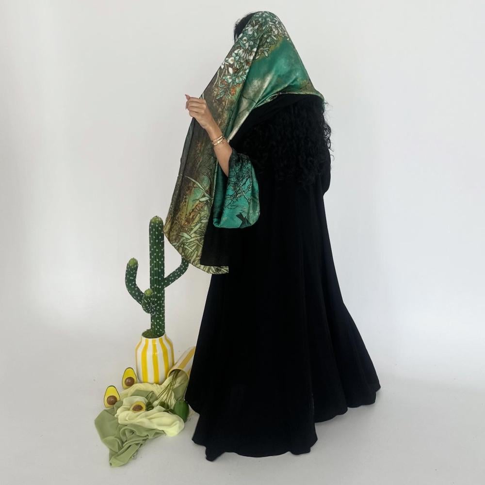 كريب ملكي كوري اسود | الكم سفطه حرير مشجر " غير مثبته " | الطرحه نص شيفون ونص حرير مشجر