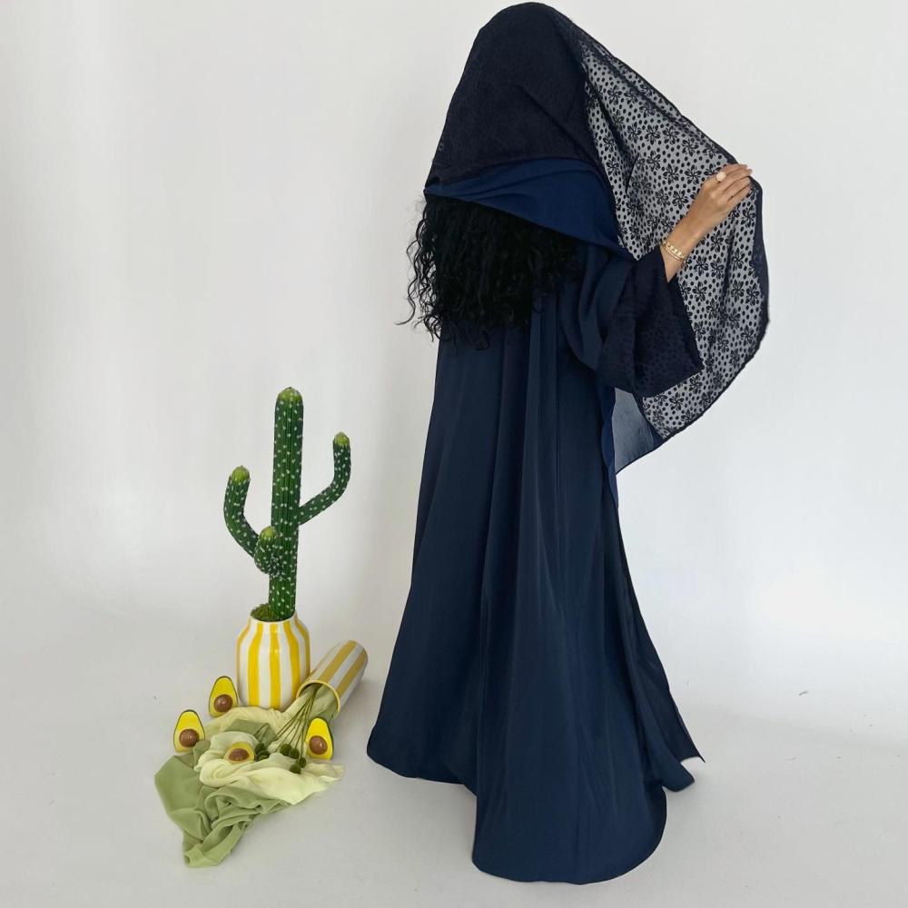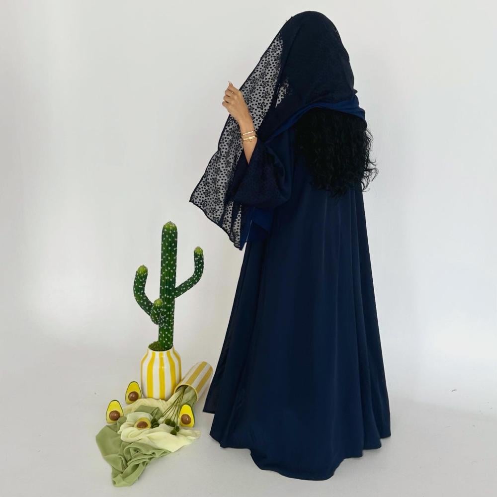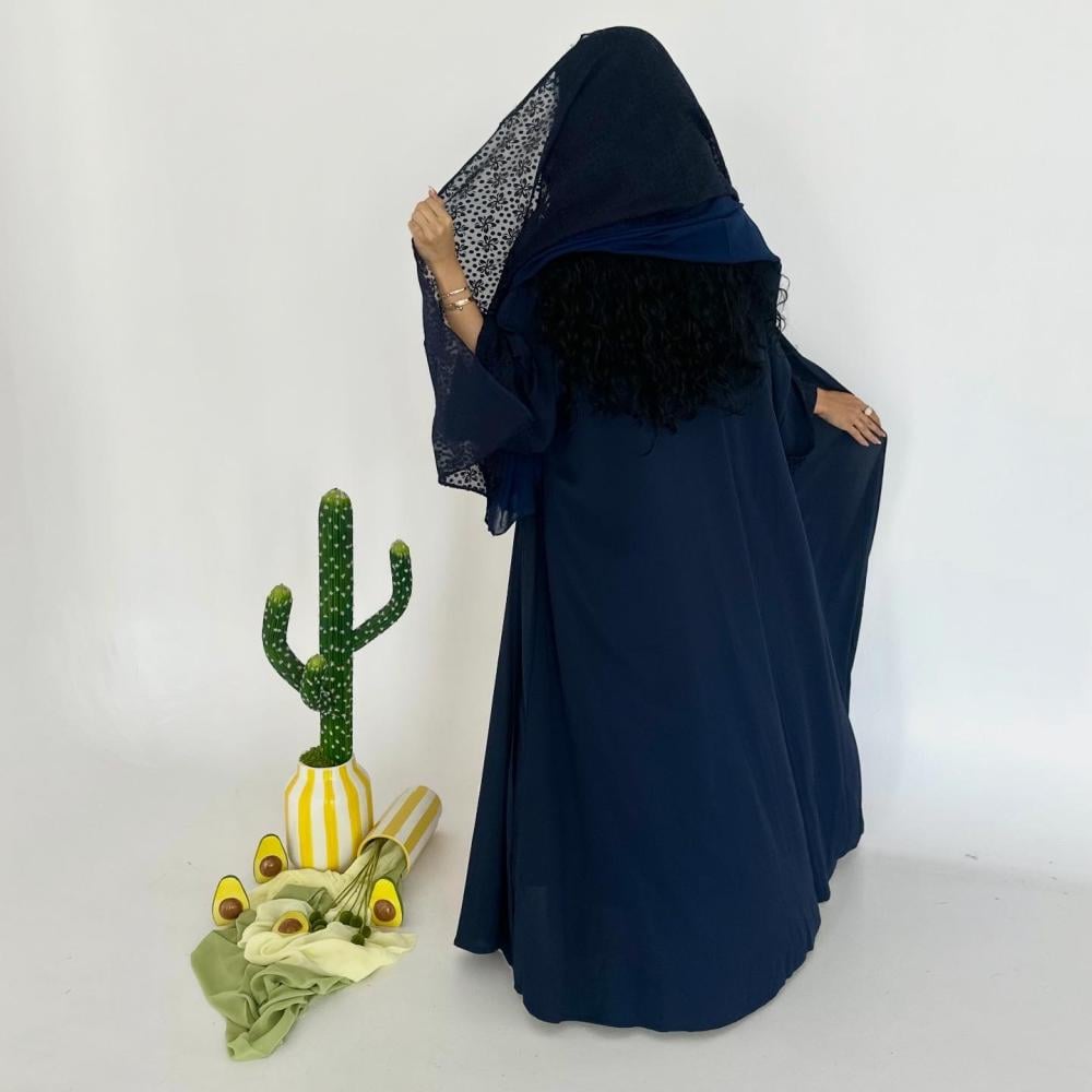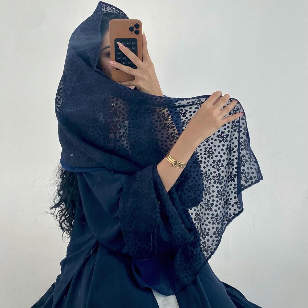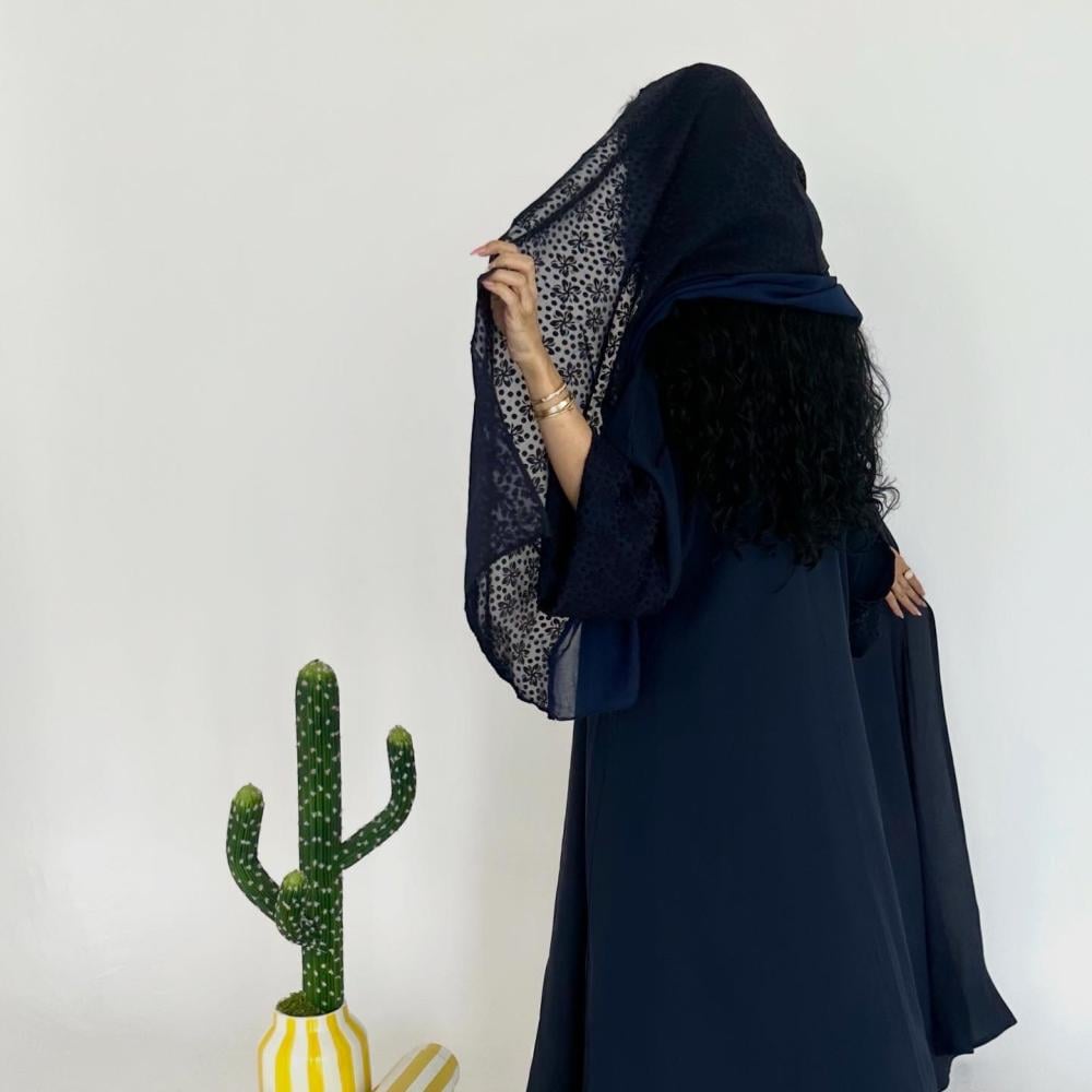 كريب كحلي خفيف طايح | الكم سفطه شيفون مشجر " غير مثبته " | الطرحه نص شيفون ساده ونص شيفون مشجر