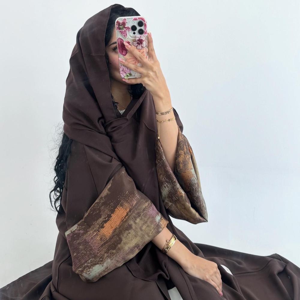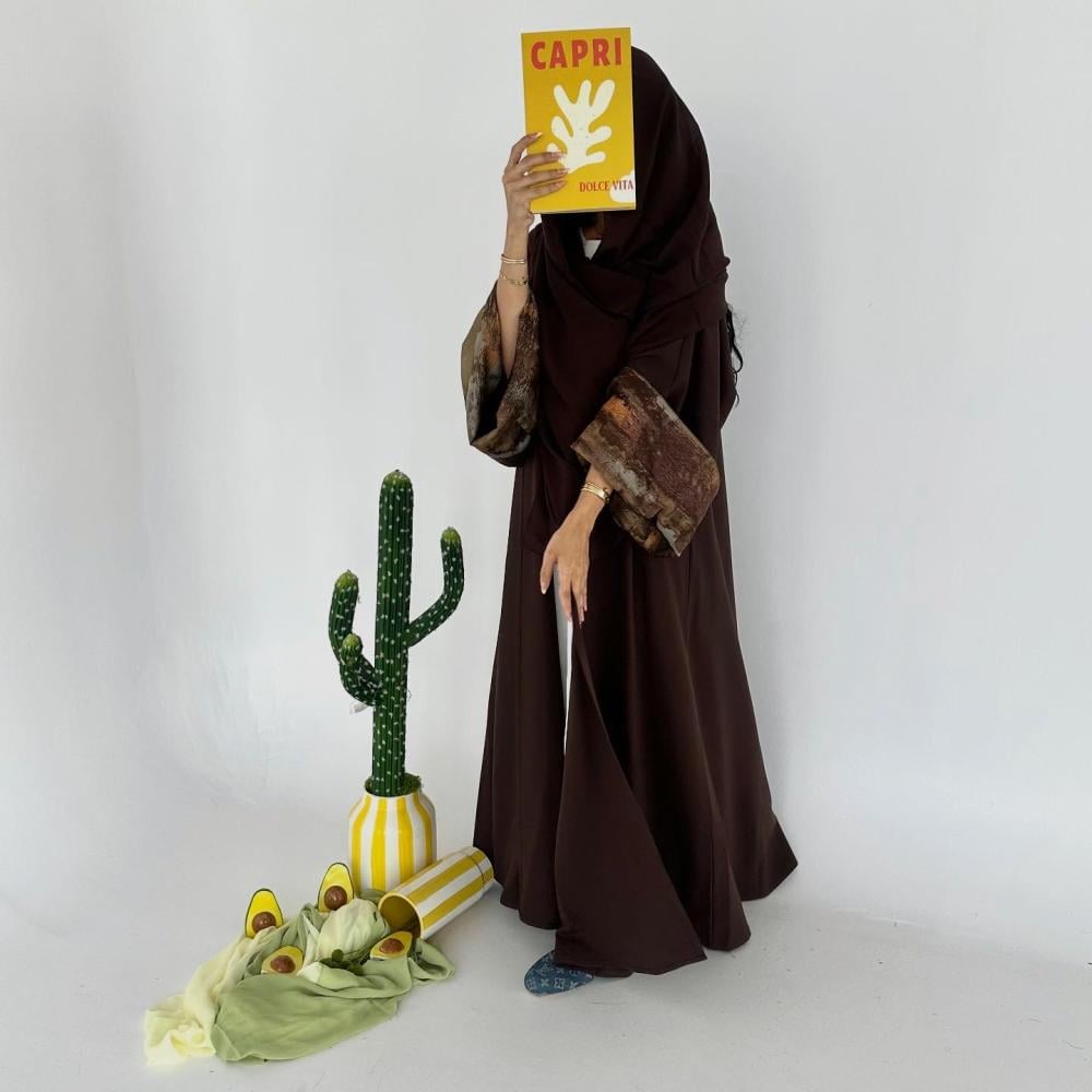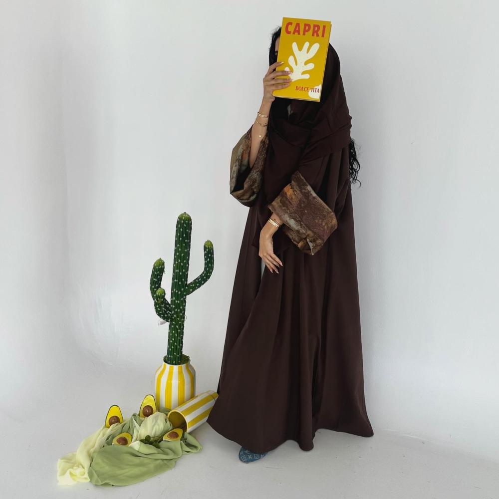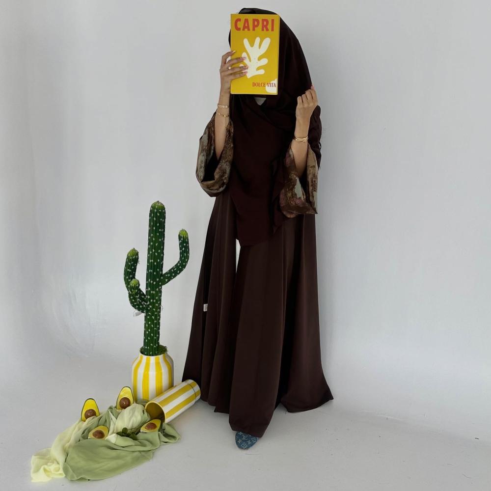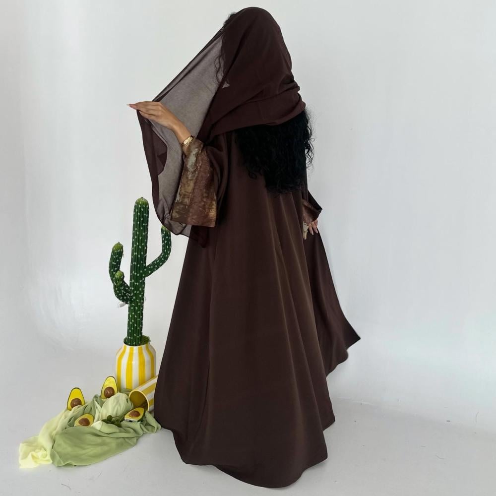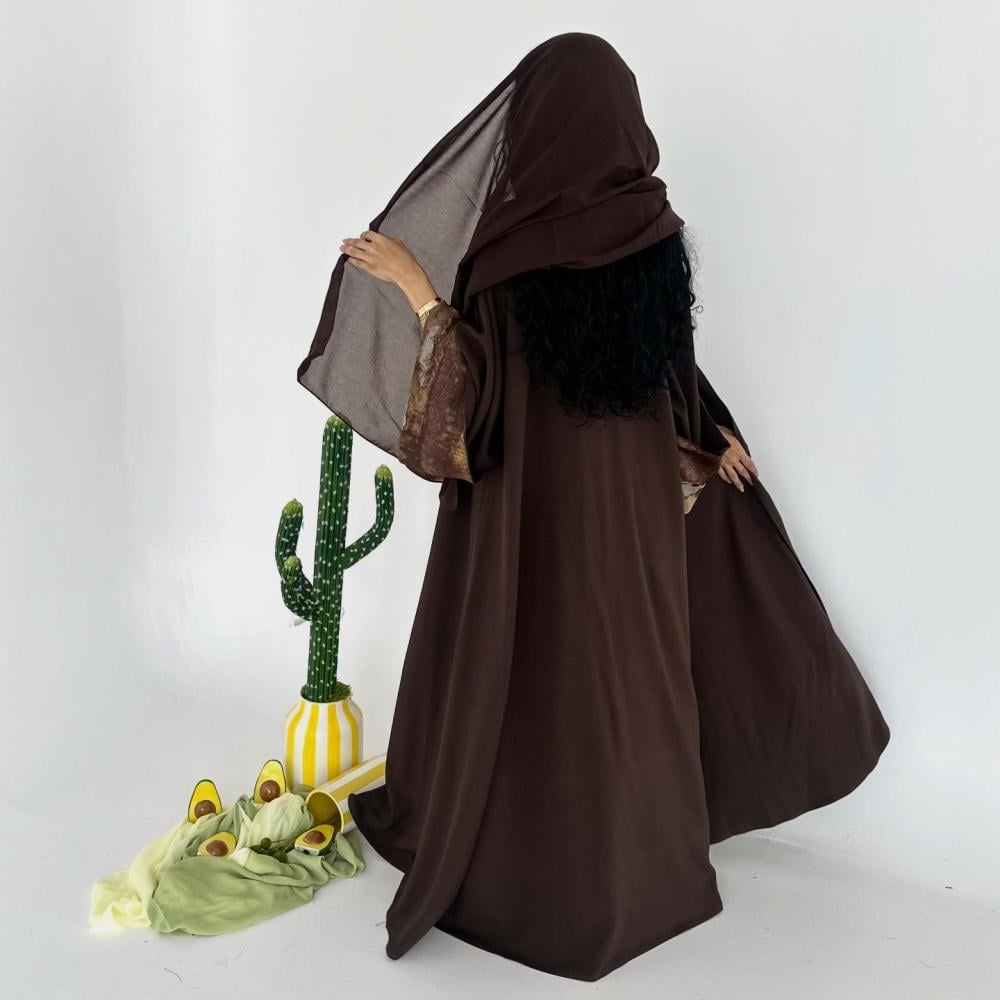 كتان تايواني بني | الكم سفطه حرير مموج " غير مثبته " | الطرحه شيفون ساده
