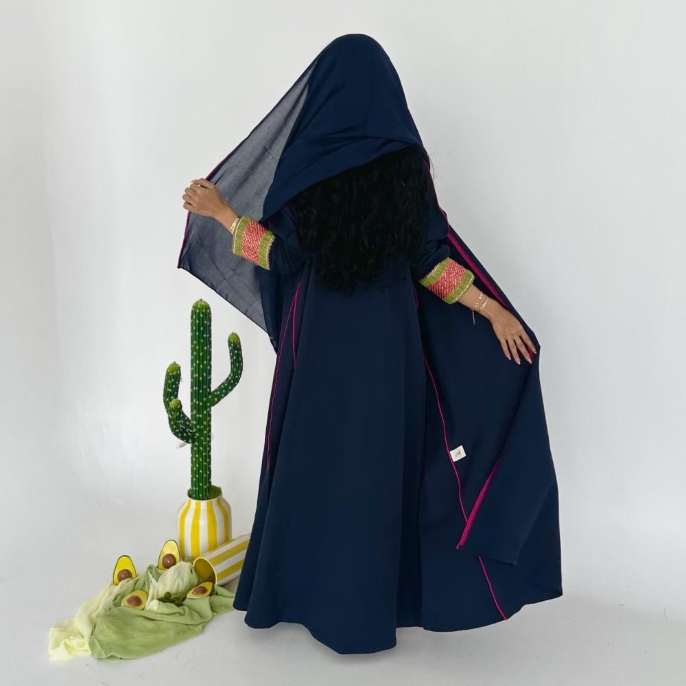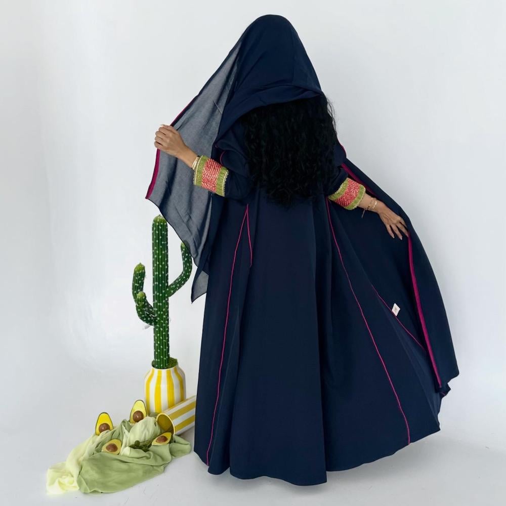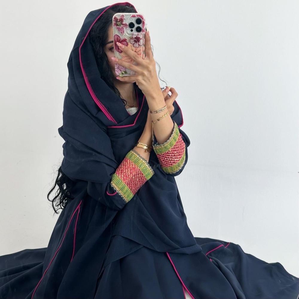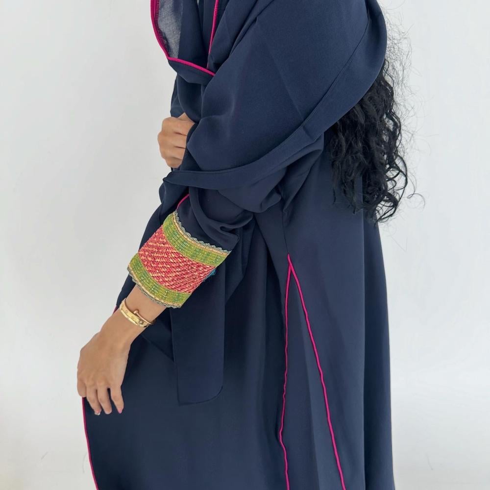كريب باربي كحلي | الكم ماسك كلفه هنديه مطرزه واقفه | قيطان فوشي كسرات وكامل العبايه | الطرحه شيفون ساده بقيطان