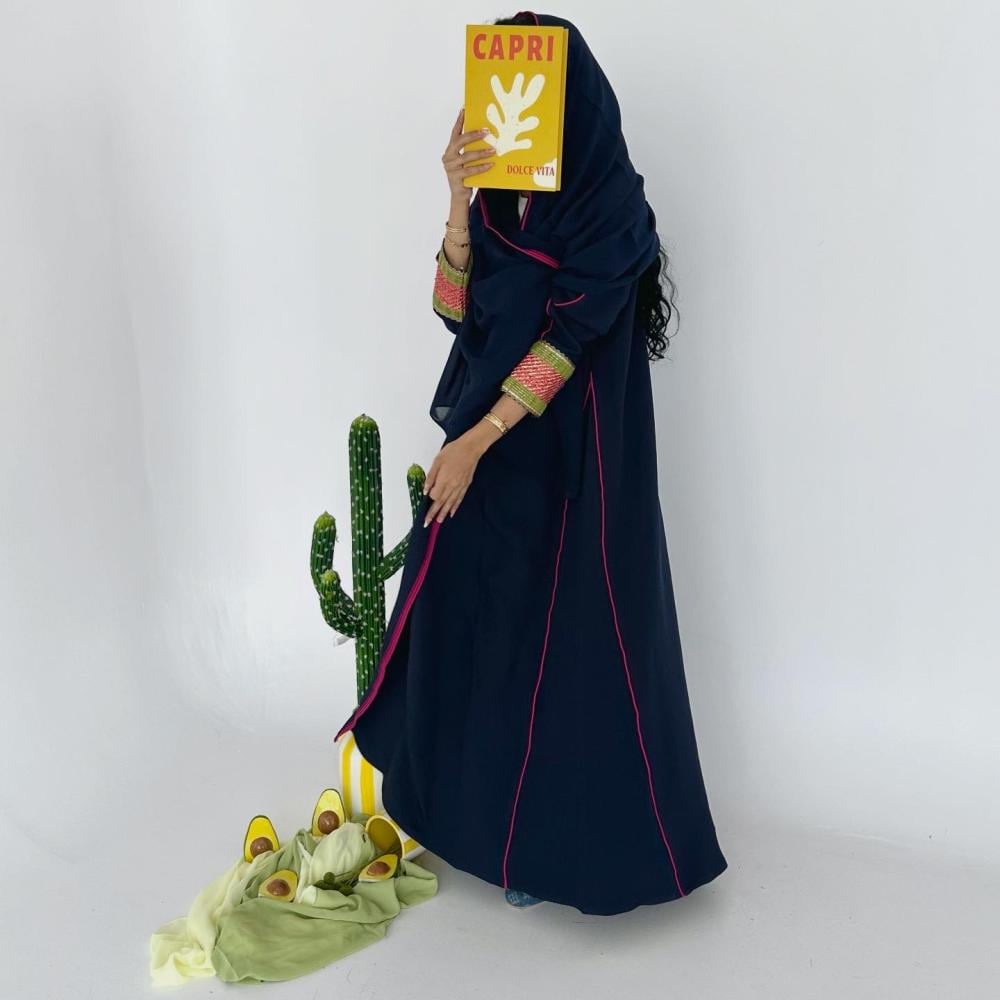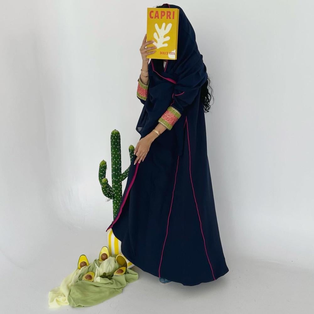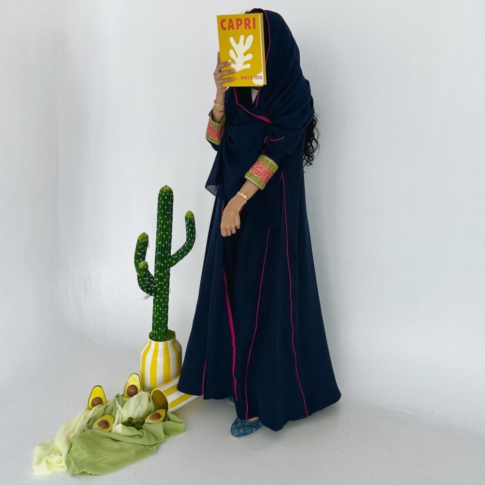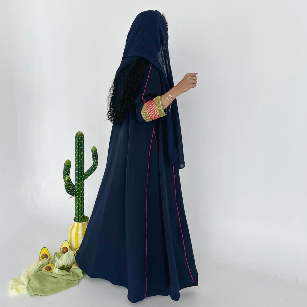 كريب باربي كحلي | الكم ماسك كلفه هنديه مطرزه واقفه | قيطان فوشي كسرات وكامل العبايه | الطرحه شيفون ساده بقيطان