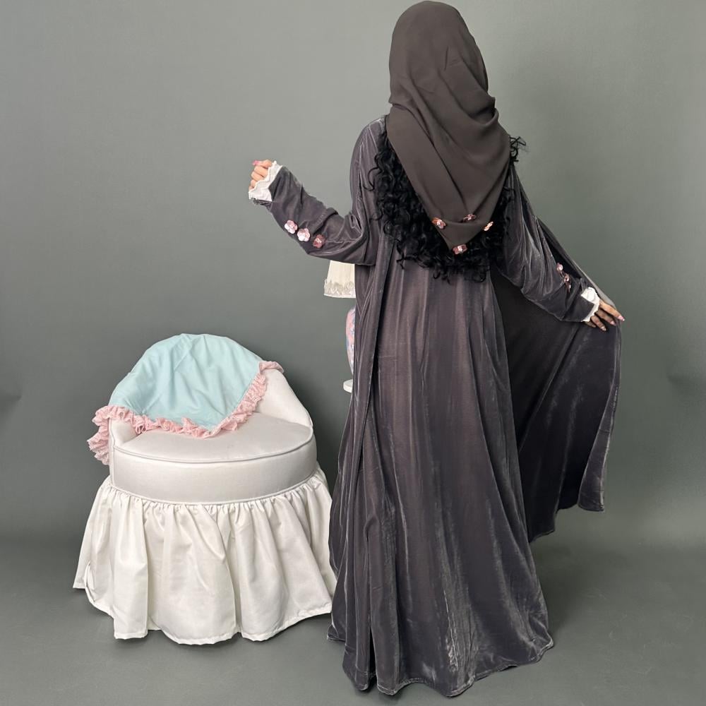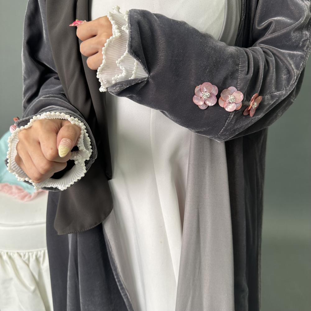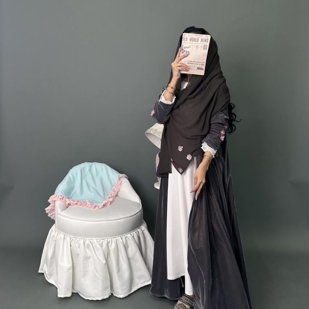مخمل كوري رمادي | الكم كلفه من الداخل باطراف لولو ، ازارير ورد | الطرحه شيفون بطرف زاويه كلفه ورد