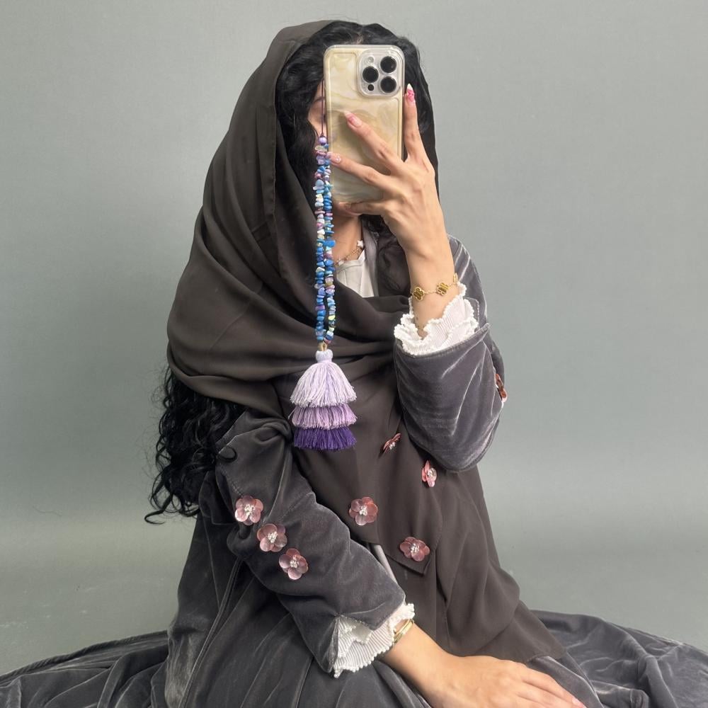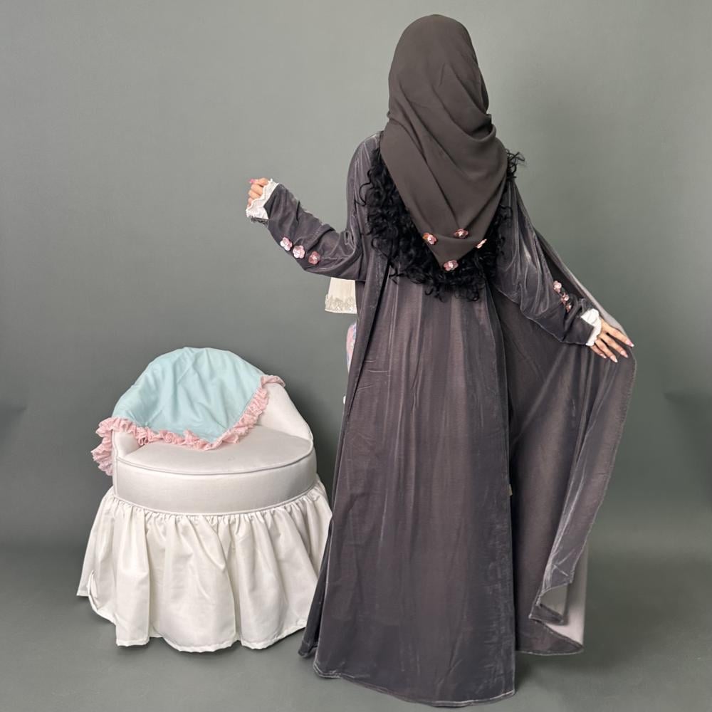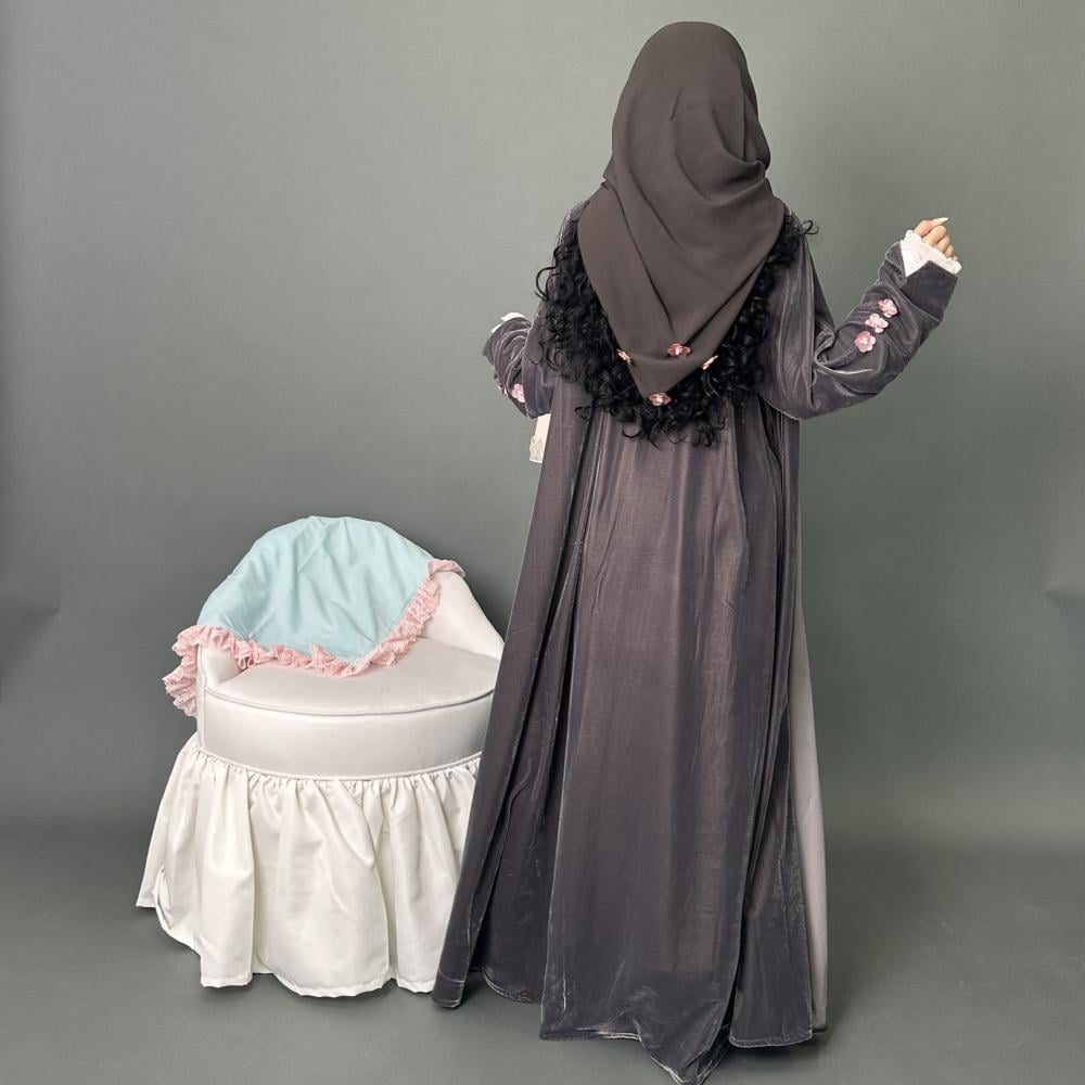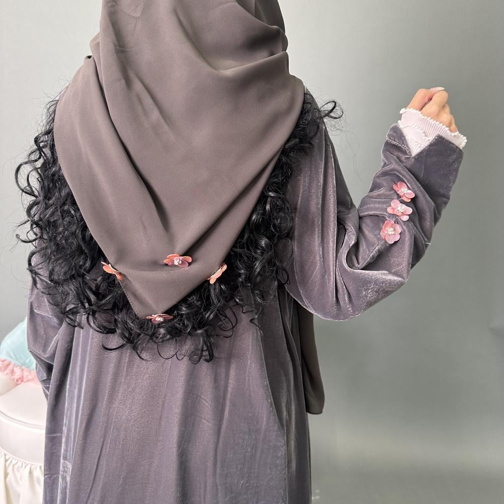 مخمل كوري رمادي | الكم كلفه من الداخل باطراف لولو ، ازارير ورد | الطرحه شيفون بطرف زاويه كلفه ورد