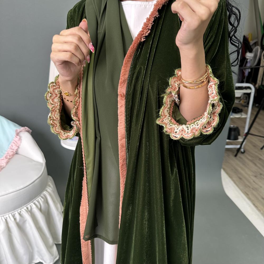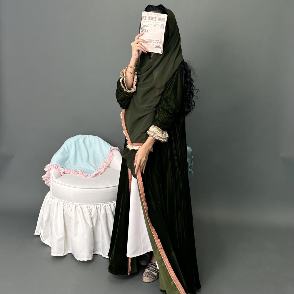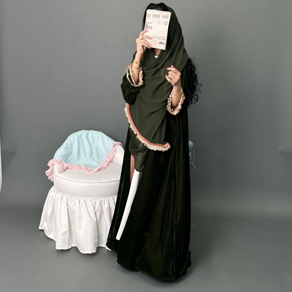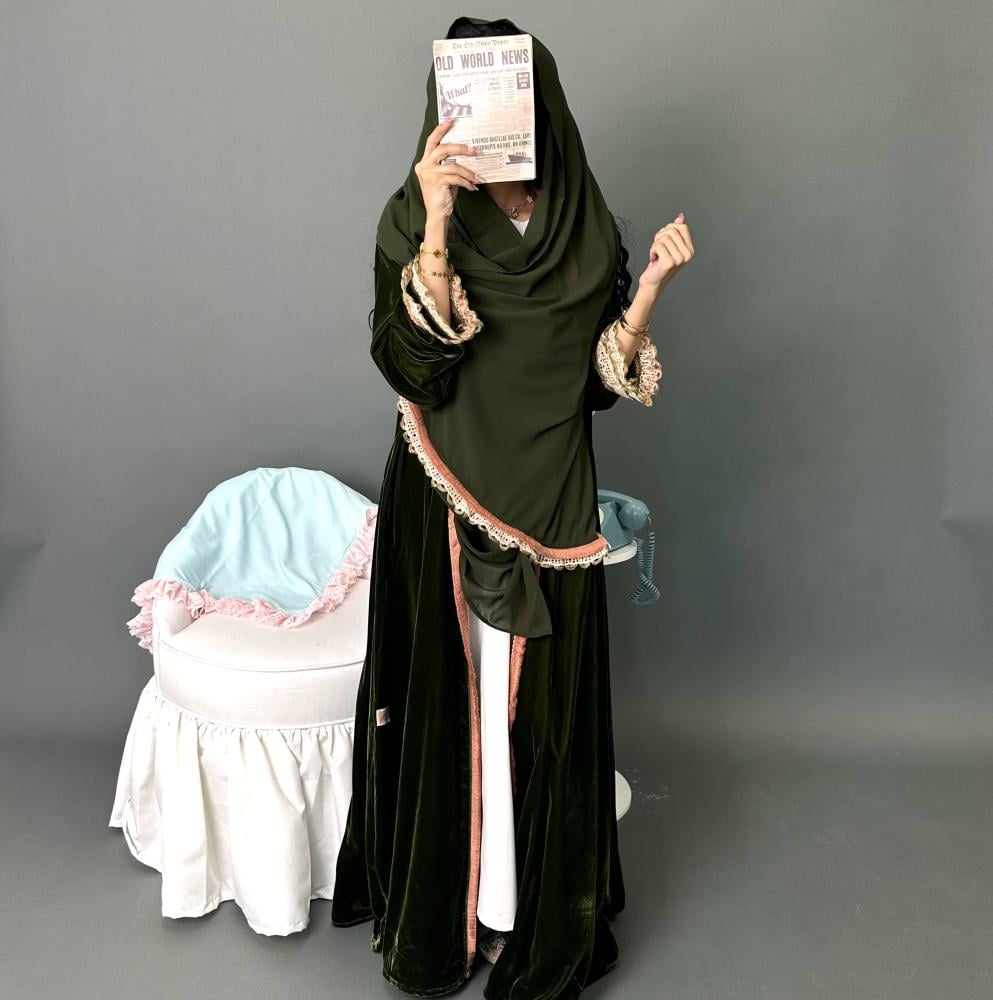 مخمل كوري زيتي | الكم كلفه مشغوله صوف | هدب من الامام | الطرحه شيفون جورجيت بطرف كلفه وهدب
