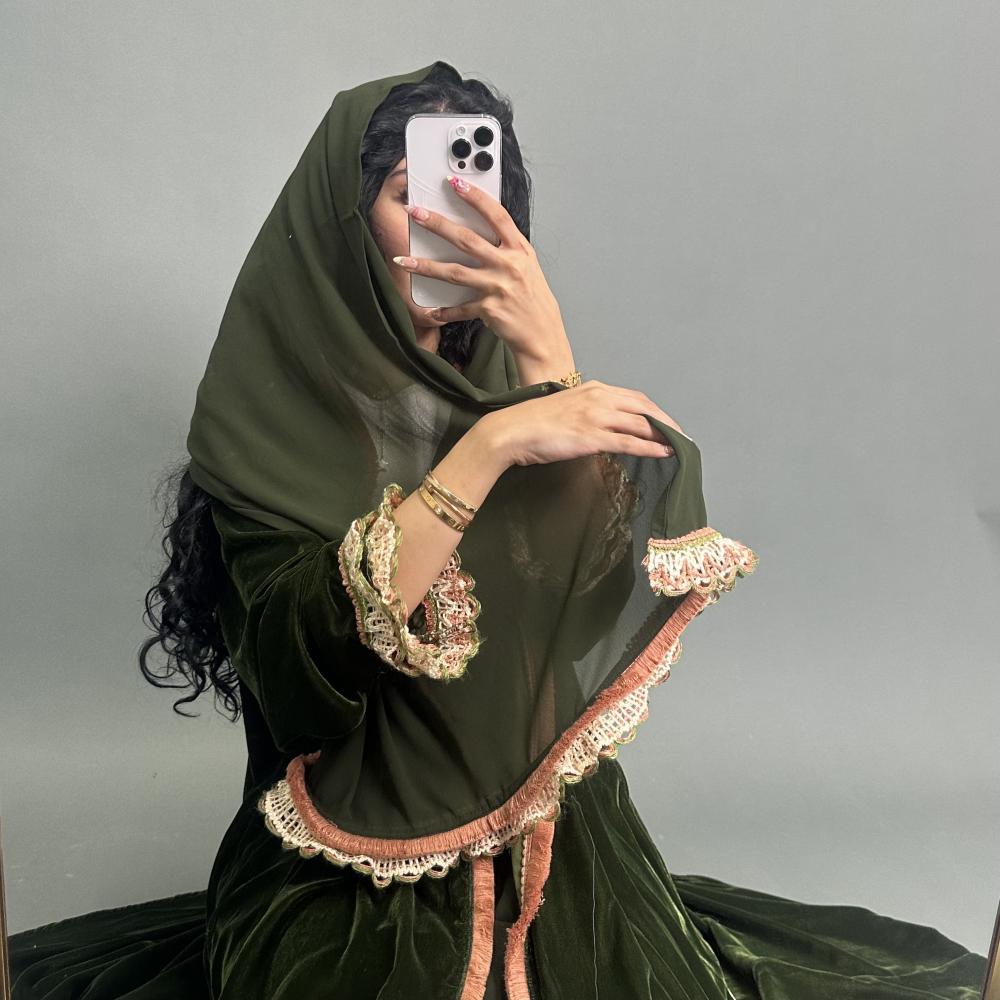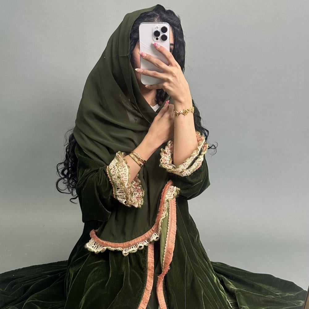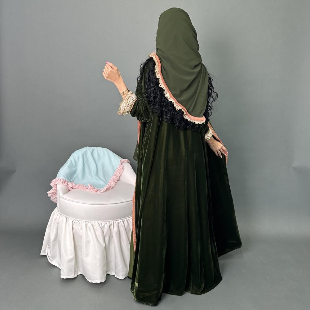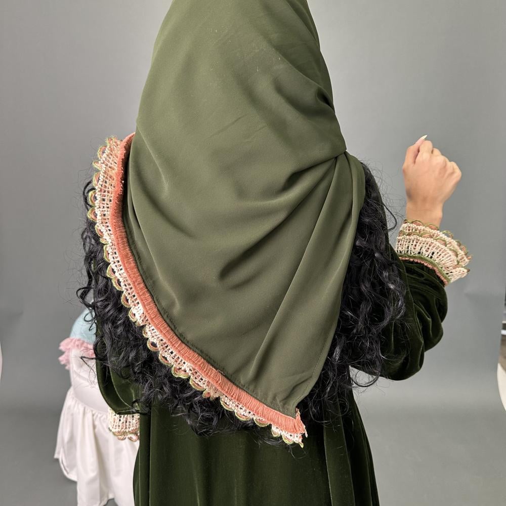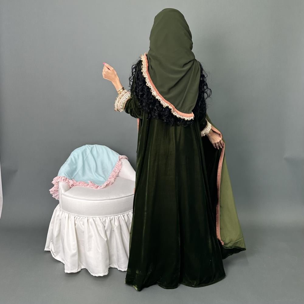 مخمل كوري زيتي | الكم كلفه مشغوله صوف | هدب من الامام | الطرحه شيفون جورجيت بطرف كلفه وهدب