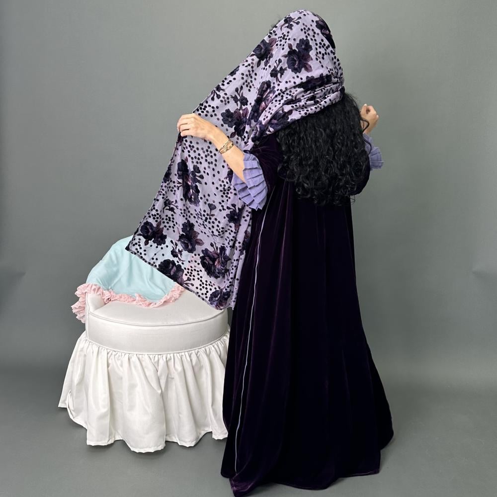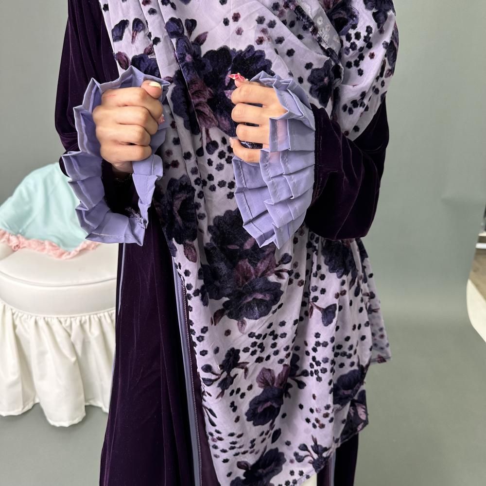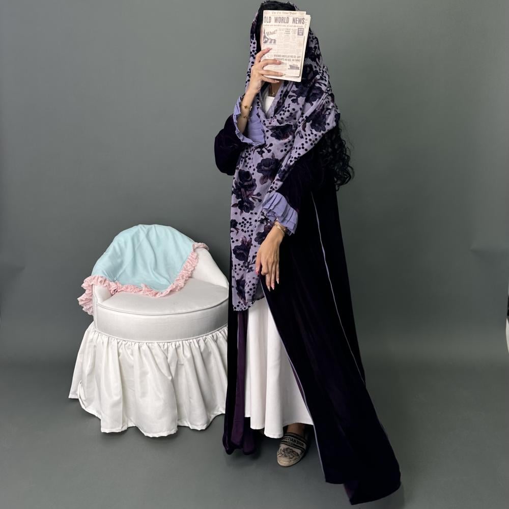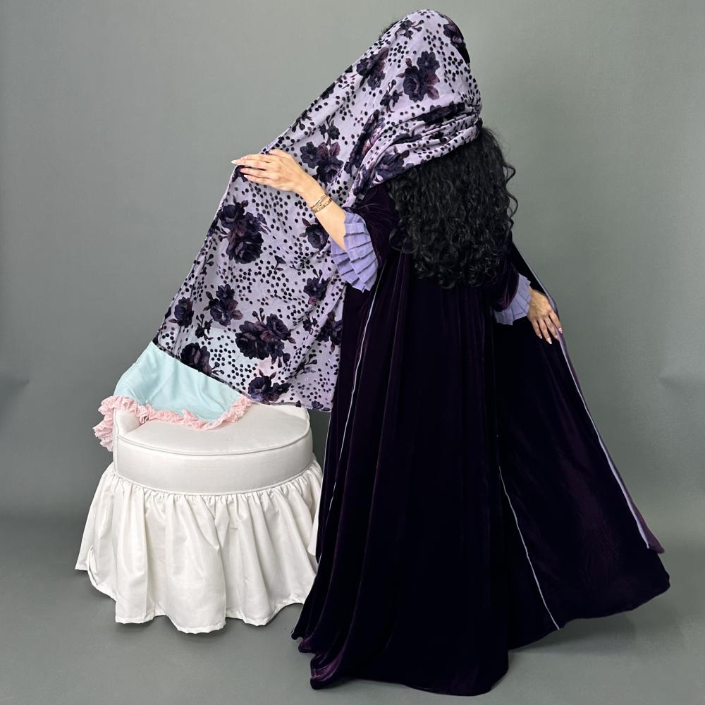 مخمل موف كوري | الكم مكسر طبقتين موف فاتح كريب | قيطان كامل العبايه | الطرحه شيفون مشجر بمخمل