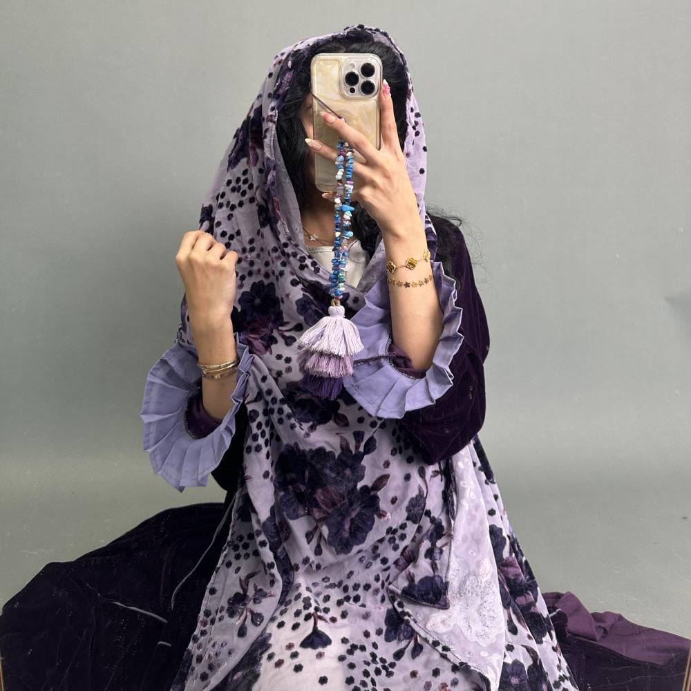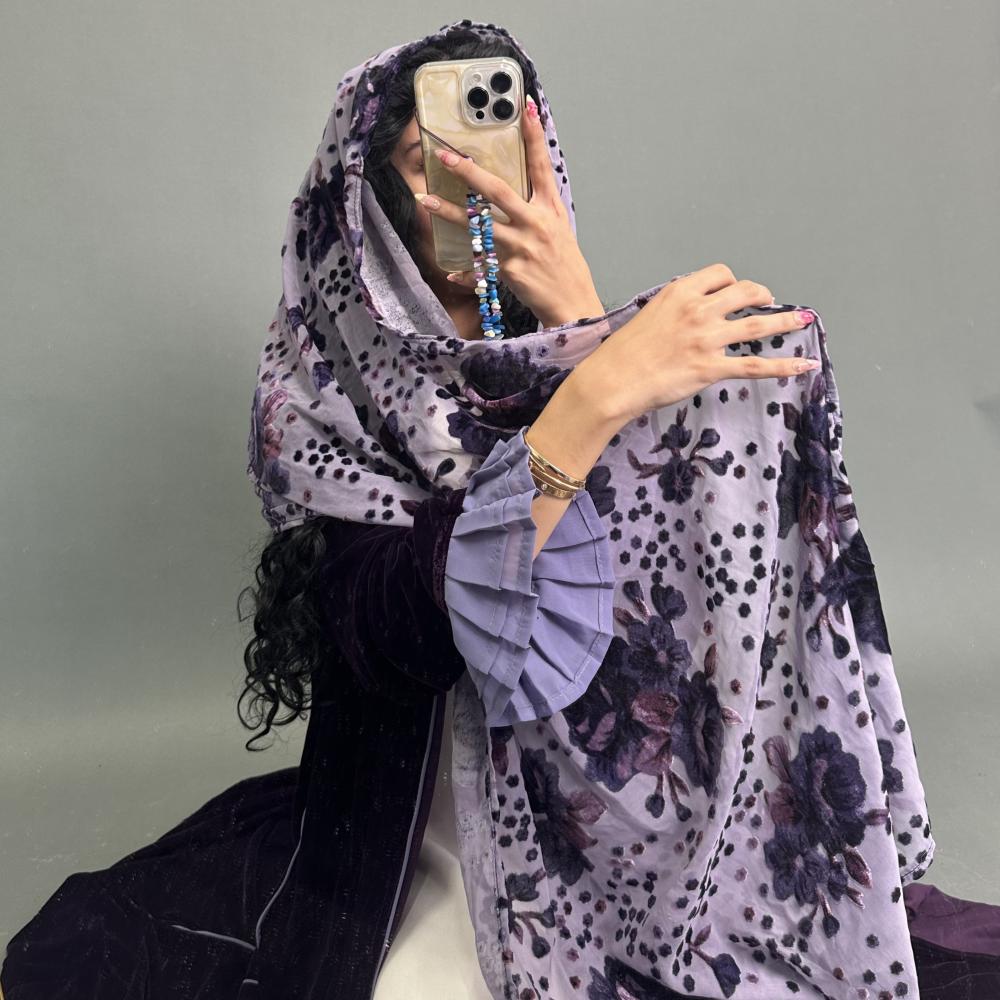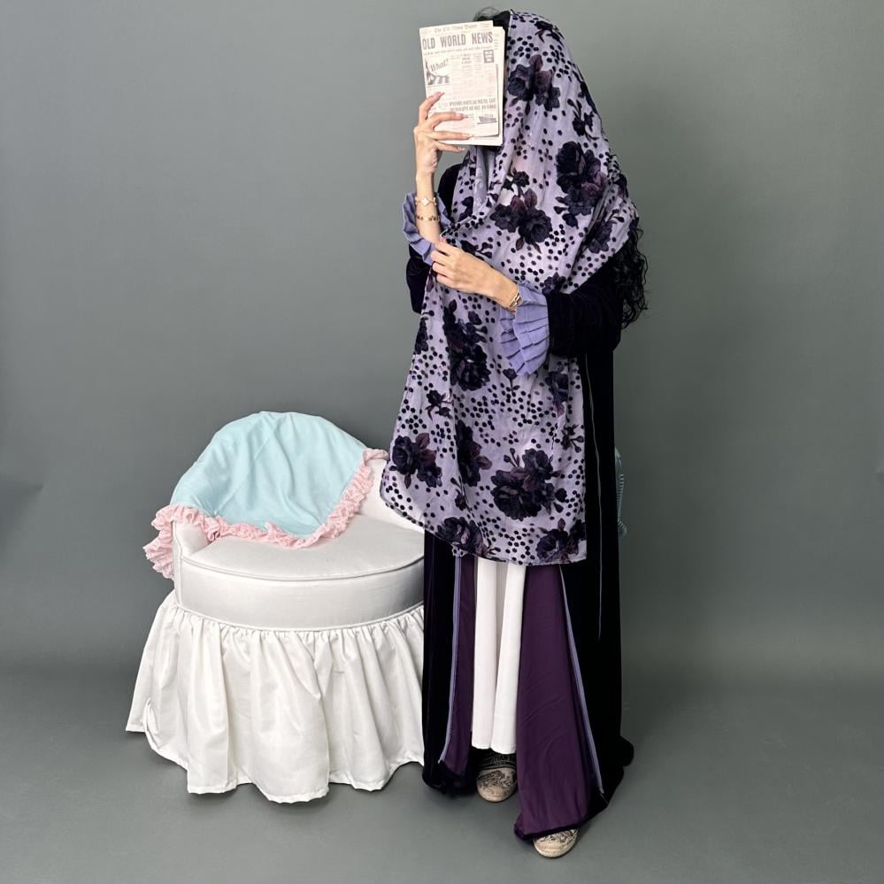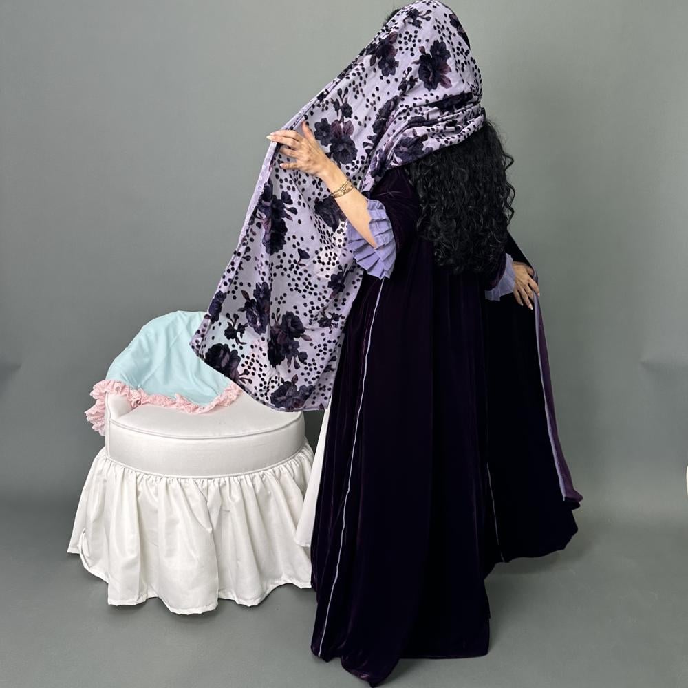 مخمل موف كوري | الكم مكسر طبقتين موف فاتح كريب | قيطان كامل العبايه | الطرحه شيفون مشجر بمخمل