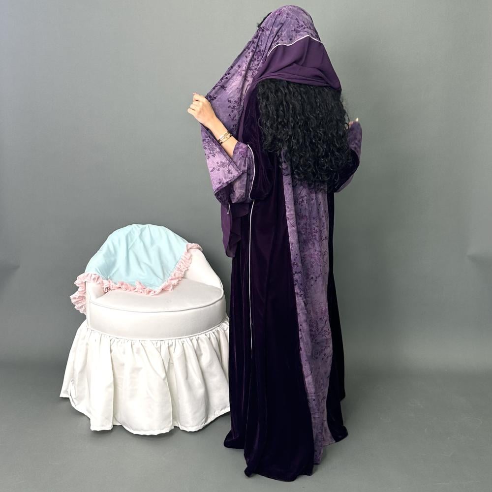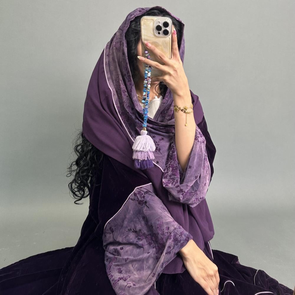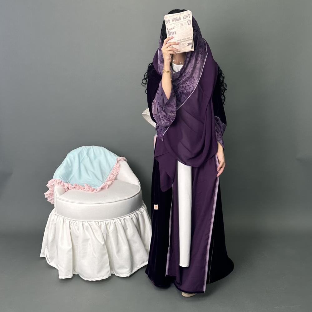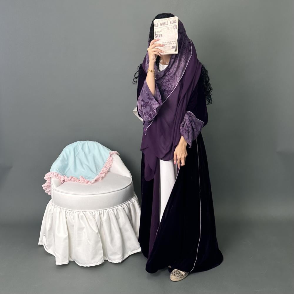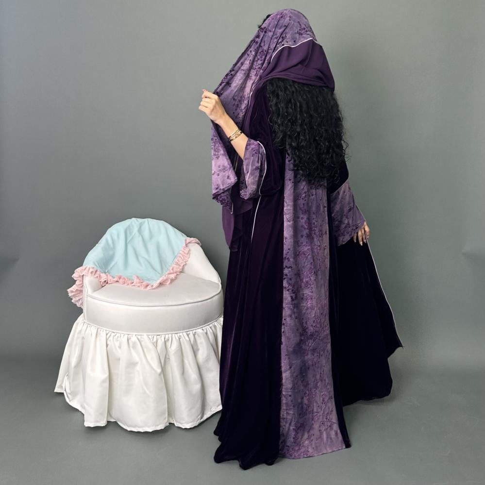 مخمل كوري موف | الكم ستريتش مشجر بمخمل | قيطان موف فاتح كامل العبايه | من الخلف قماش ستريتش مشجر بمخمل | الطرحه شيفون بطرف قيطان موف و قماش ستريتش مشجر بمخمل