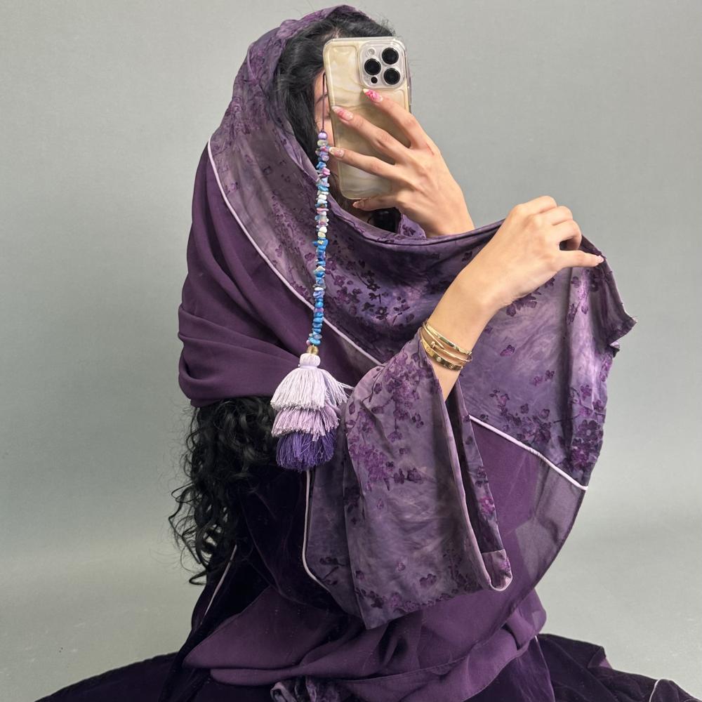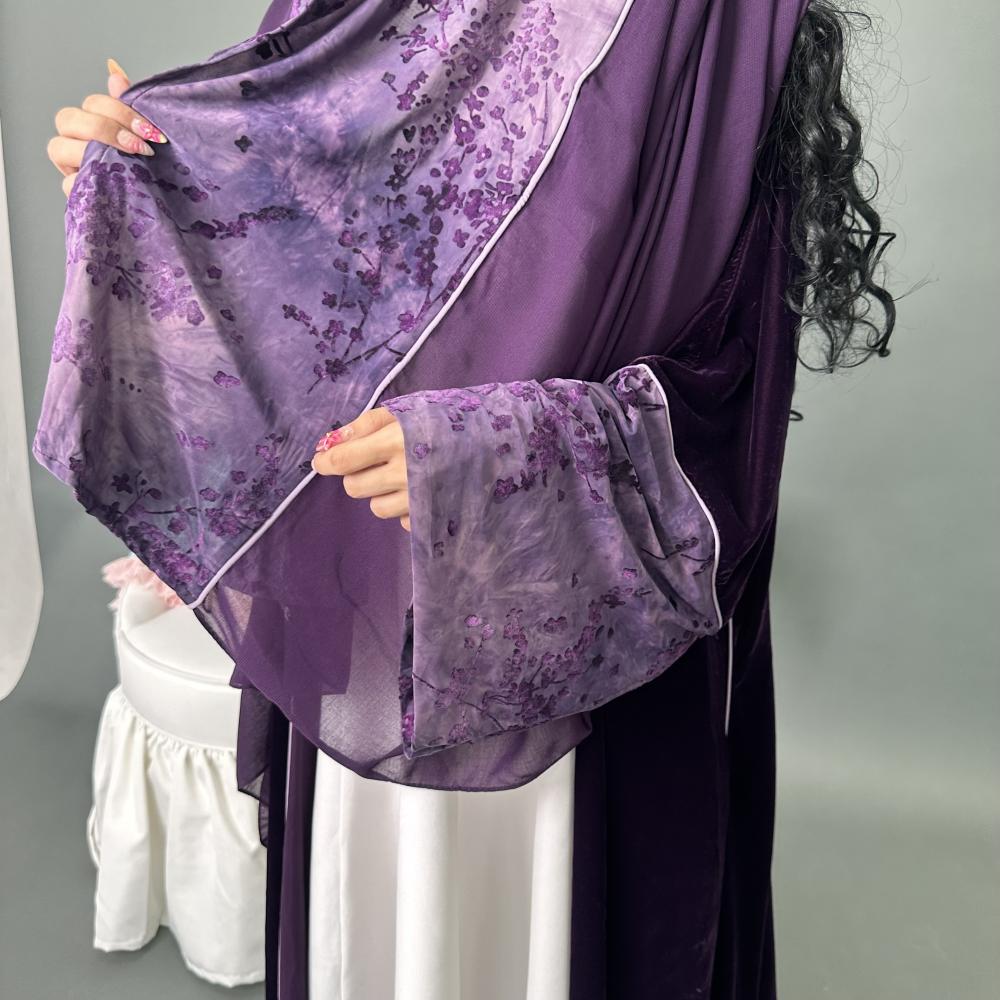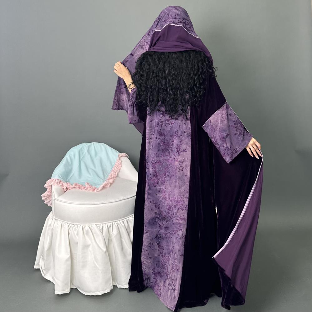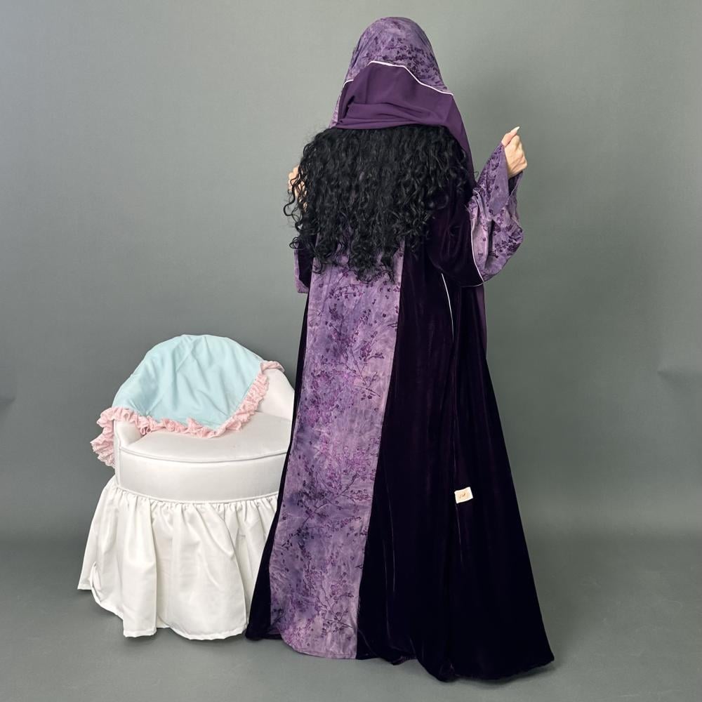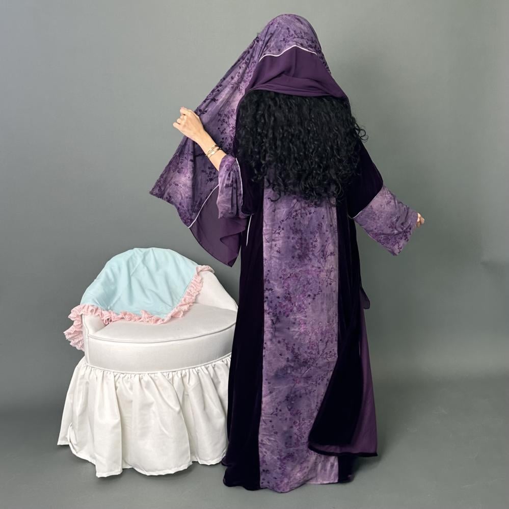 مخمل كوري موف | الكم ستريتش مشجر بمخمل | قيطان موف فاتح كامل العبايه | من الخلف قماش ستريتش مشجر بمخمل | الطرحه شيفون بطرف قيطان موف و قماش ستريتش مشجر بمخمل