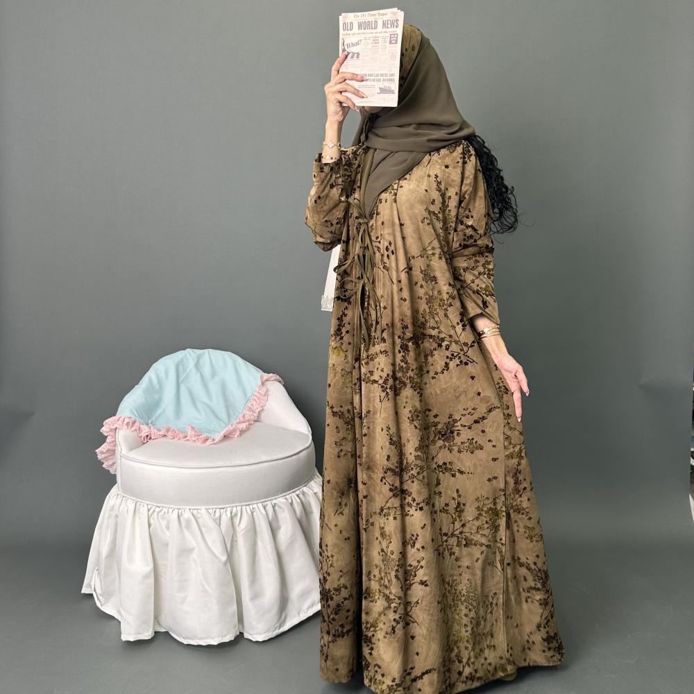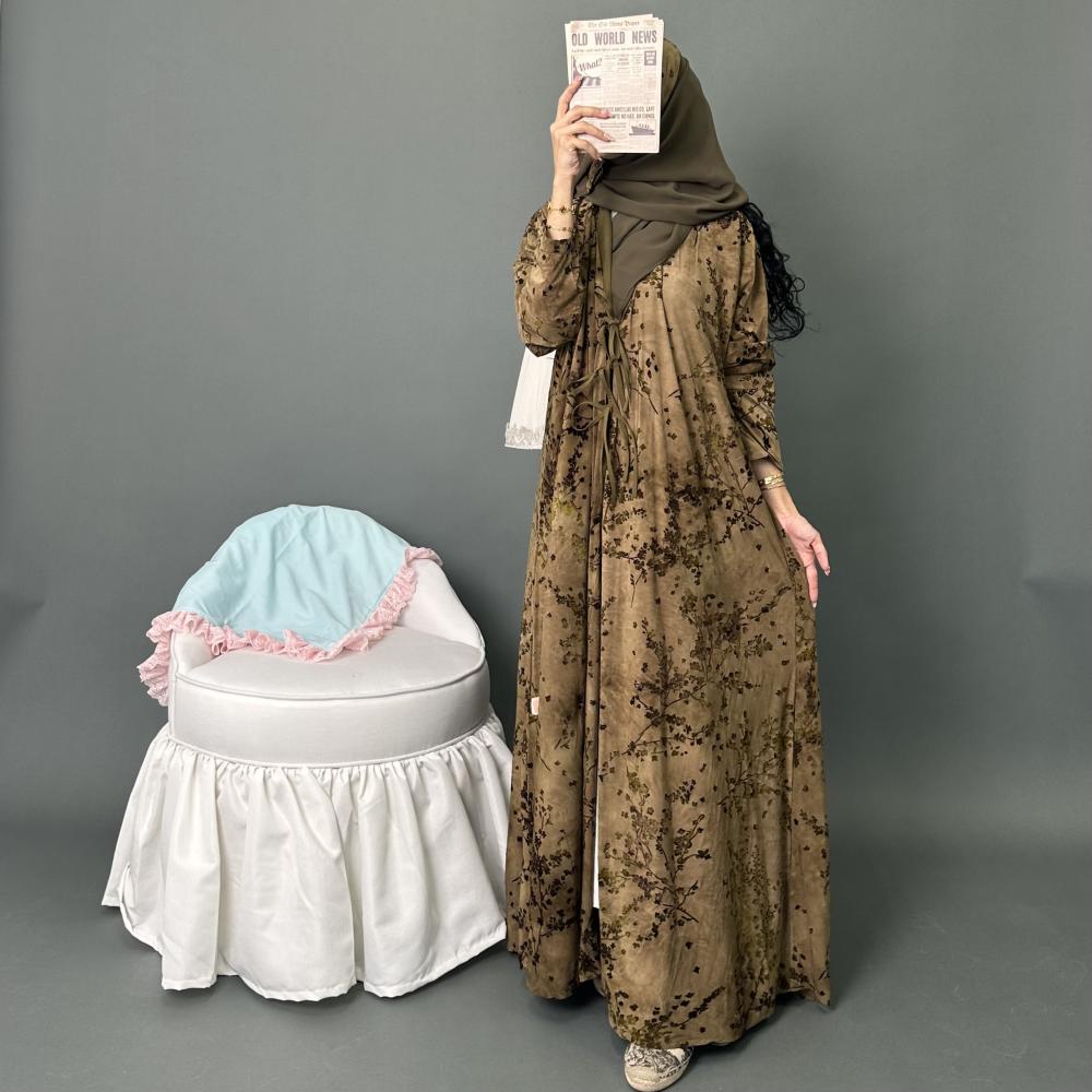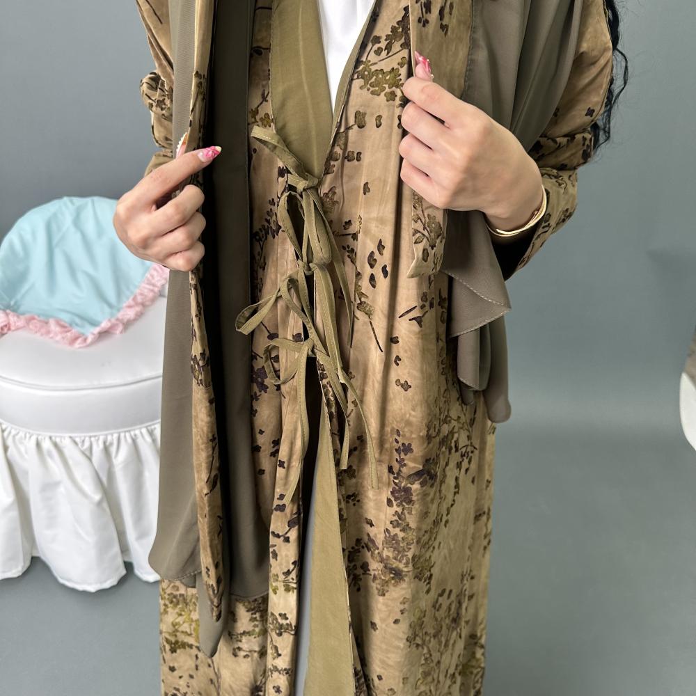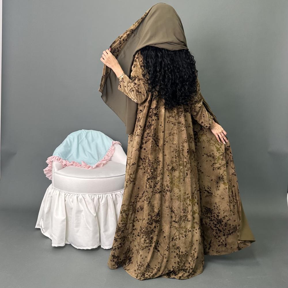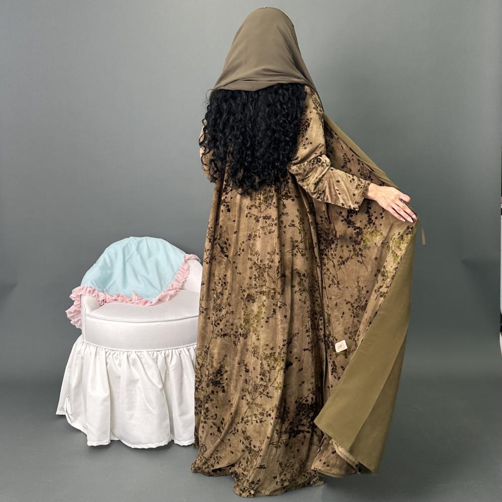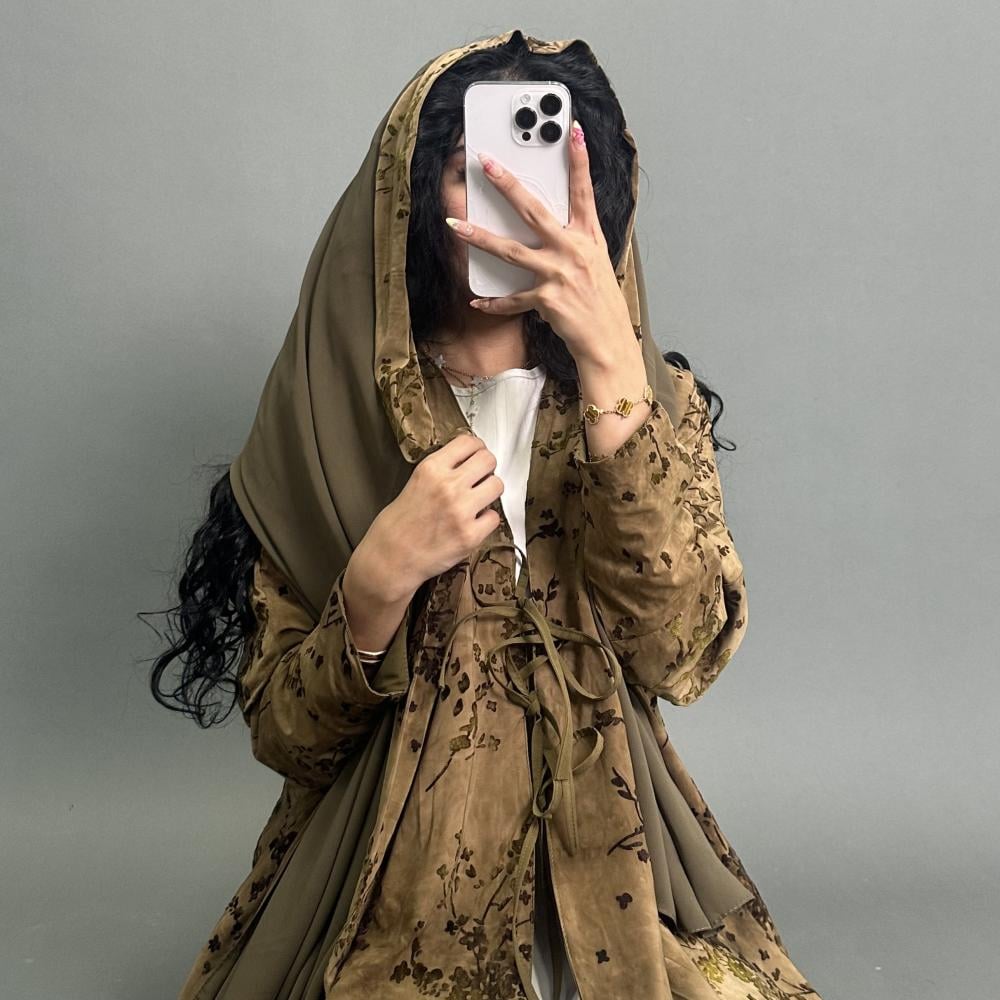 عبايه " دبل فيس " يمكن لبسها على الجهتين | قماش ستريتش مشجر بمخمل مبطن بحرير مغسول كوري كموني | من الامام ربطات | الطرحه شيفون ساده بطرف