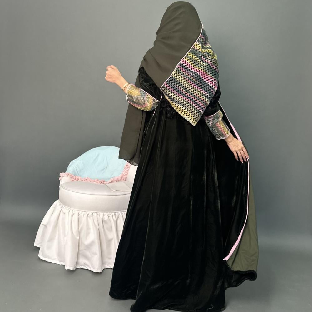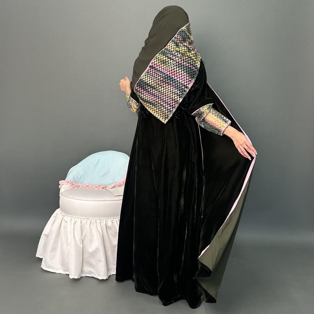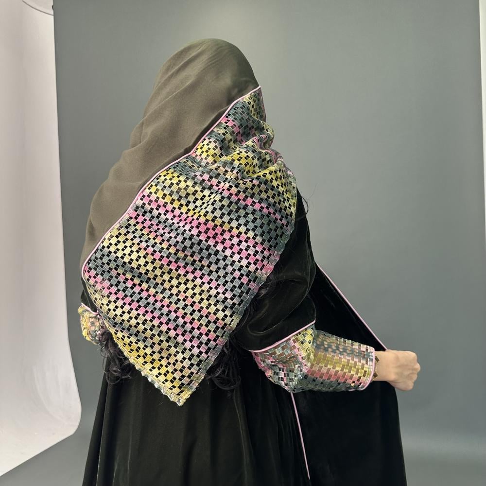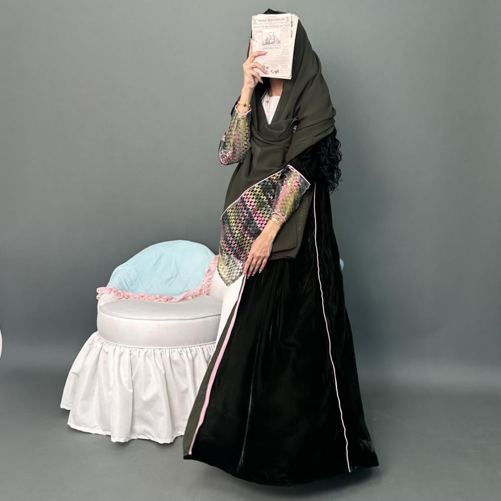 مخمل كوري زيتي | الكم ماسك قماش شبك مموج ، قيطان وردي | قيطان وردي كامل العبايه | الطرحه شيفون بقماش شبك مموج