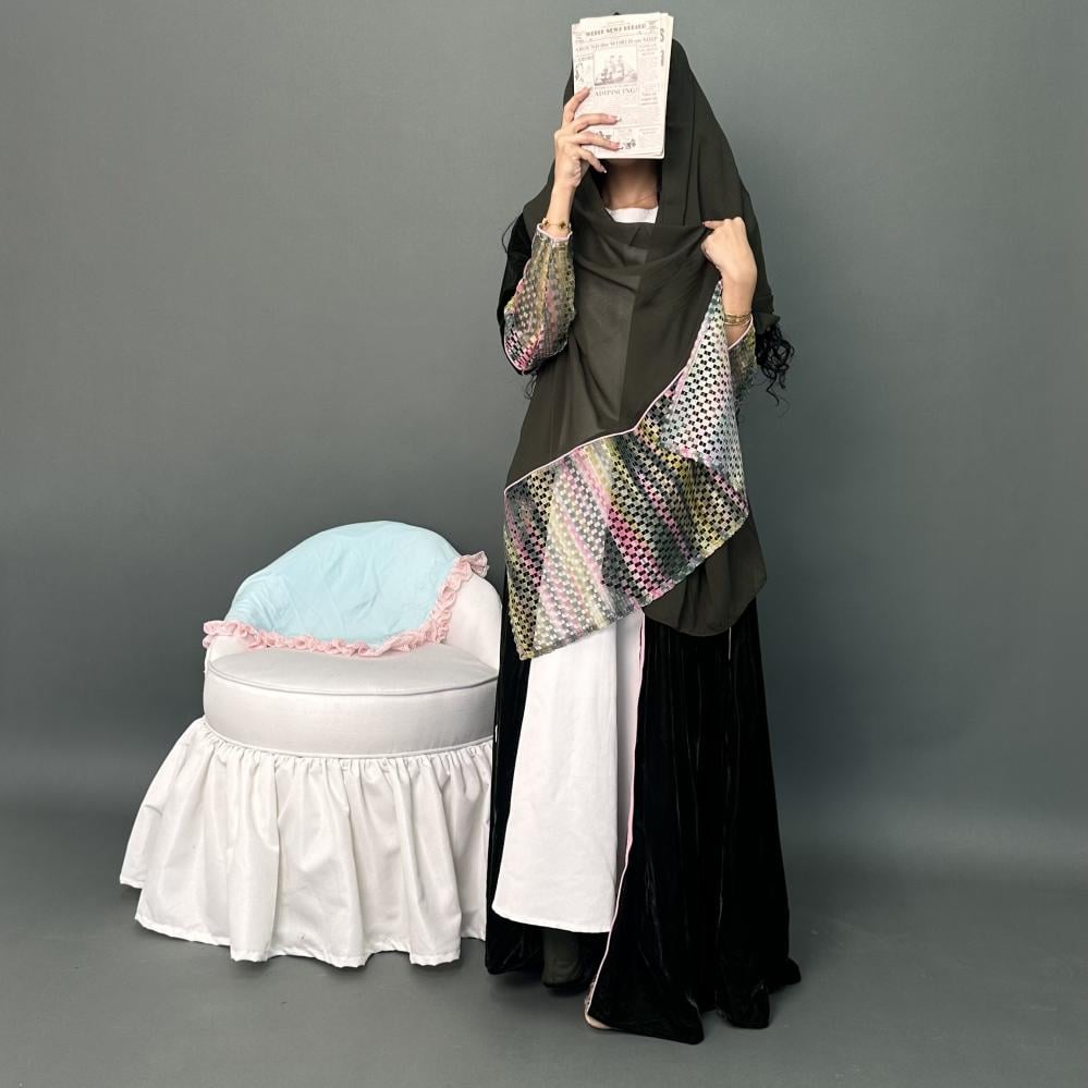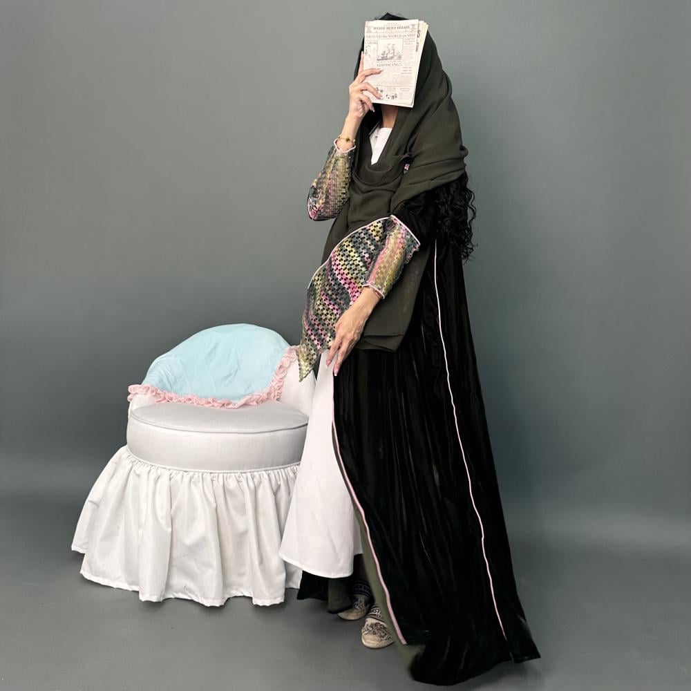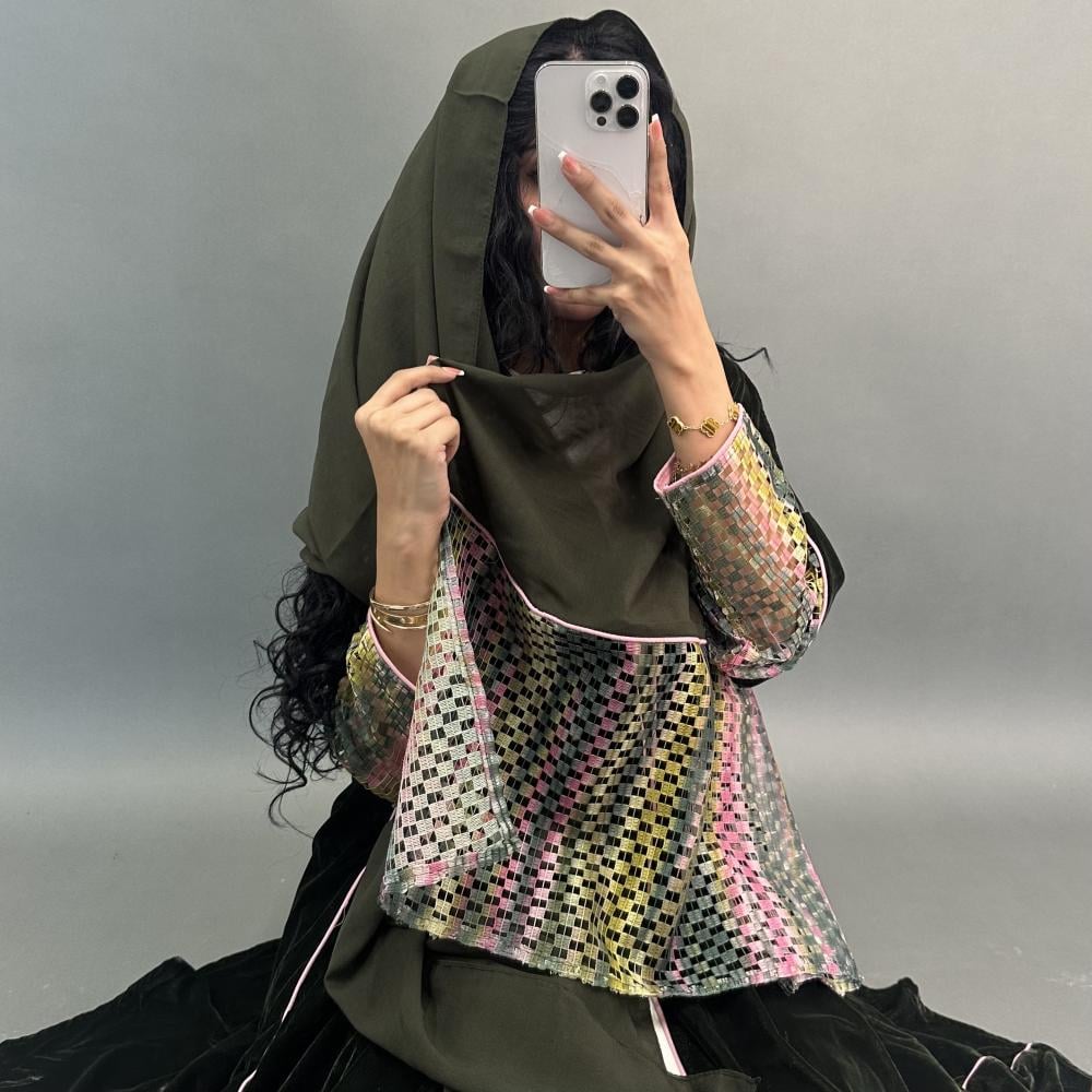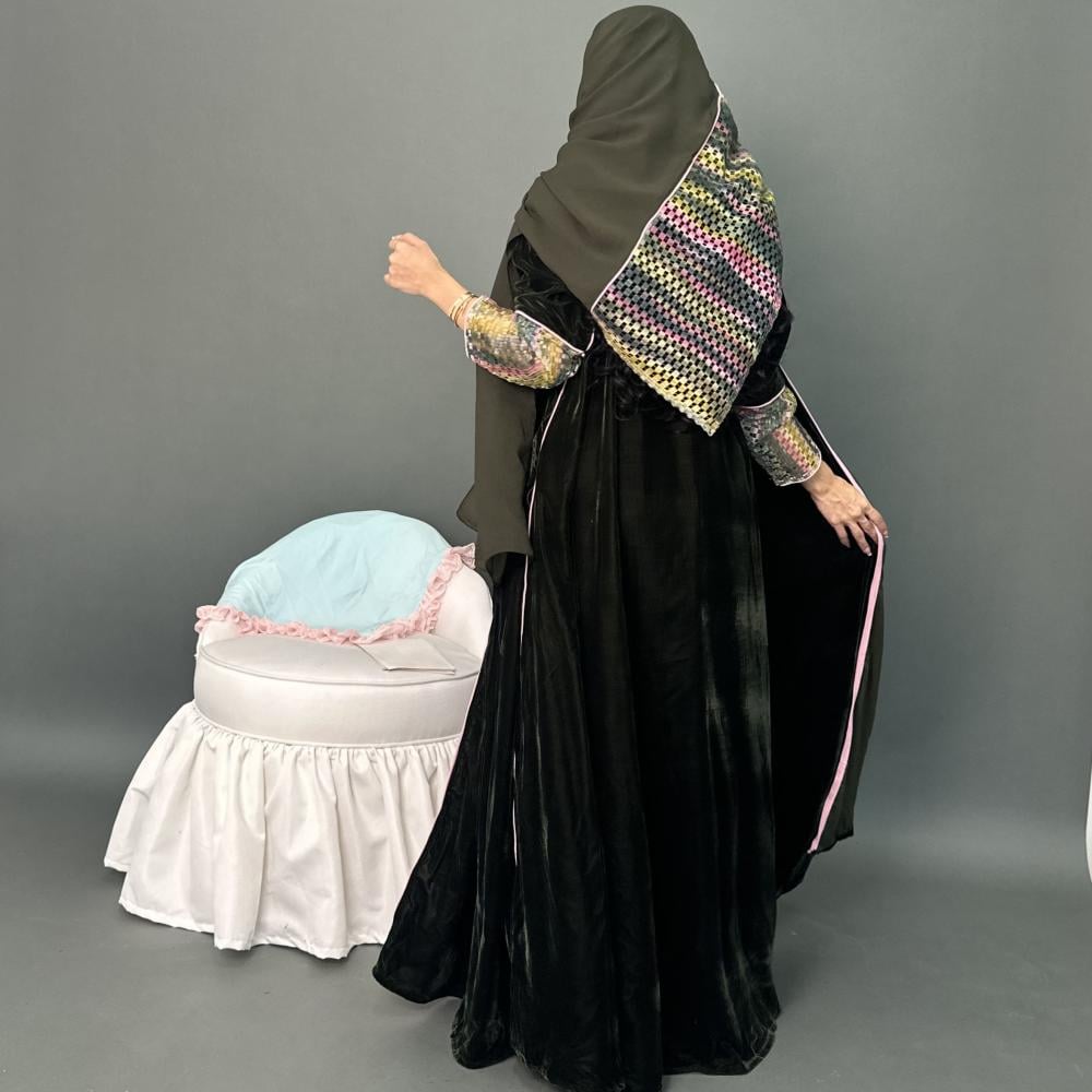 مخمل كوري زيتي | الكم ماسك قماش شبك مموج ، قيطان وردي | قيطان وردي كامل العبايه | الطرحه شيفون بقماش شبك مموج
