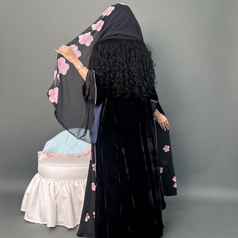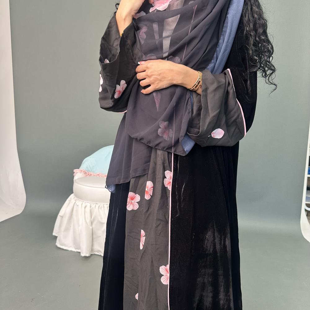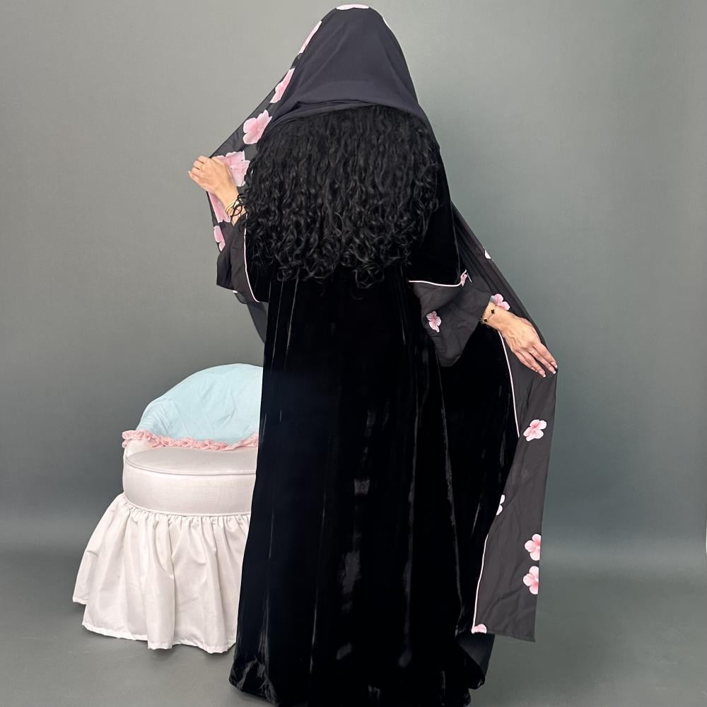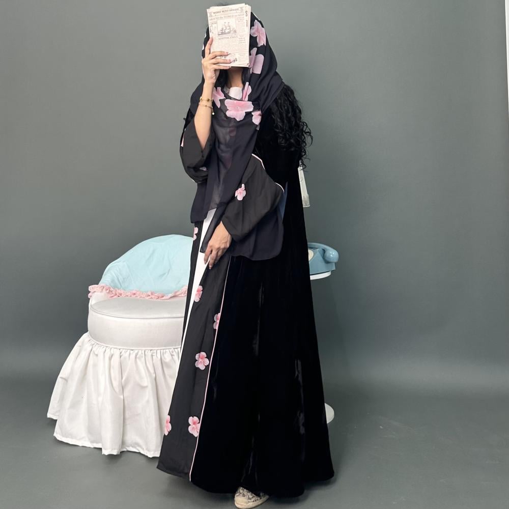 - مخمل كوري اسود | الكم شيفون طباعه ورد، قيطان وردي | من الامام شيفون طباعه ورد وقيطان وردي | الطرحه شيفون جورجيت طباعه ورد