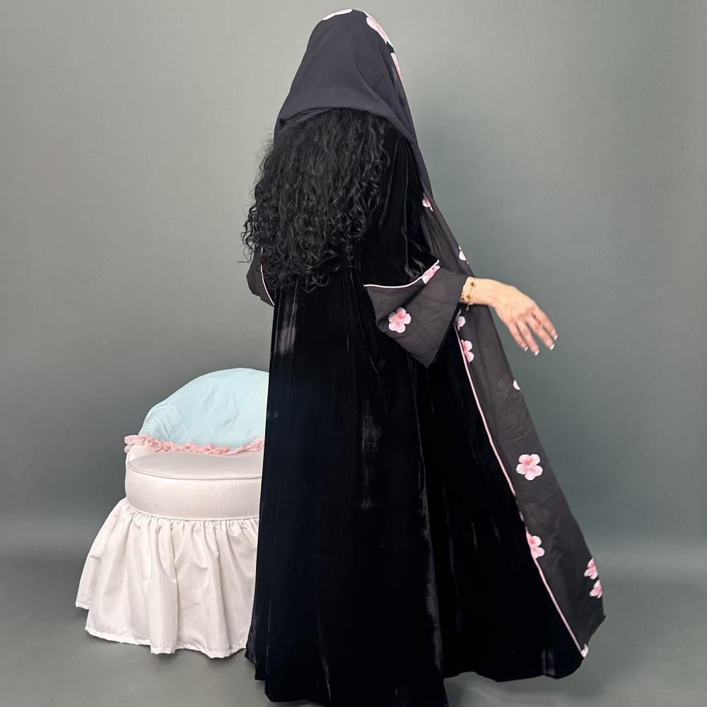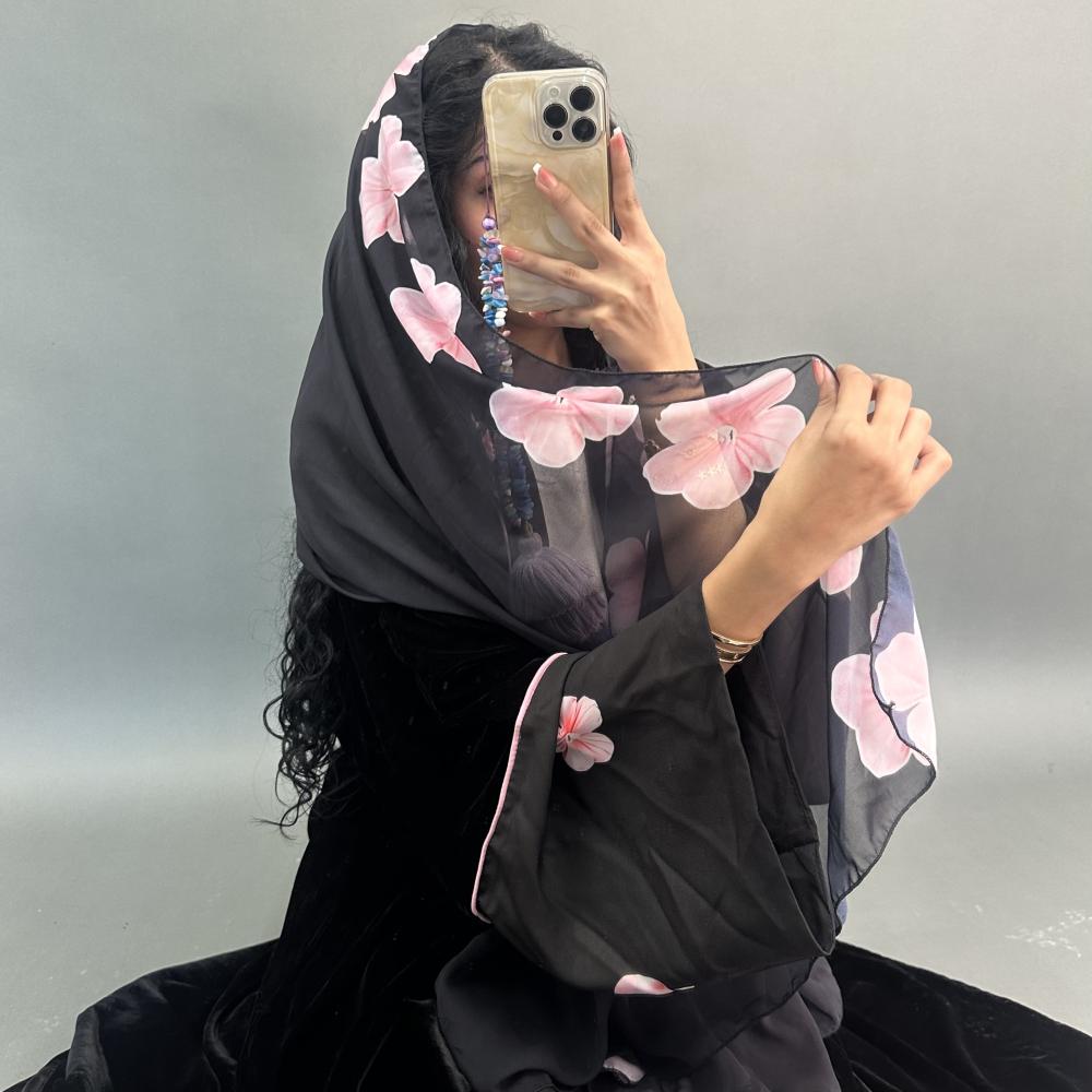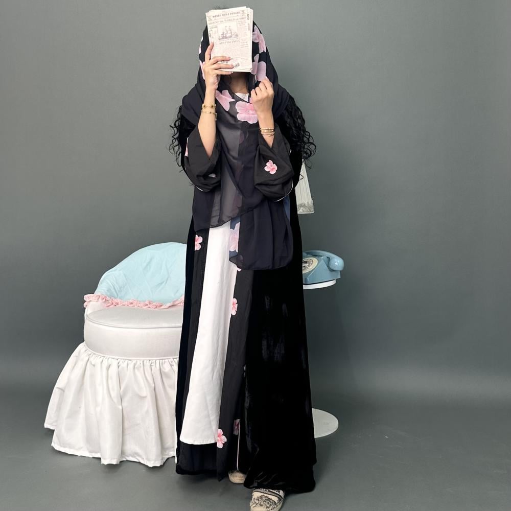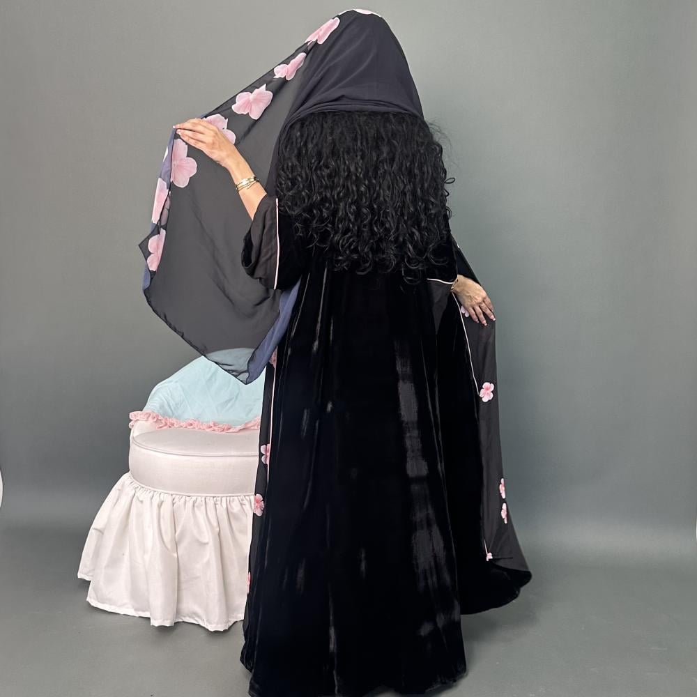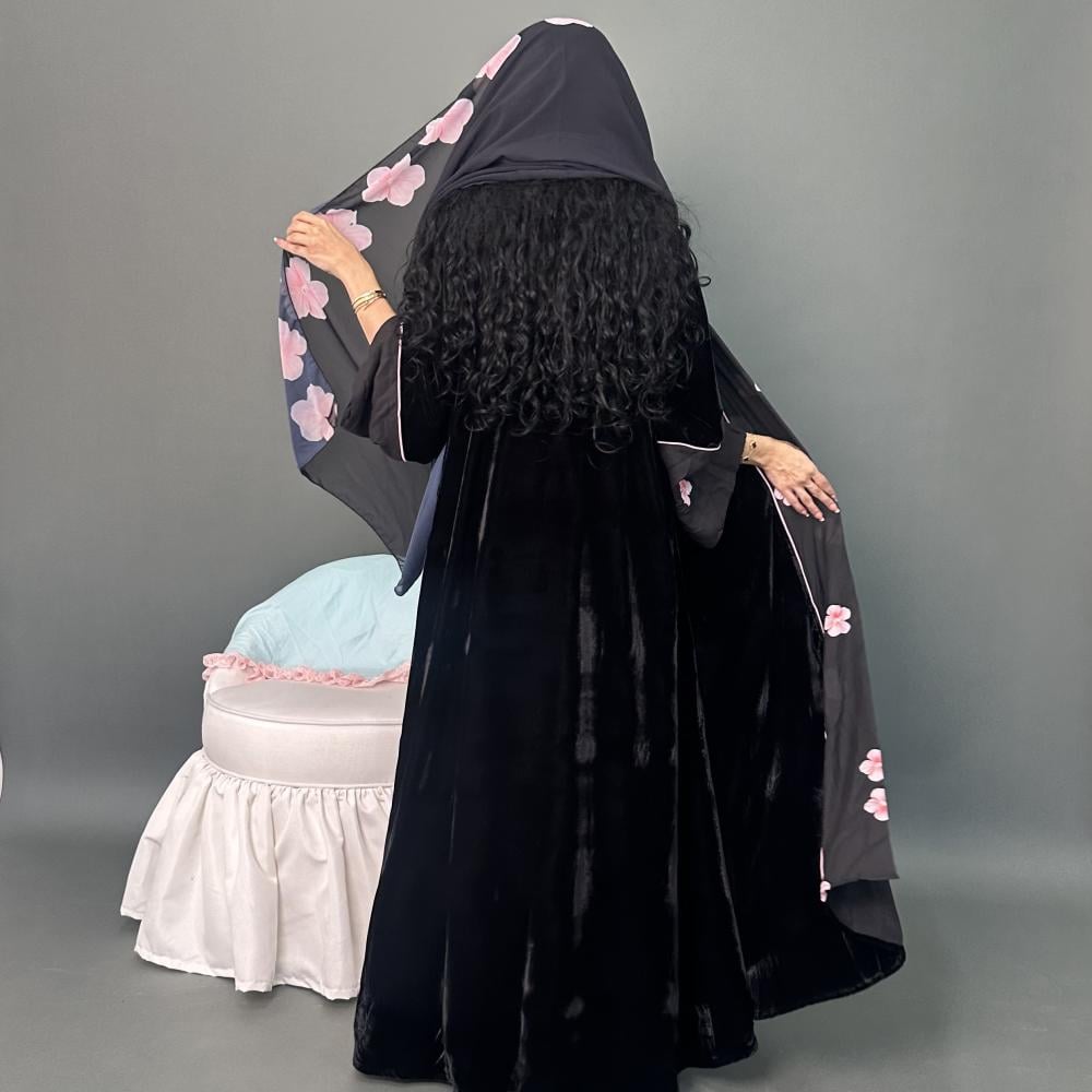 - مخمل كوري اسود | الكم شيفون طباعه ورد، قيطان وردي | من الامام شيفون طباعه ورد وقيطان وردي | الطرحه شيفون جورجيت طباعه ورد