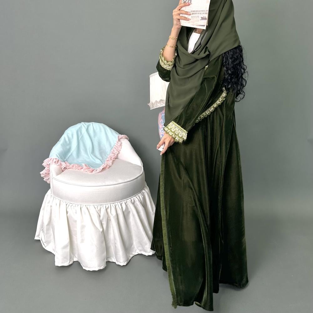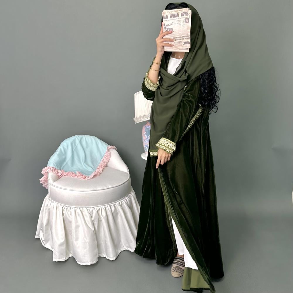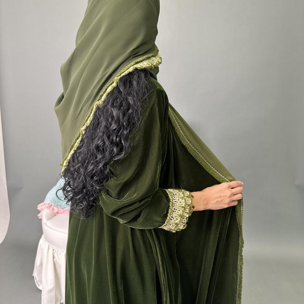 مخمل كوري زيتي | من الامام هدب بالجهتين | الكم كلفه صوف مشغول |الطرحه شيفون ساده بطرف هدب و كلفه صوف