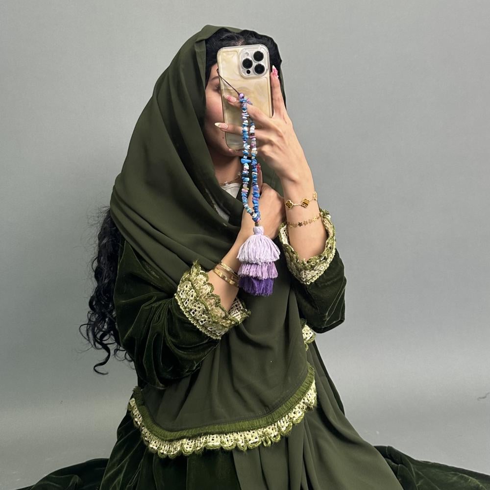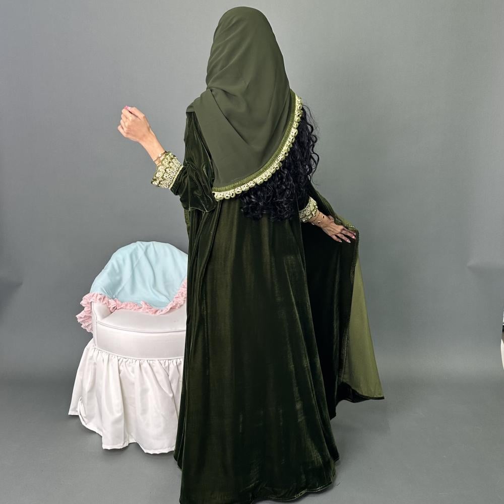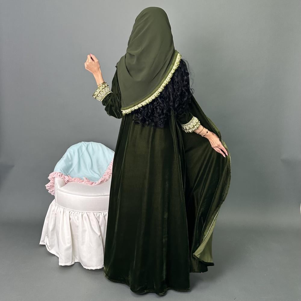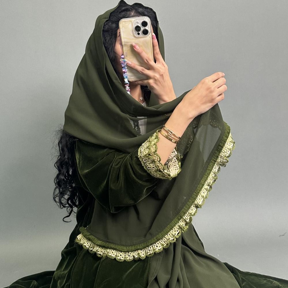 مخمل كوري زيتي | من الامام هدب بالجهتين | الكم كلفه صوف مشغول |الطرحه شيفون ساده بطرف هدب و كلفه صوف