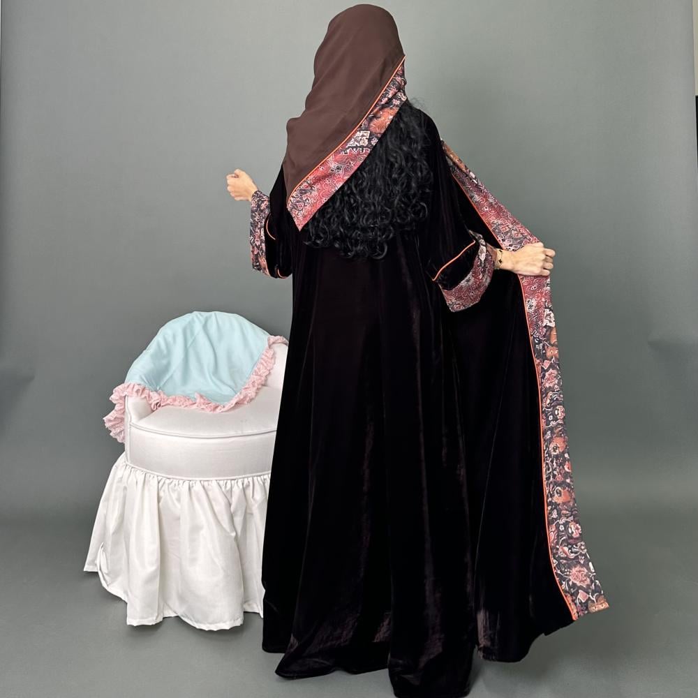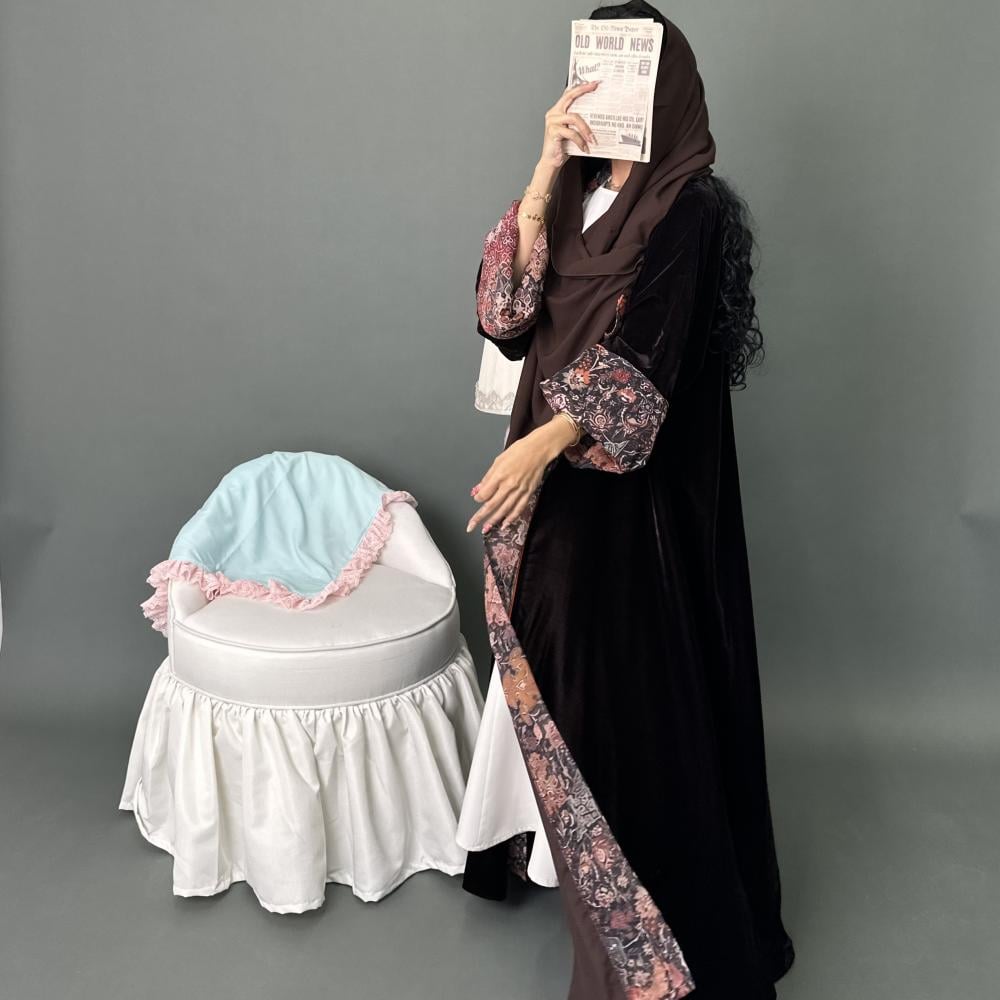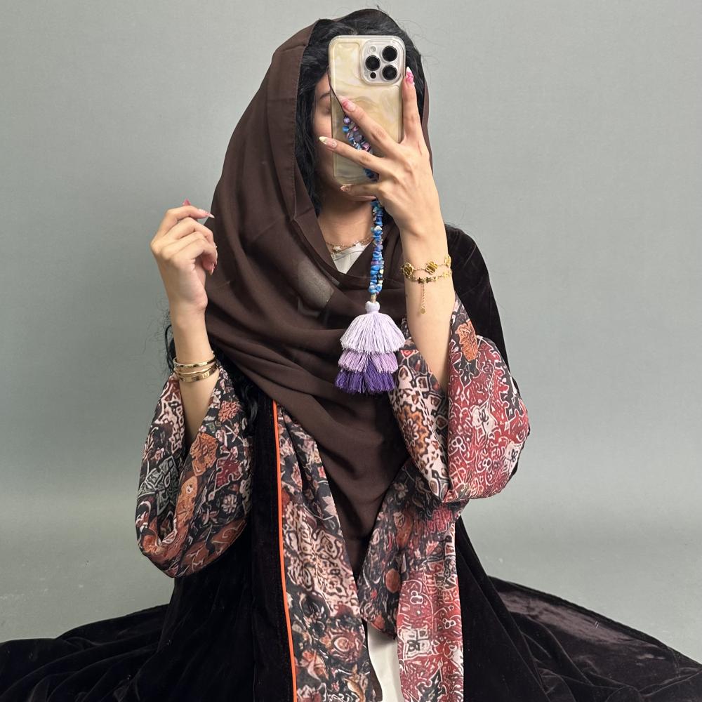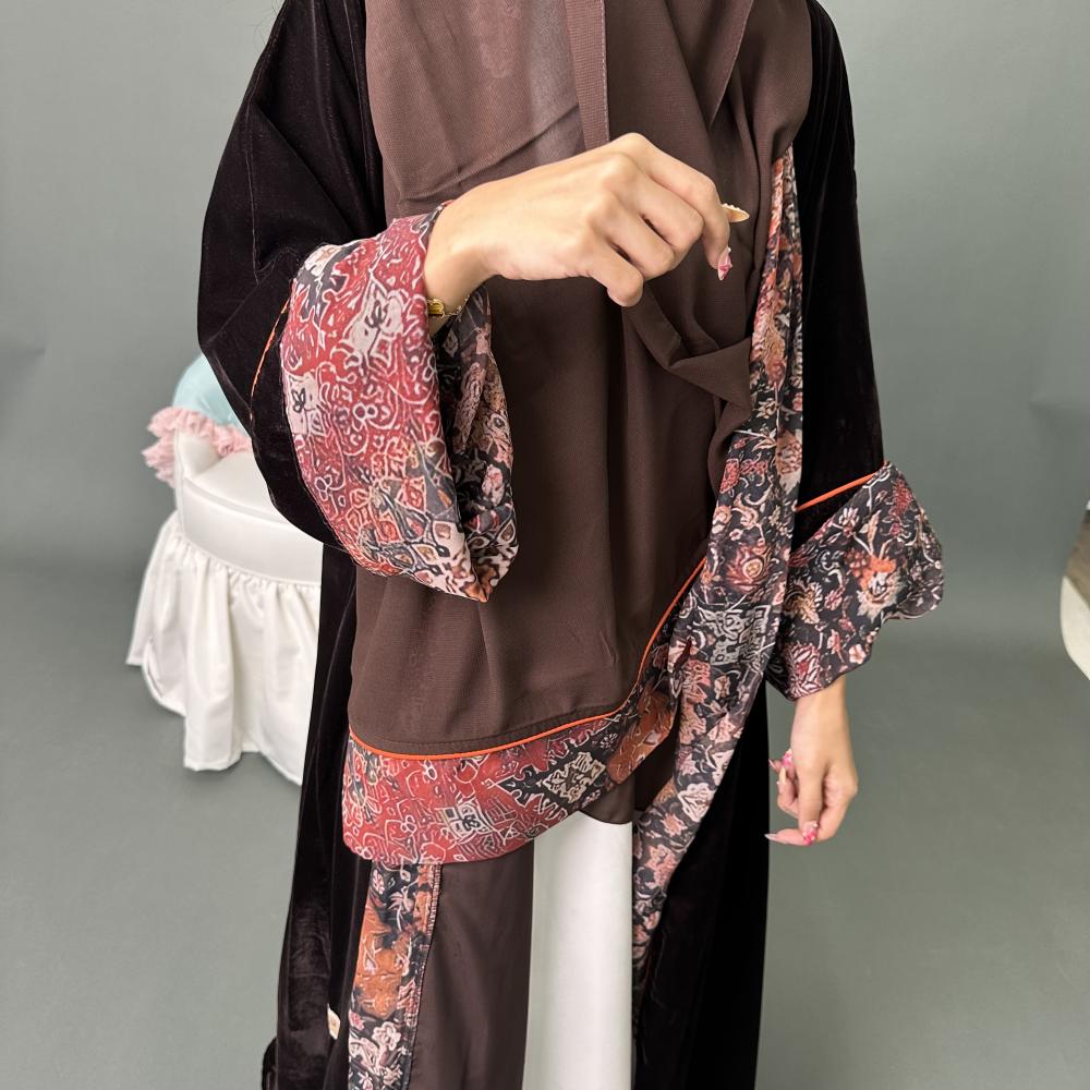 مخمل كوري بني | الكم سفطه "غير مثبته" شيفون مشجر بقيطان اورنج | من الامام شيفون مشجر بقيطان | الطرحه شيفون بطرف شيفون مشجر وقيطان