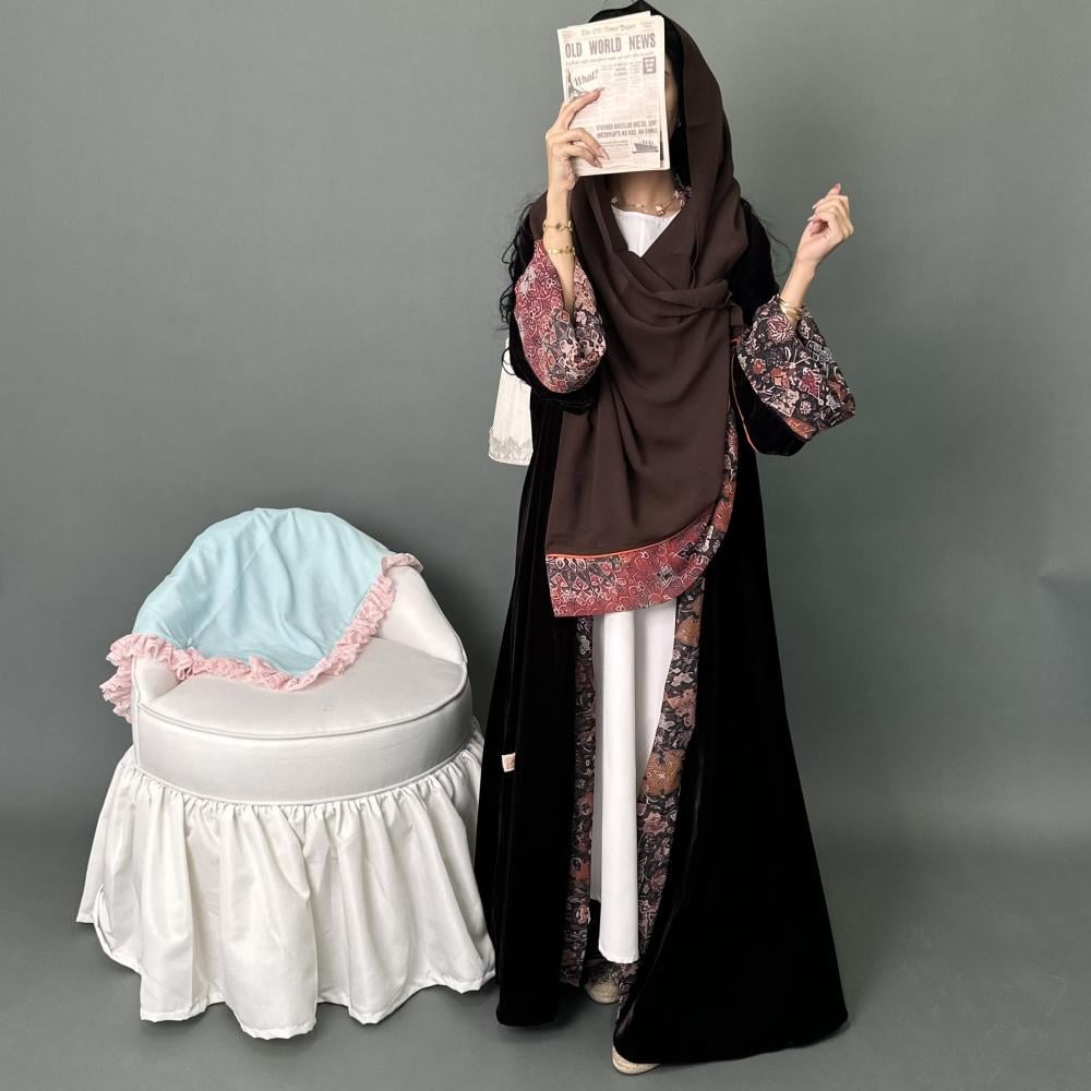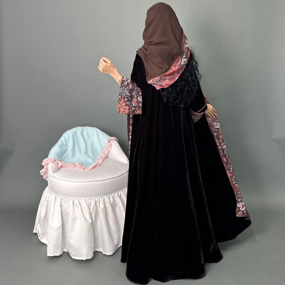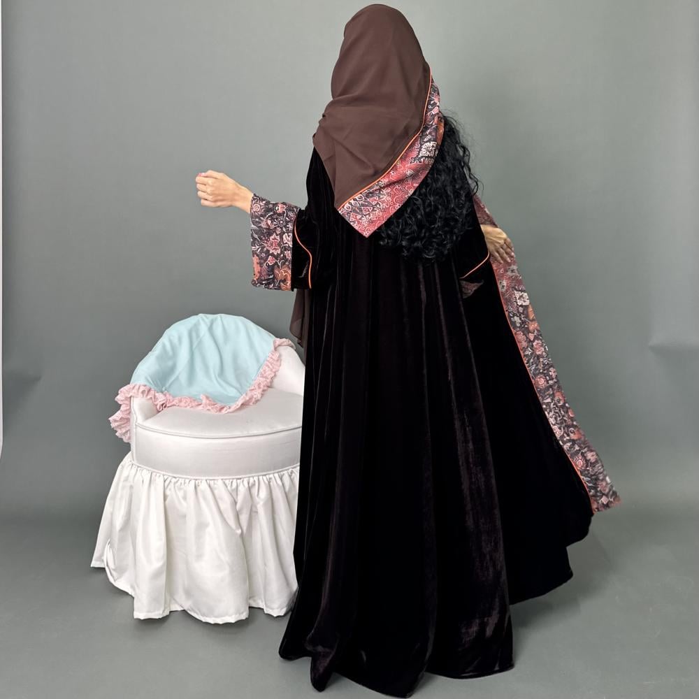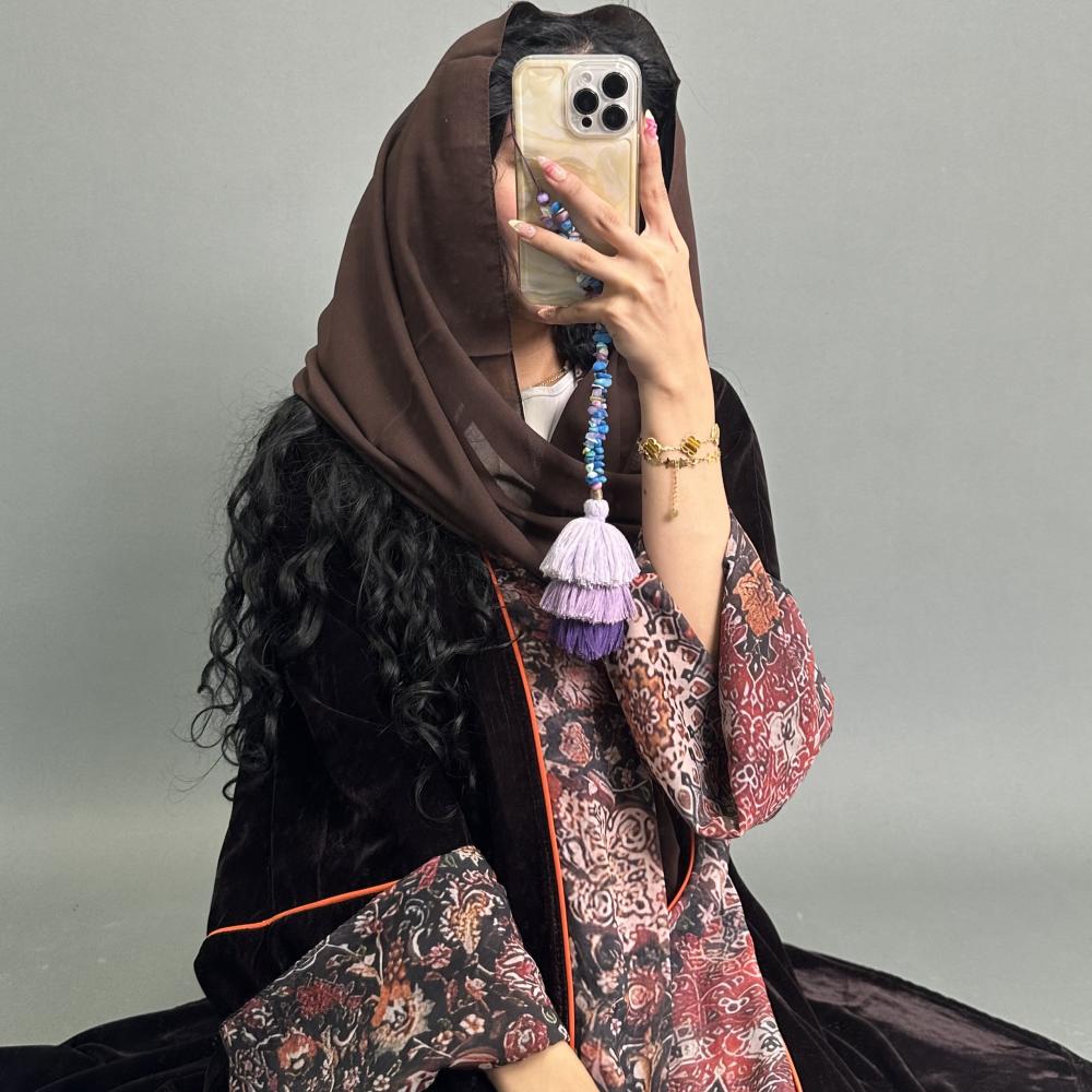 مخمل كوري بني | الكم سفطه "غير مثبته" شيفون مشجر بقيطان اورنج | من الامام شيفون مشجر بقيطان | الطرحه شيفون بطرف شيفون مشجر وقيطان