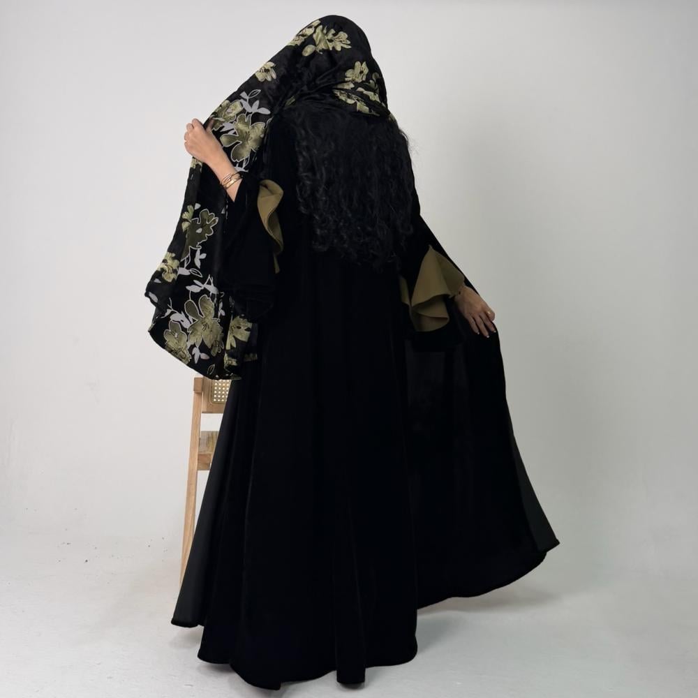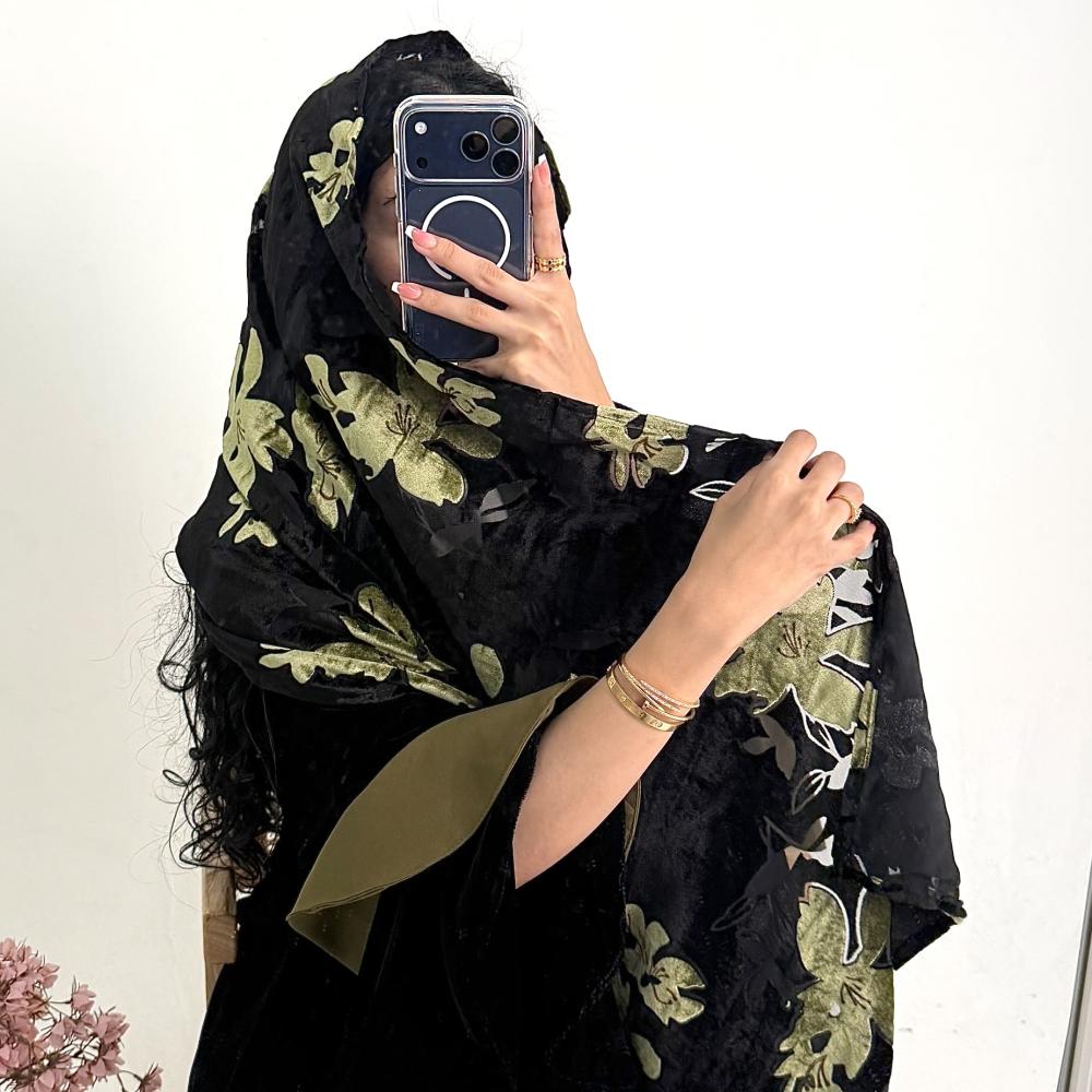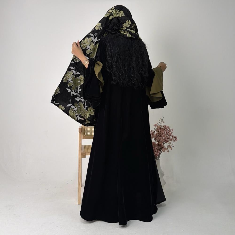 - مخمل كوري اسود | الكم دائره واسعه بكريب | الطرحه شيفون مشجر بمخمل