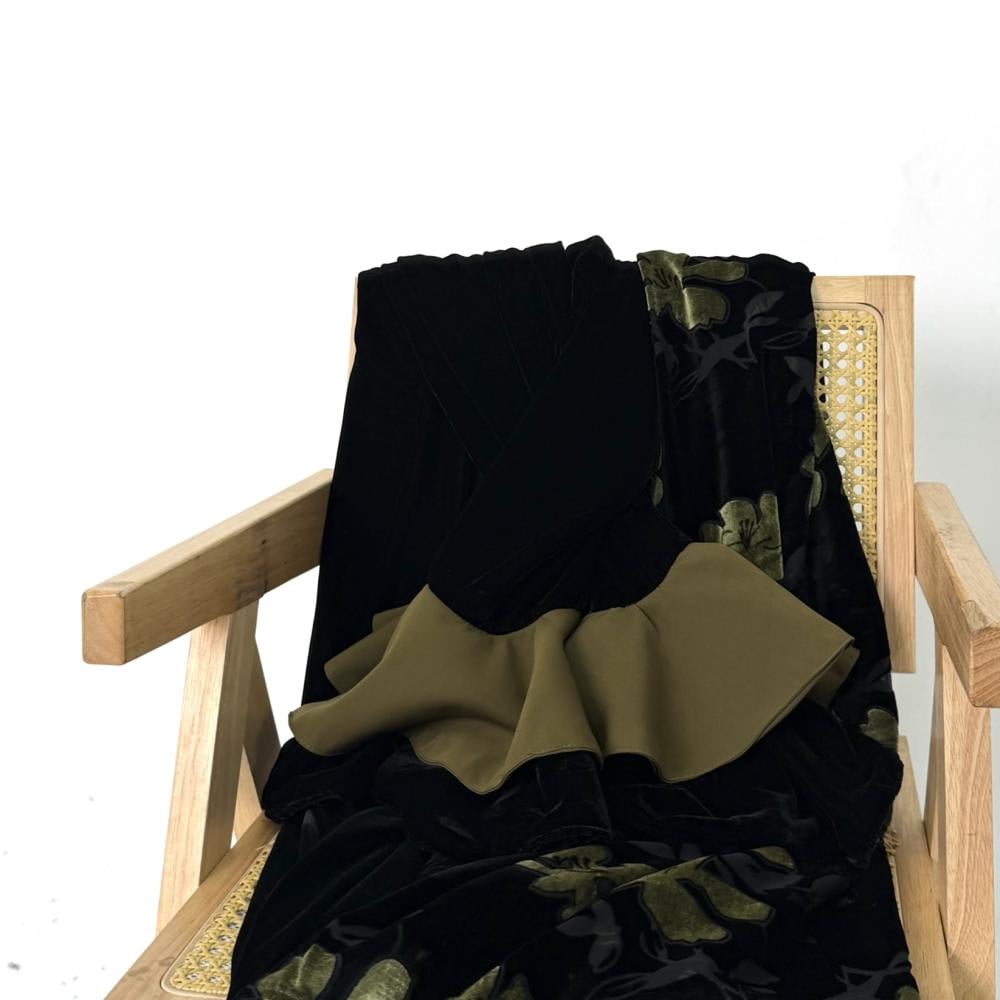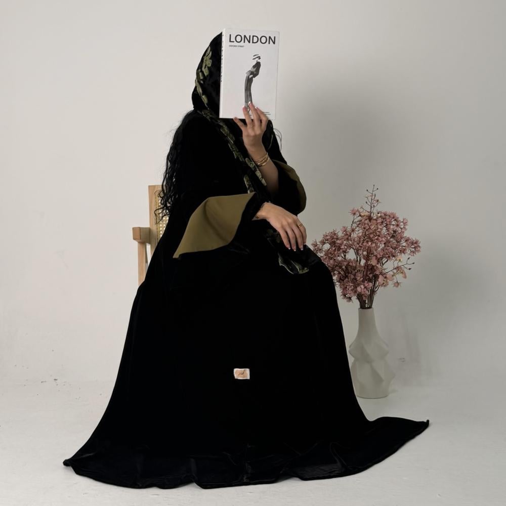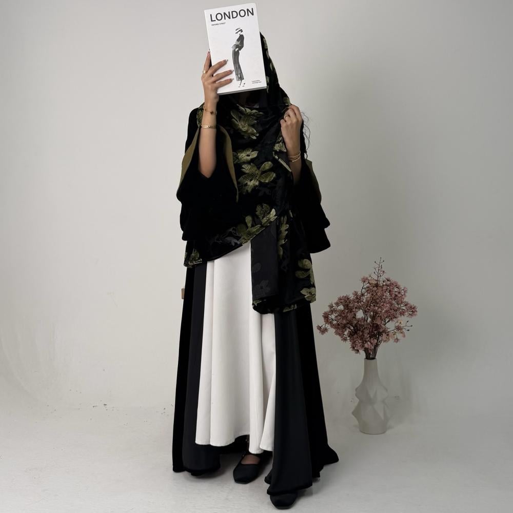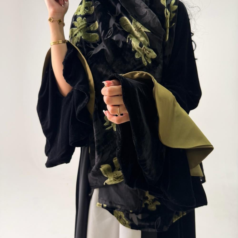 - مخمل كوري اسود | الكم دائره واسعه بكريب | الطرحه شيفون مشجر بمخمل