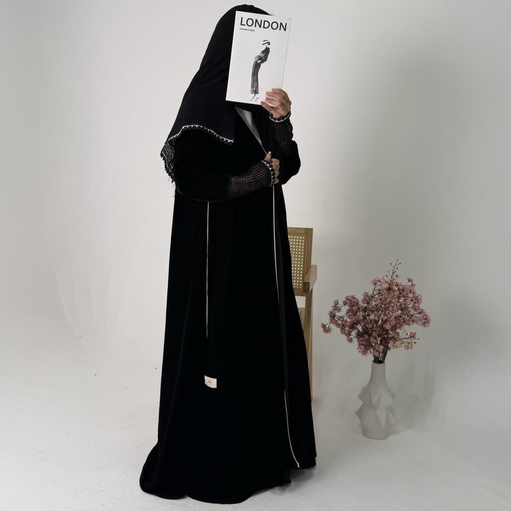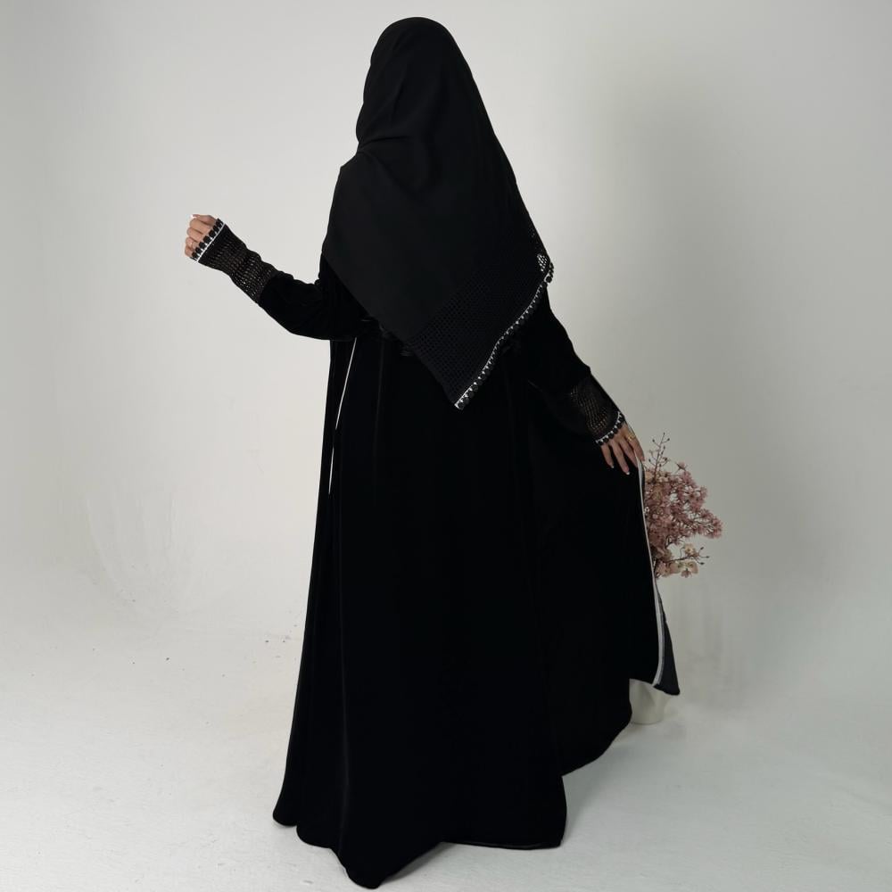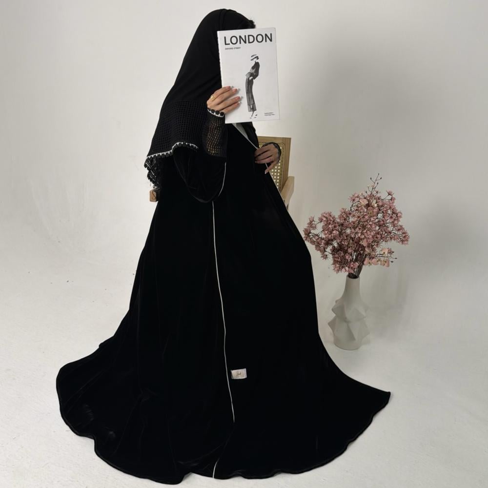 - مخمل كوري اسود | الكم كلفه شبك بطرف " غير مبطن" | الطرحه شيفون بطرف