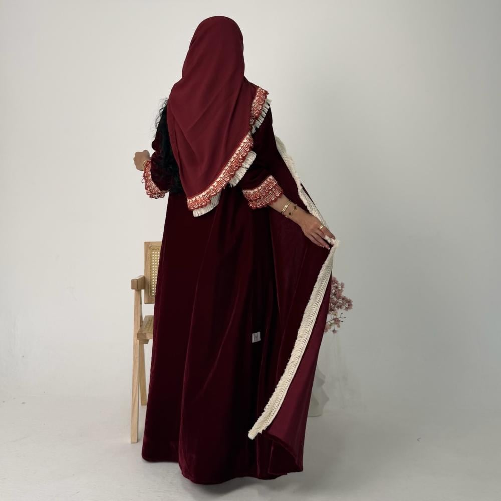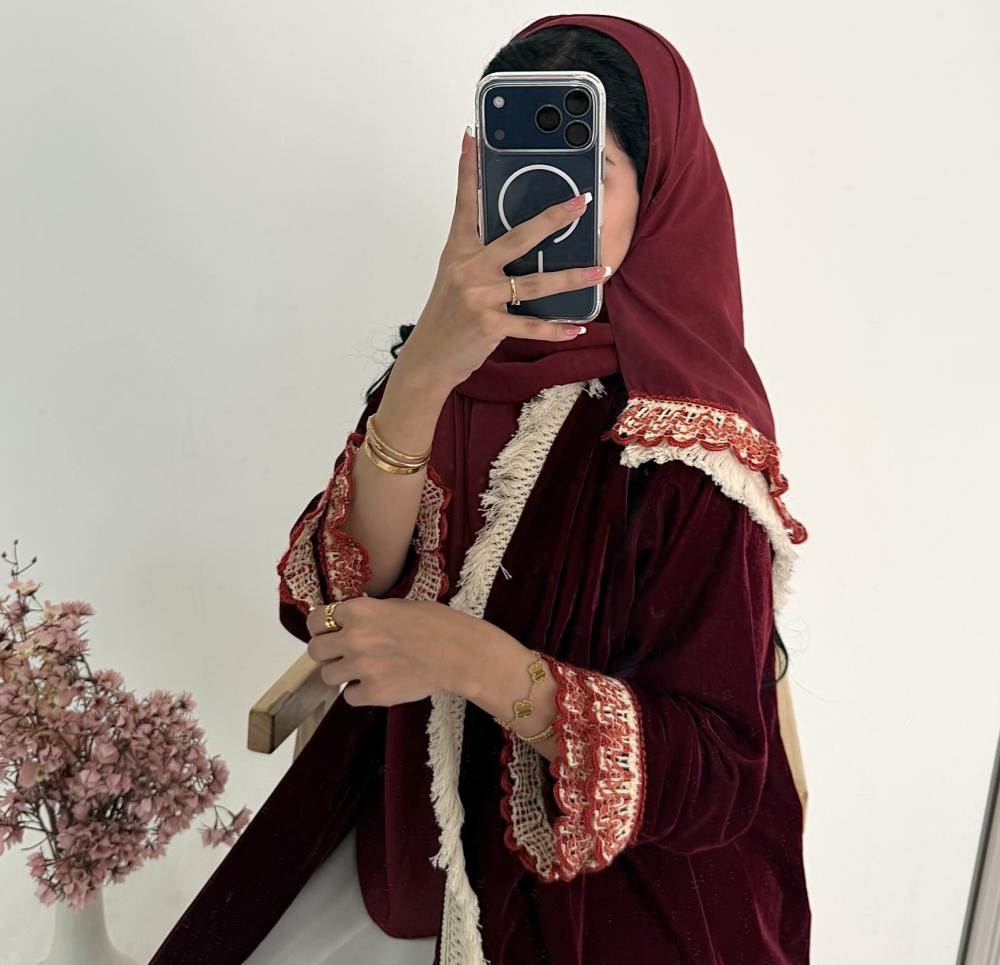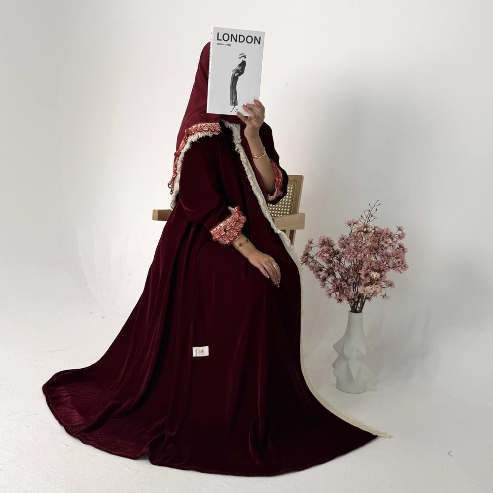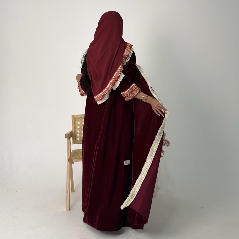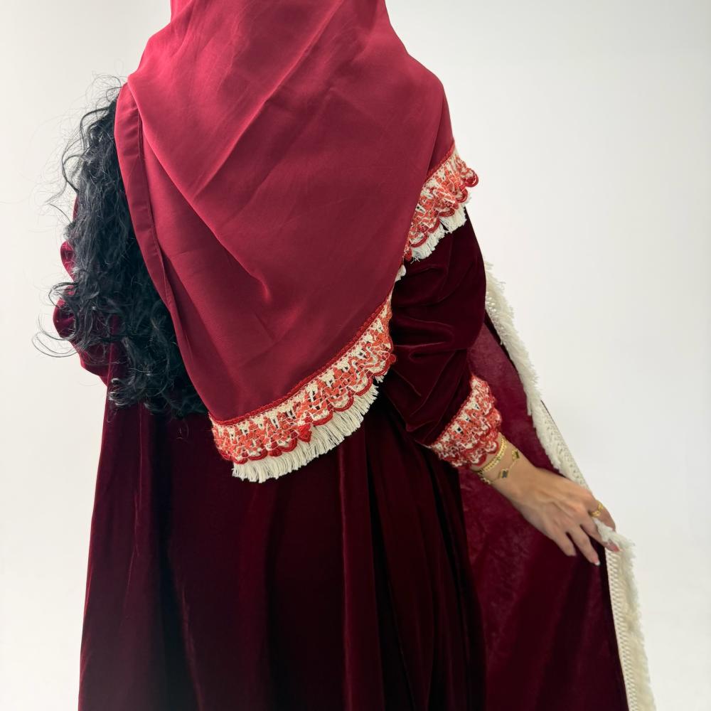 - مخمل كوري عنابي | الكم كلفه كروشيه | هدب بيج من الامام جهه واحده | الطرحه شيفون بطرف كلفه وهدب