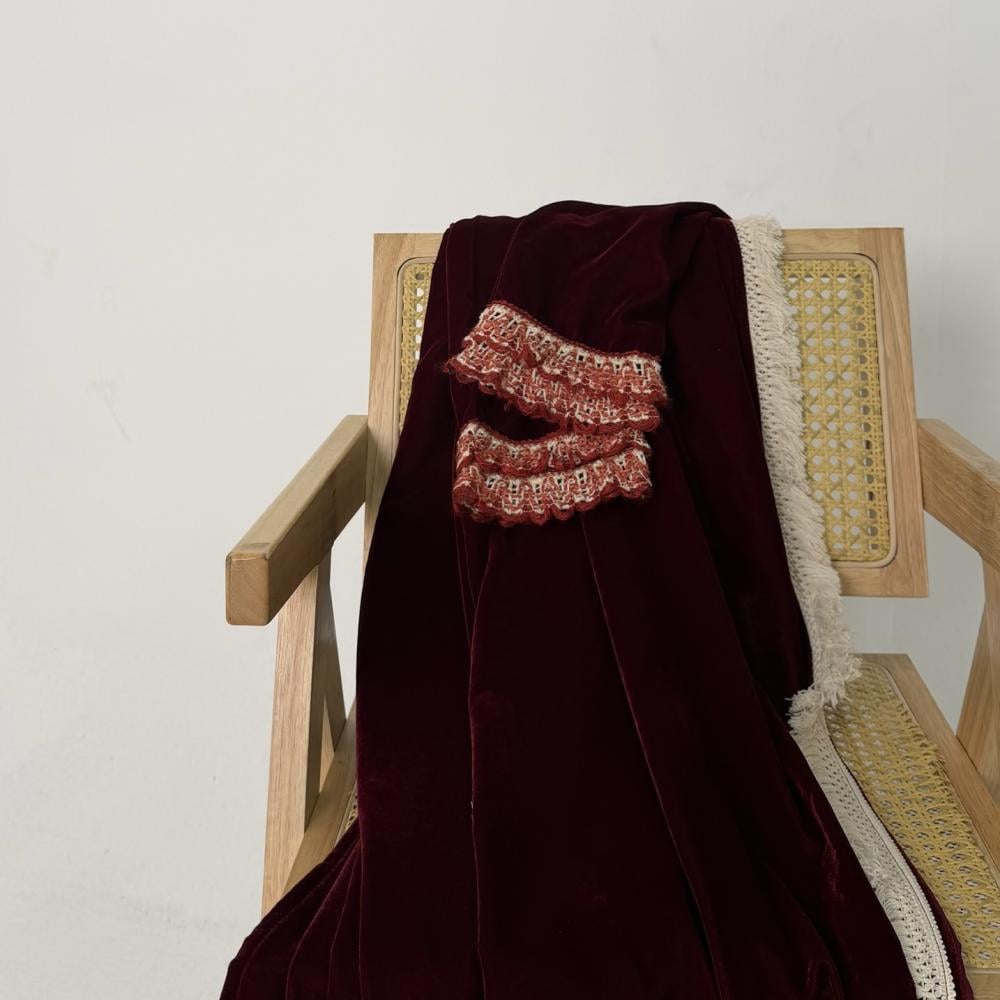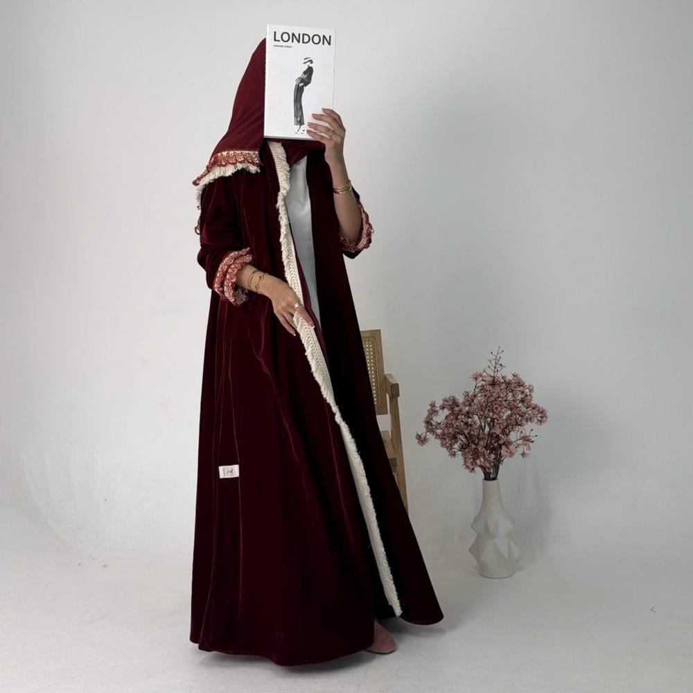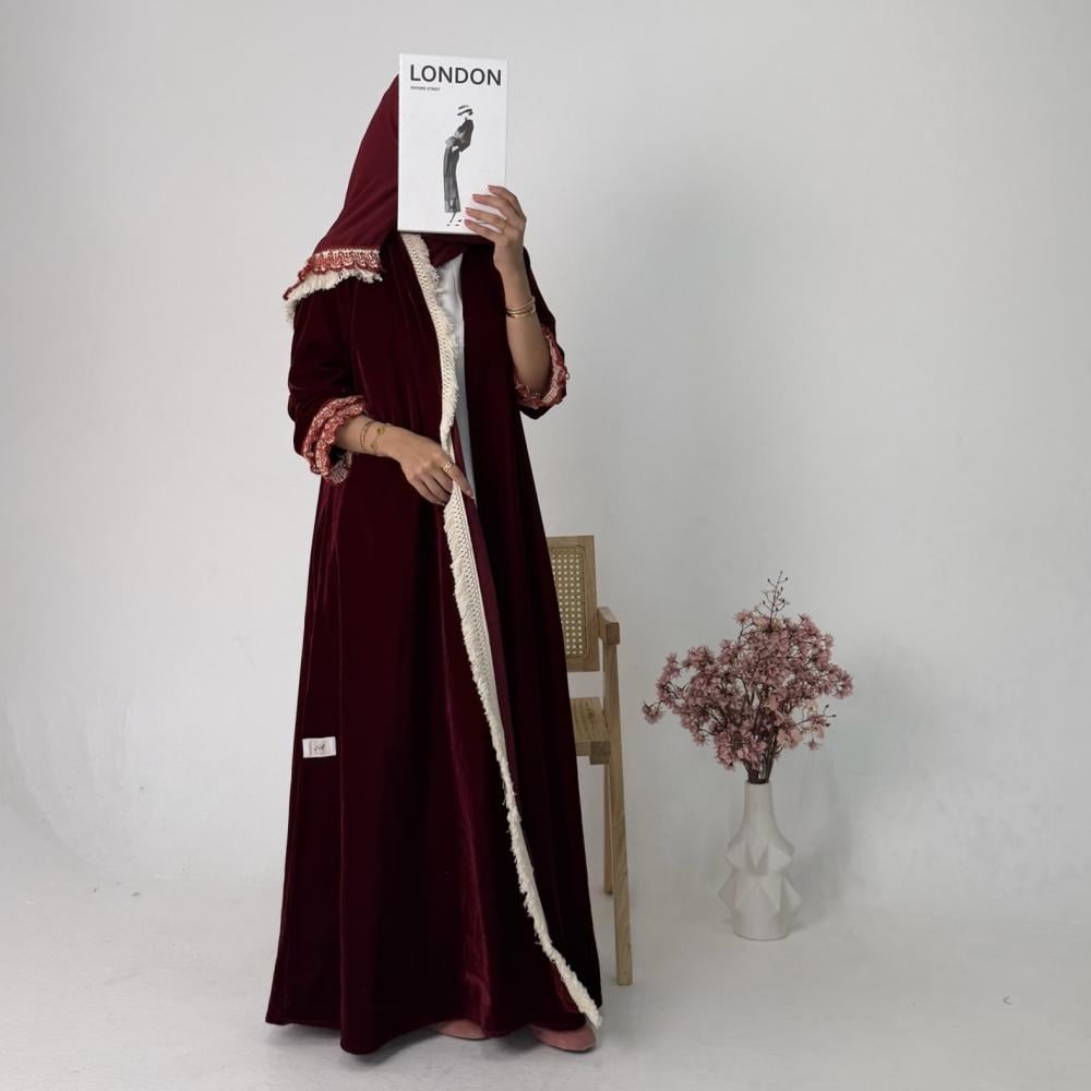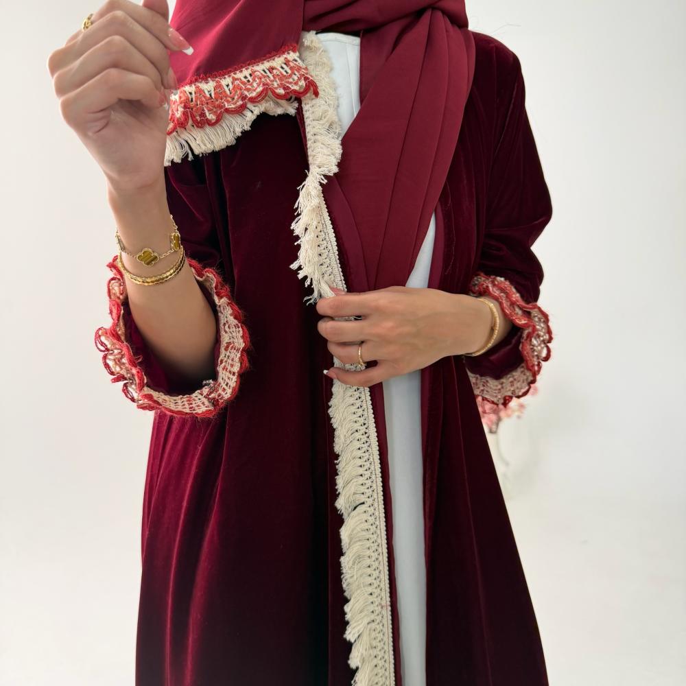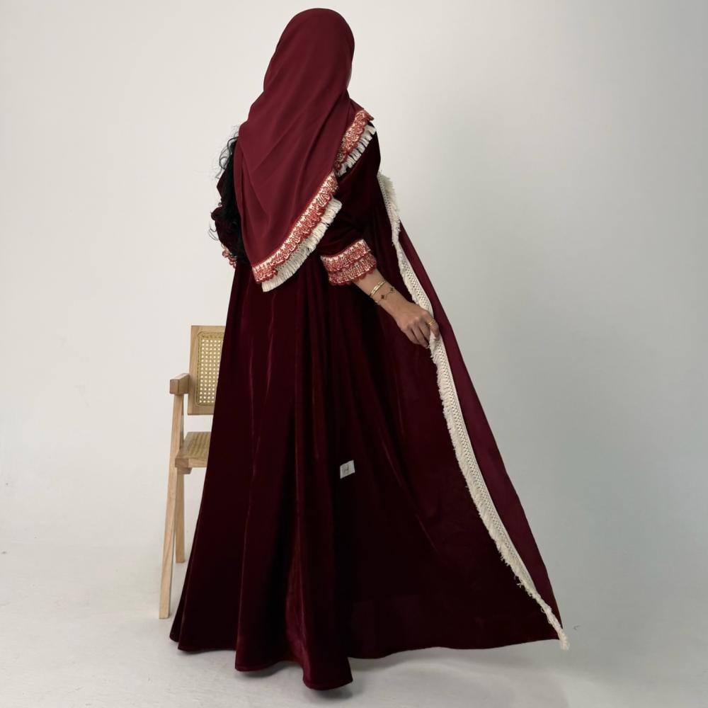 - مخمل كوري عنابي | الكم كلفه كروشيه | هدب بيج من الامام جهه واحده | الطرحه شيفون بطرف كلفه وهدب
