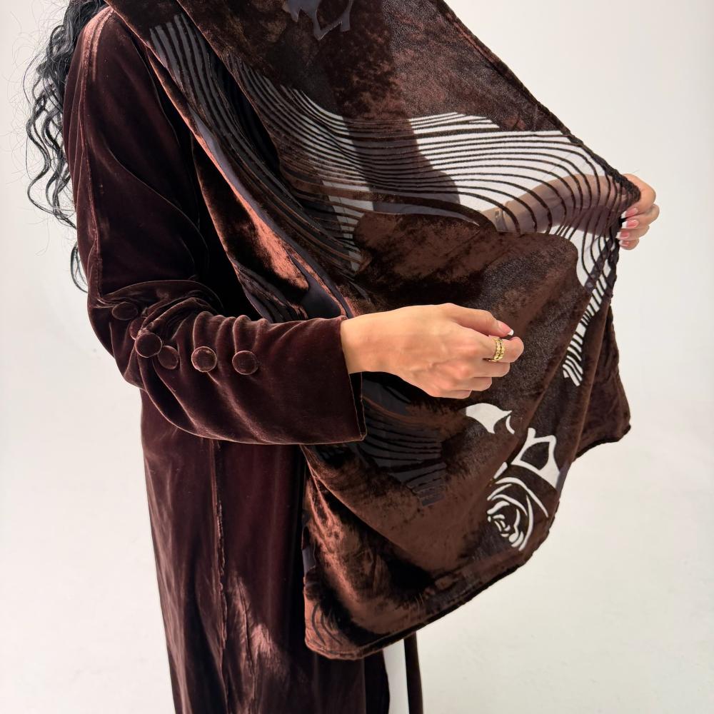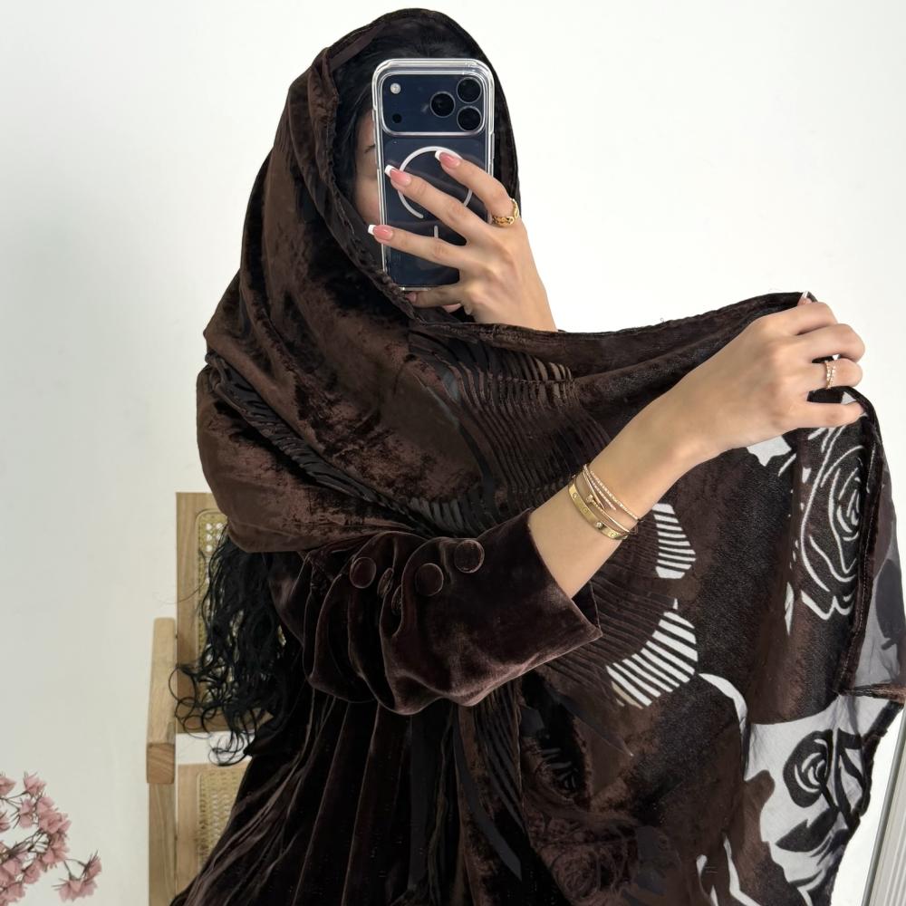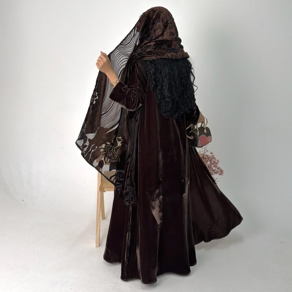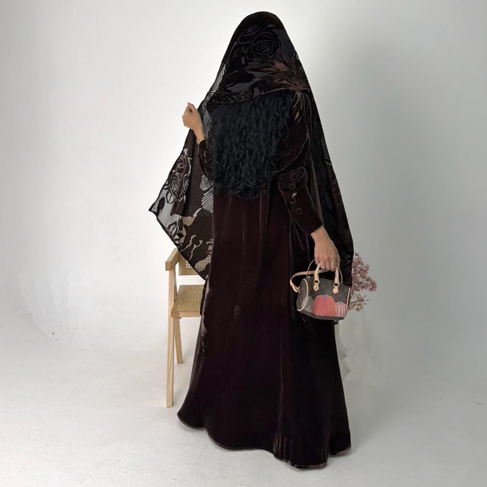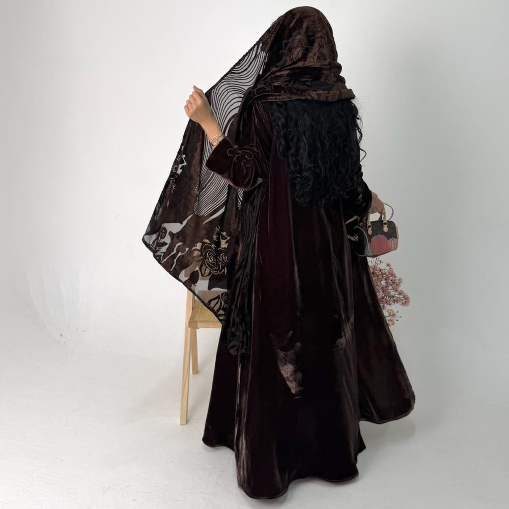 - مخمل كوري بني | الكم ازارير مخمل | الطرحه شيفون بمخمل