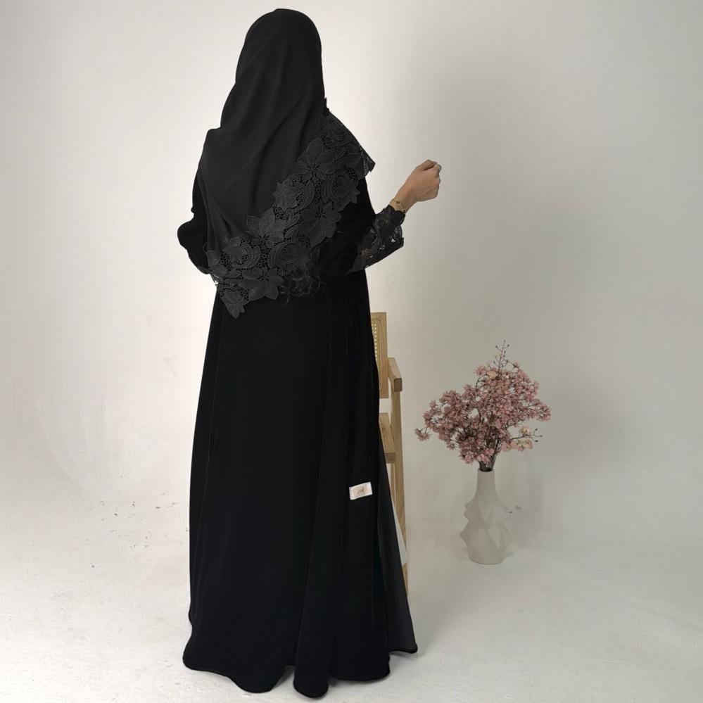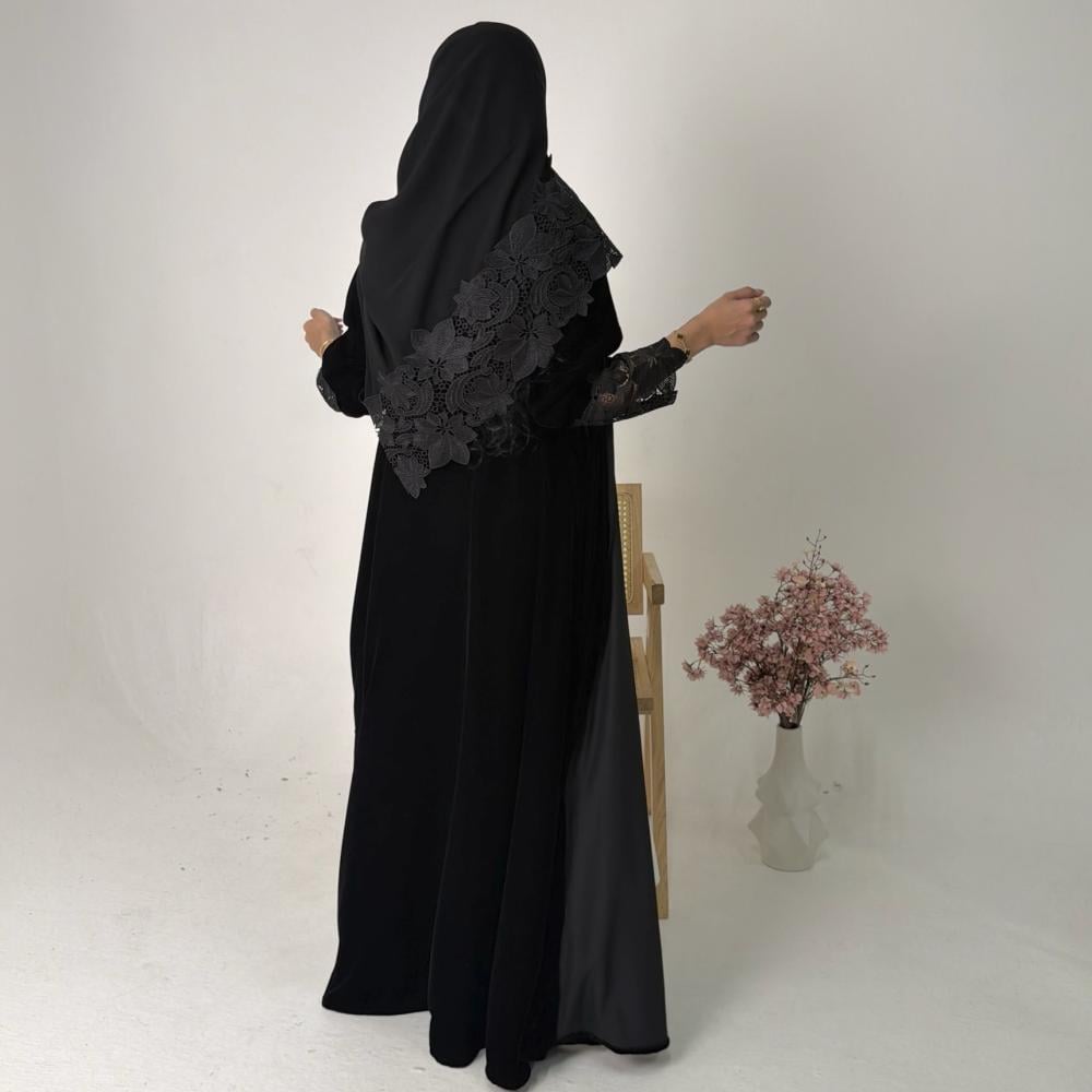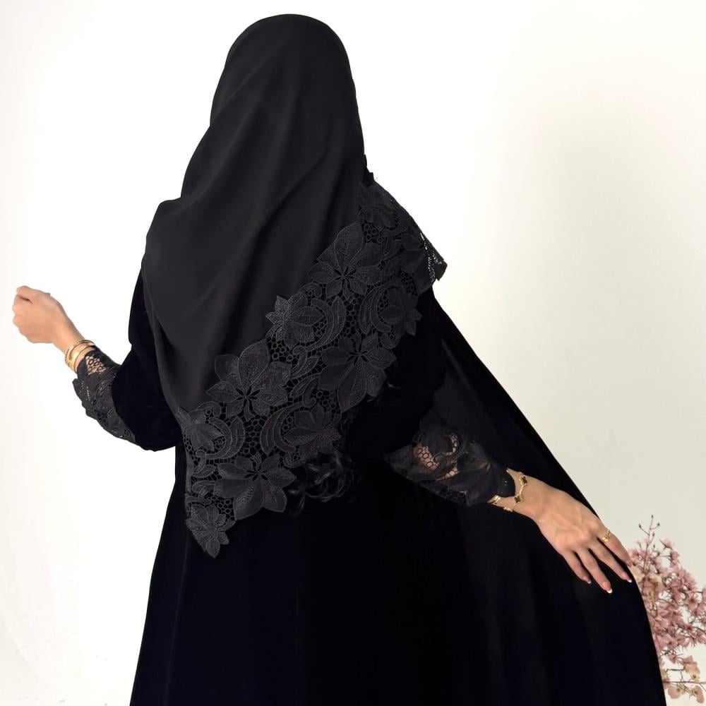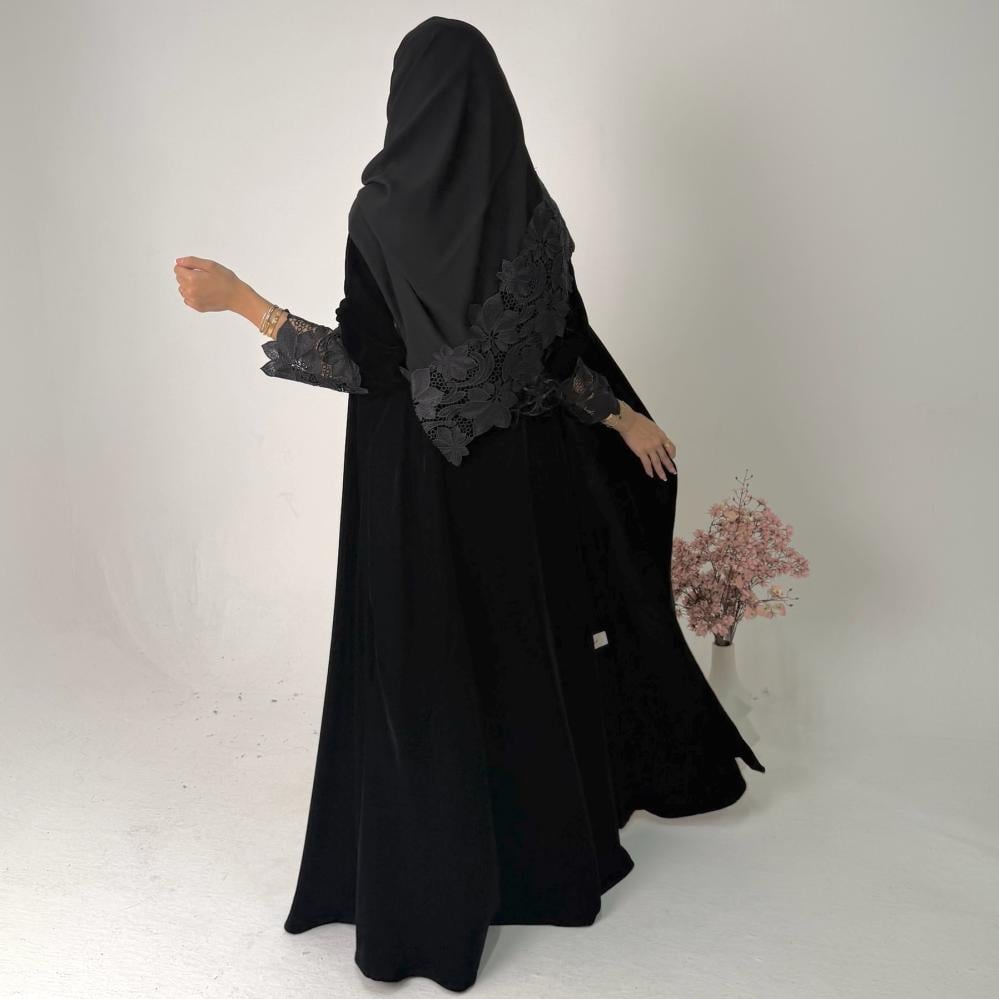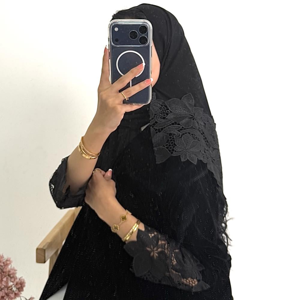 - مخمل كوري اسود | الكم كلفه " غير مبطن" | الطرحه شيفون بطرف كلفه مشجره