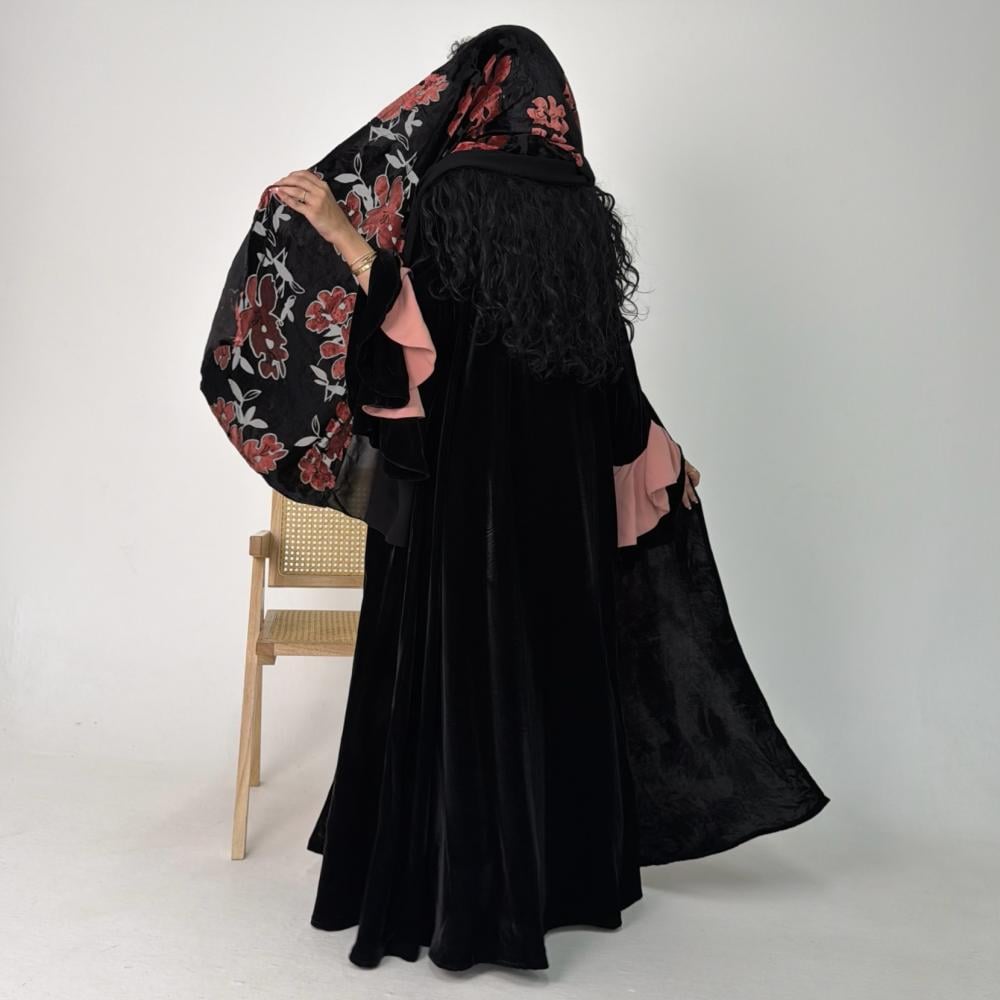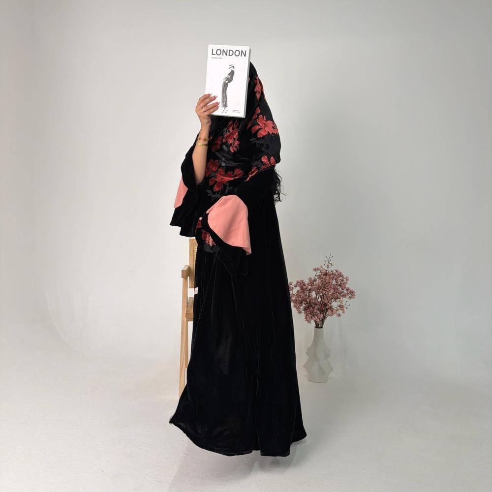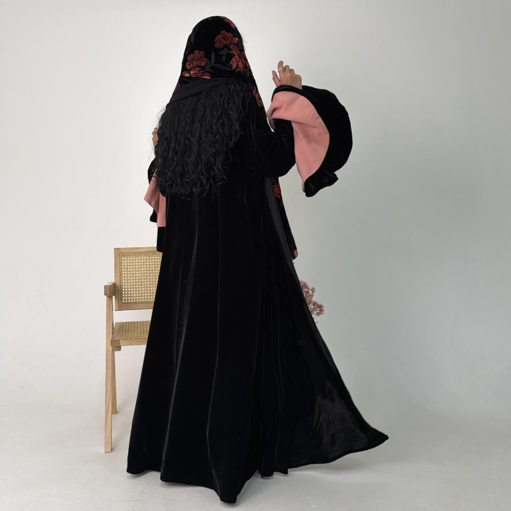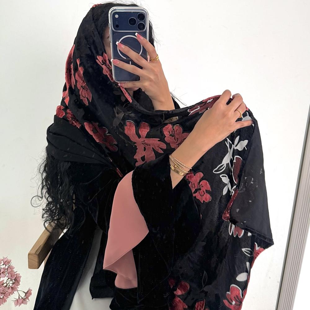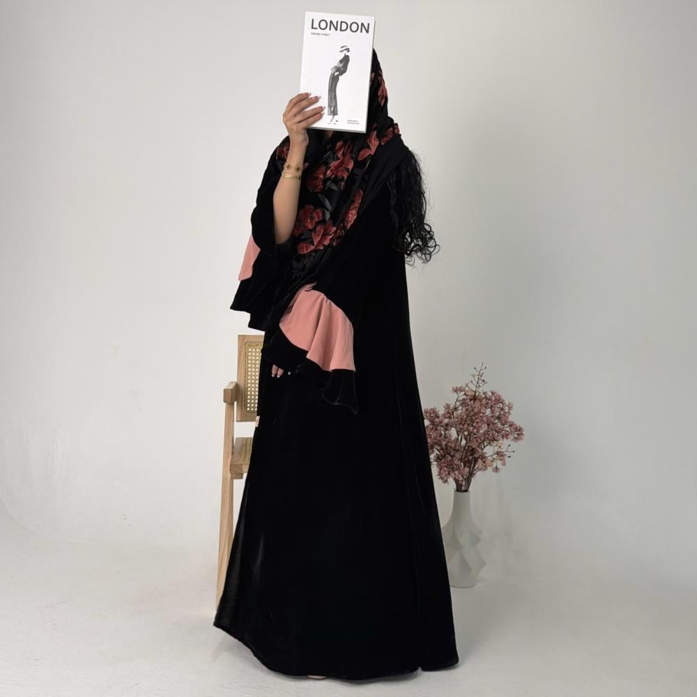- مخمل كوري اسود | الكم دائره واسعه بكريب وردي | الطرحه شيفون مشجر بمخمل