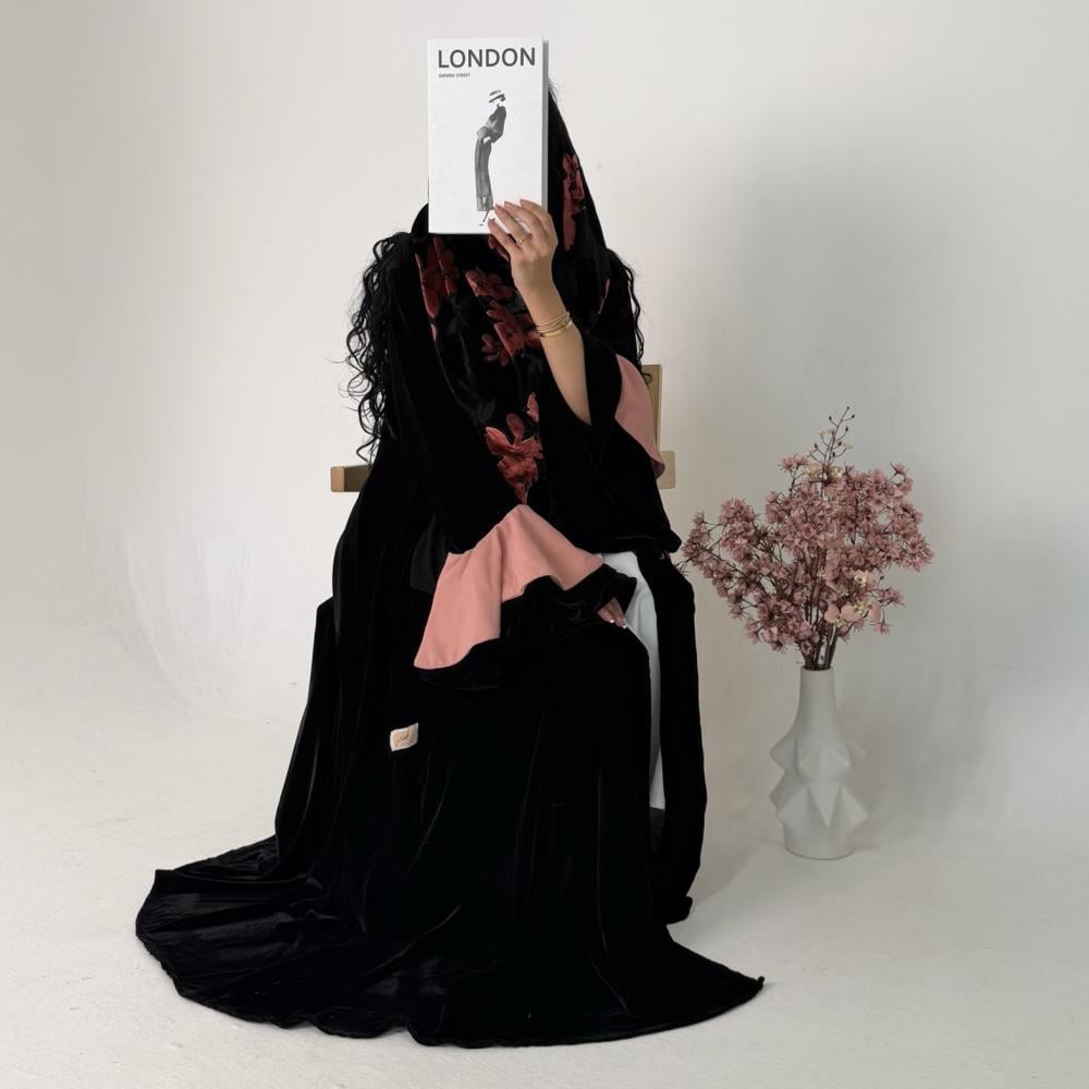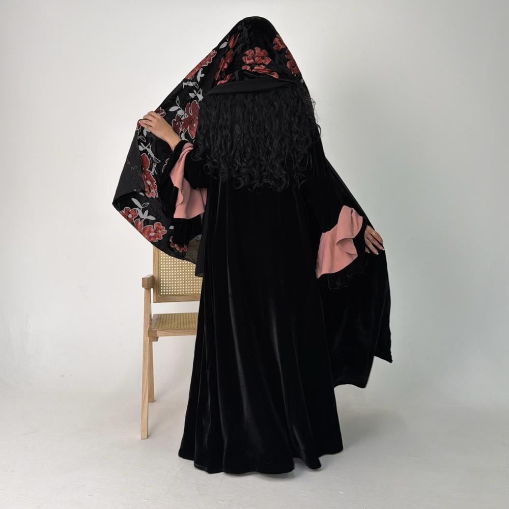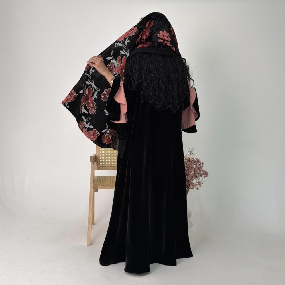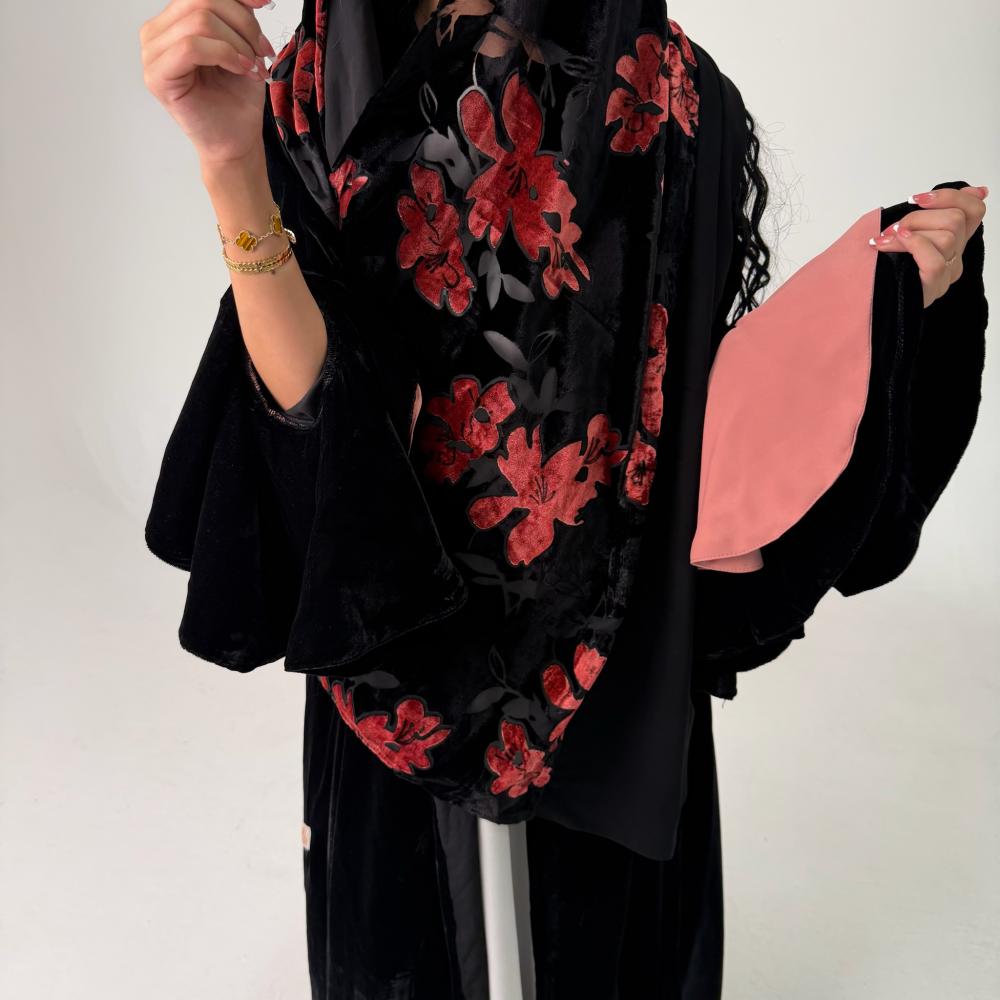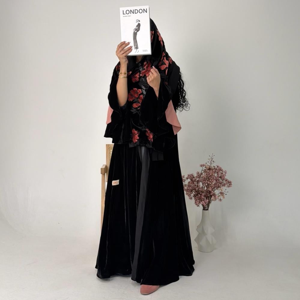 - مخمل كوري اسود | الكم دائره واسعه بكريب وردي | الطرحه شيفون مشجر بمخمل