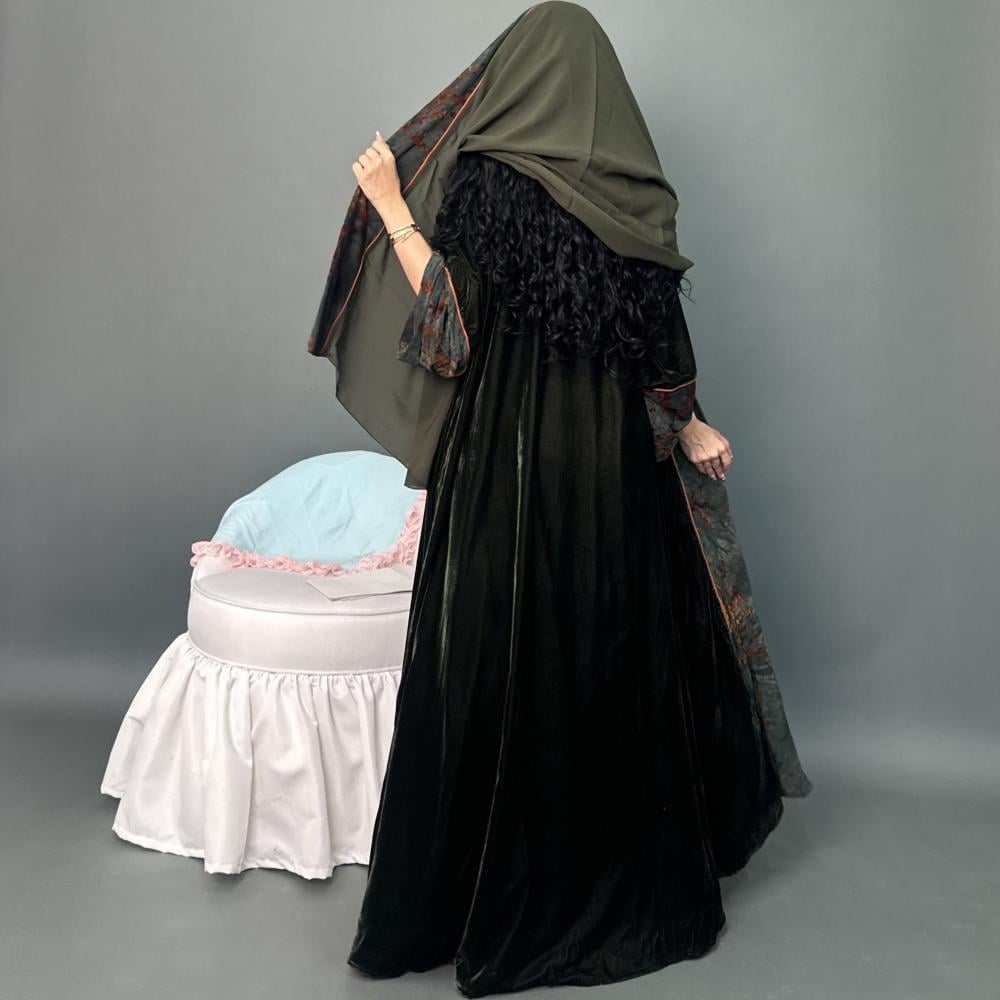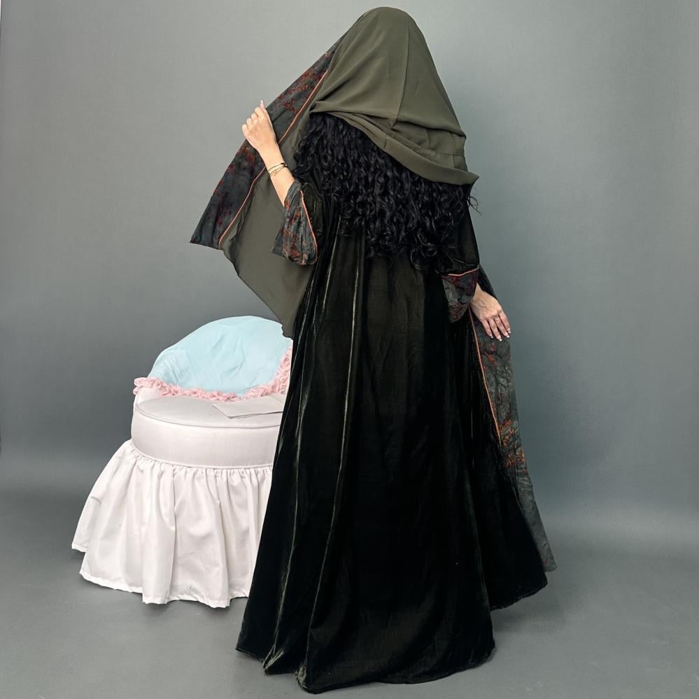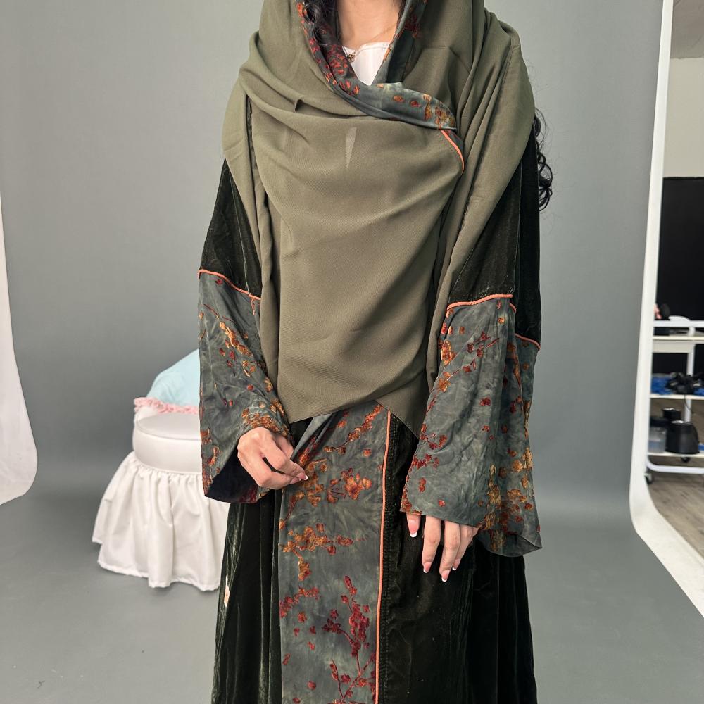 مخمل كوري زيتي | الكم ومن الامام ستريتش مشجر بمخمل | قيطان اورنج | الطرحه شيفون بقماش ستريتش مشجر وقيطان