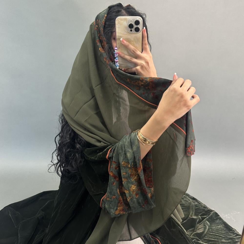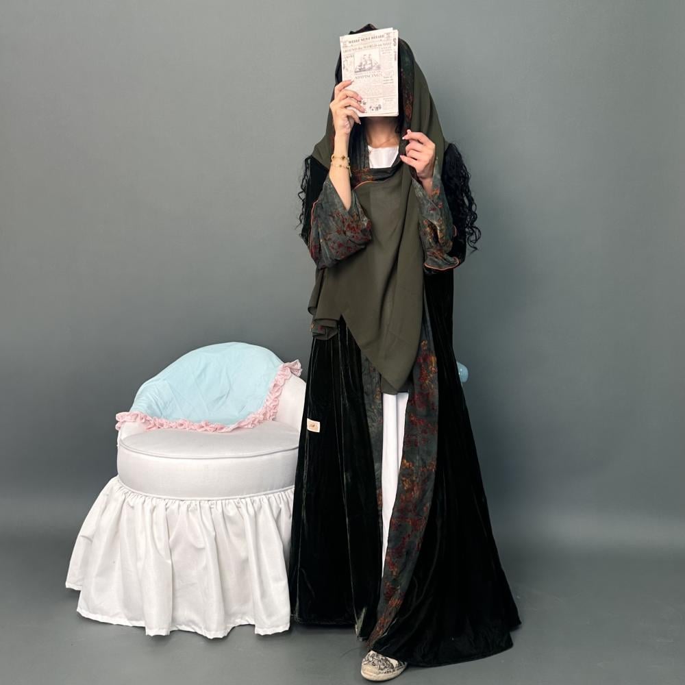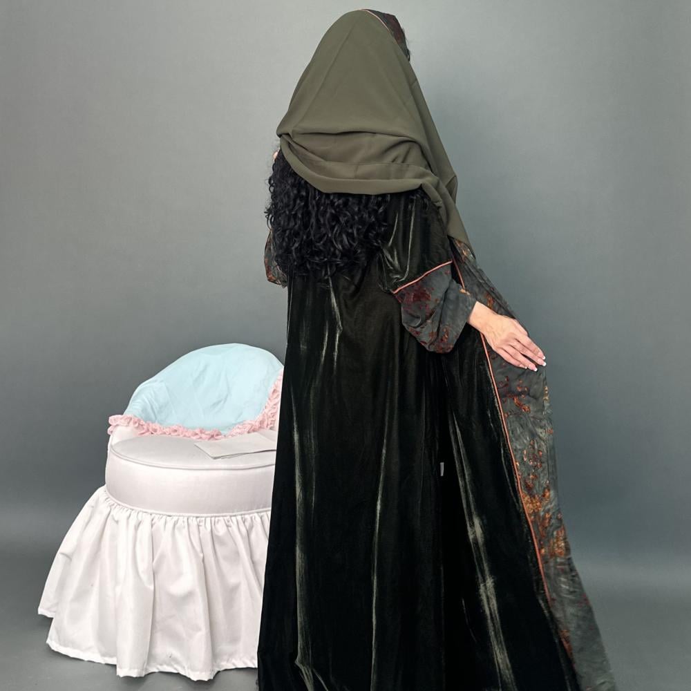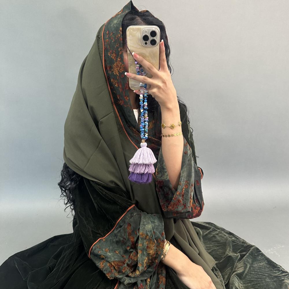 مخمل كوري زيتي | الكم ومن الامام ستريتش مشجر بمخمل | قيطان اورنج | الطرحه شيفون بقماش ستريتش مشجر وقيطان